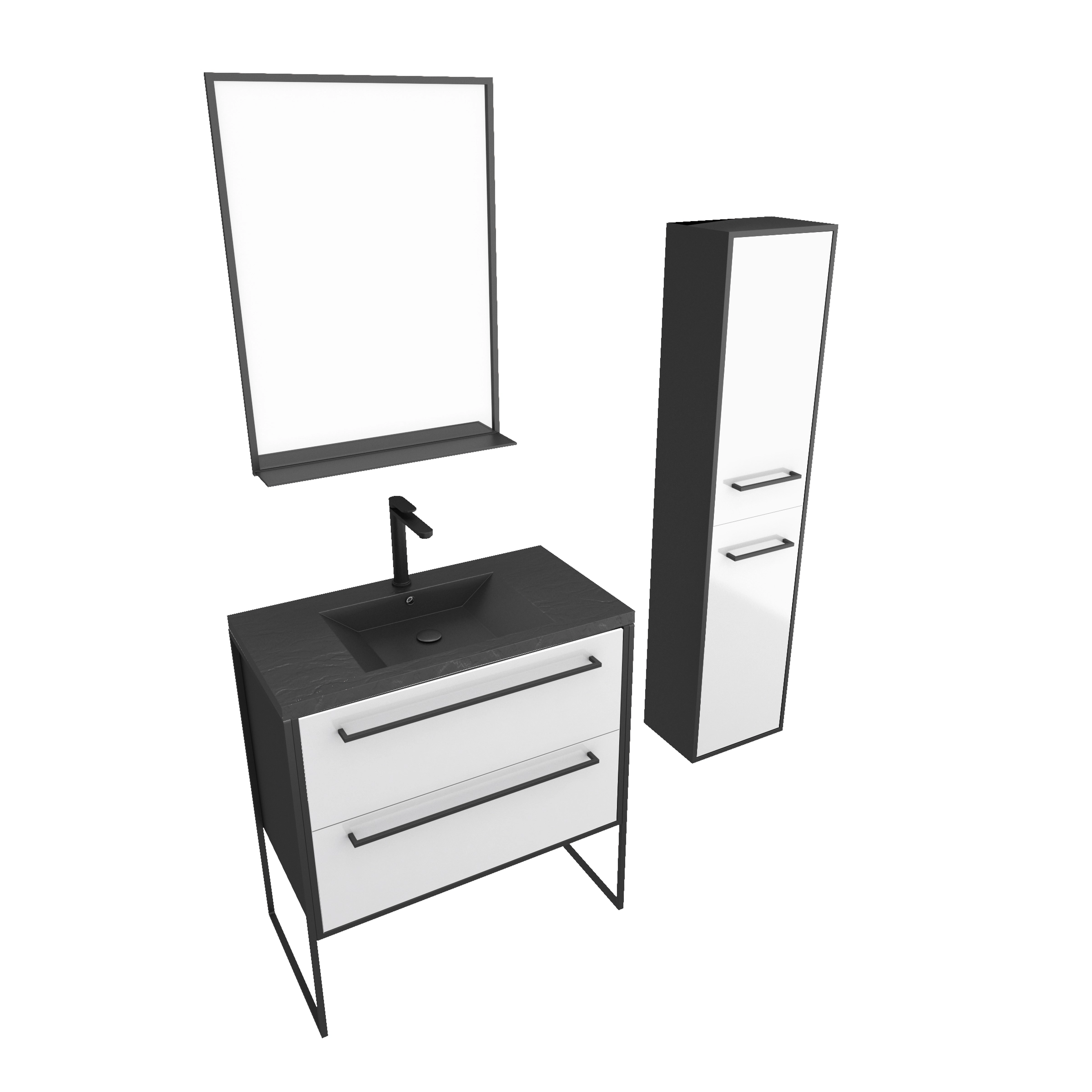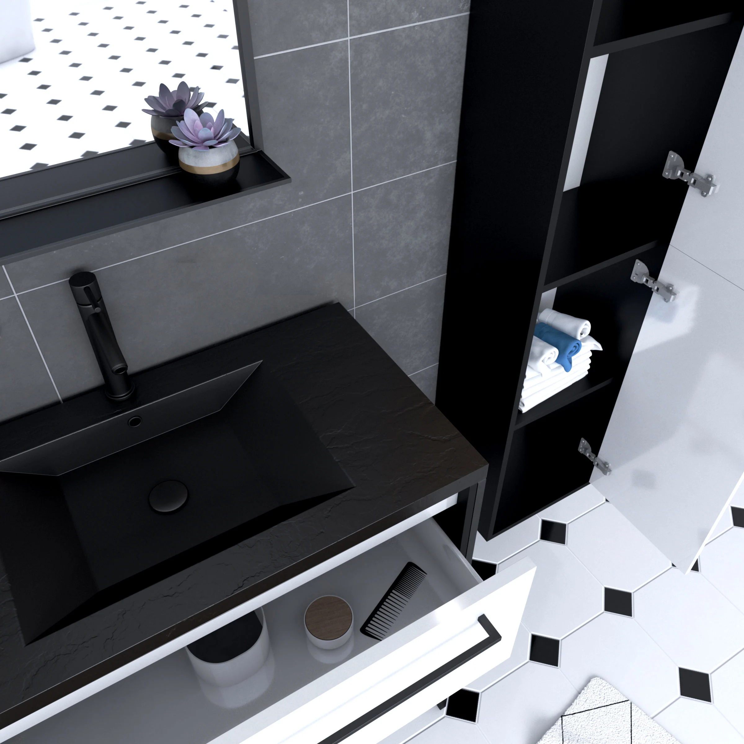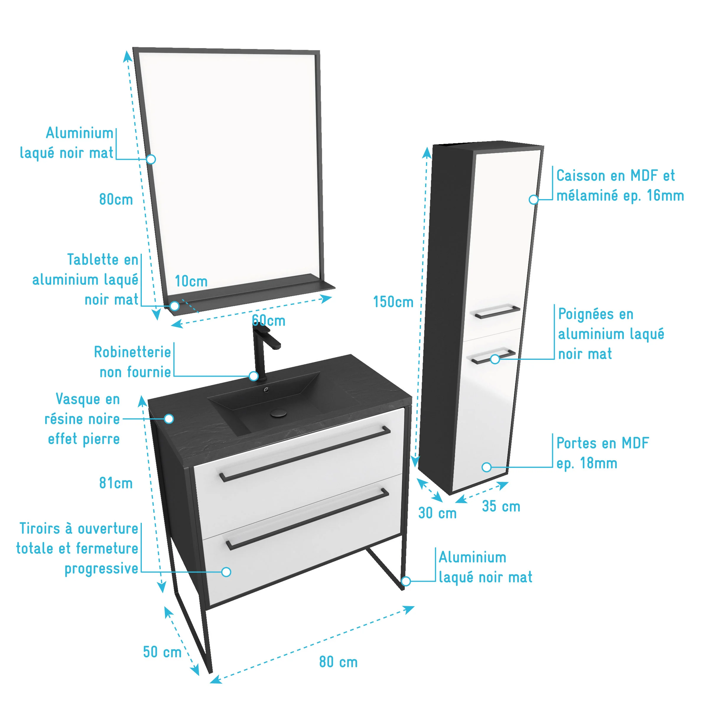 Pack meuble de salle de bain 80×50 cm – 2 tiroirs blanc – vasque noir – miroir – colonne suspendu