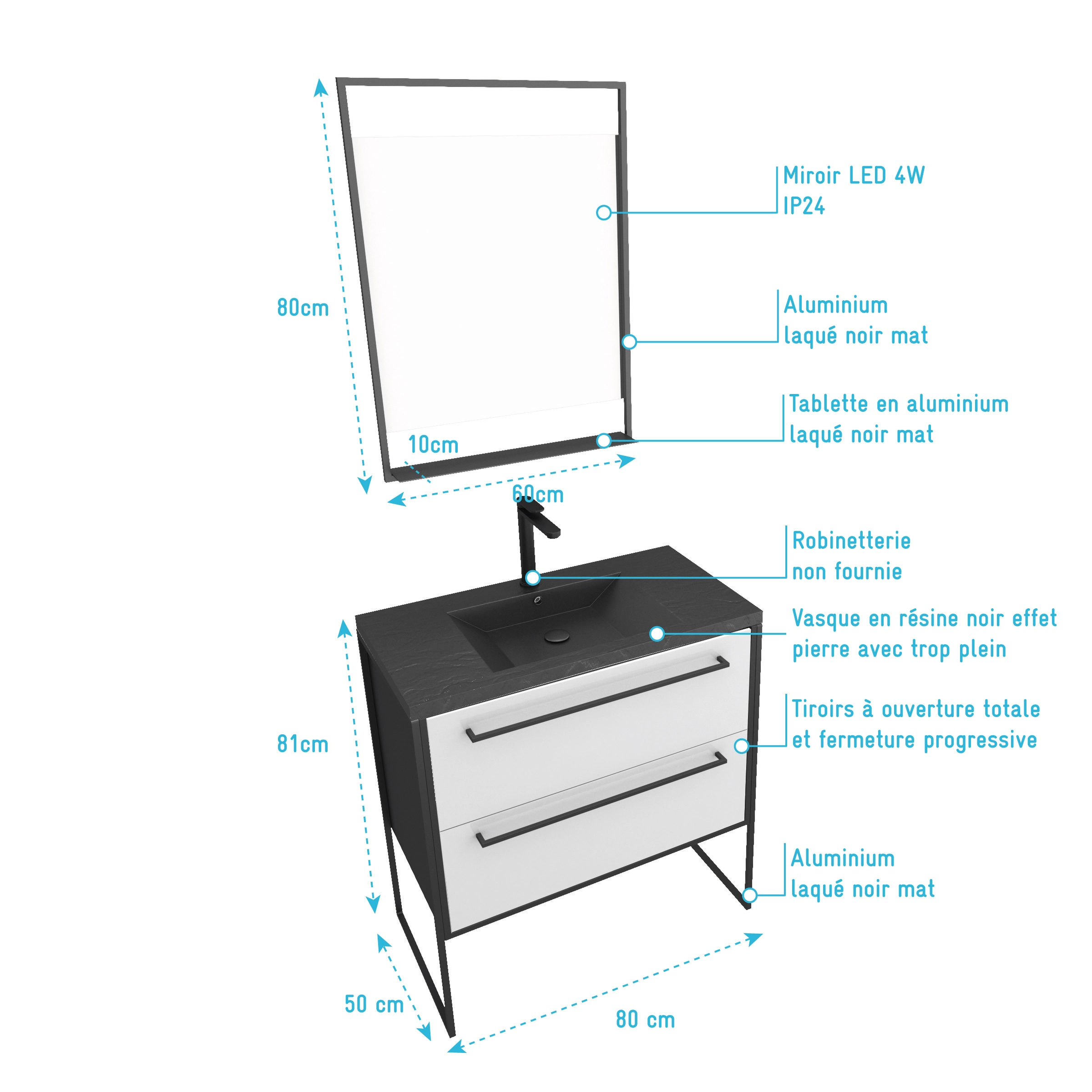 Pack Meuble de salle de bain 80×50 cm – 2 tiroirs – vasque résine noire effet pierre + miroir LED