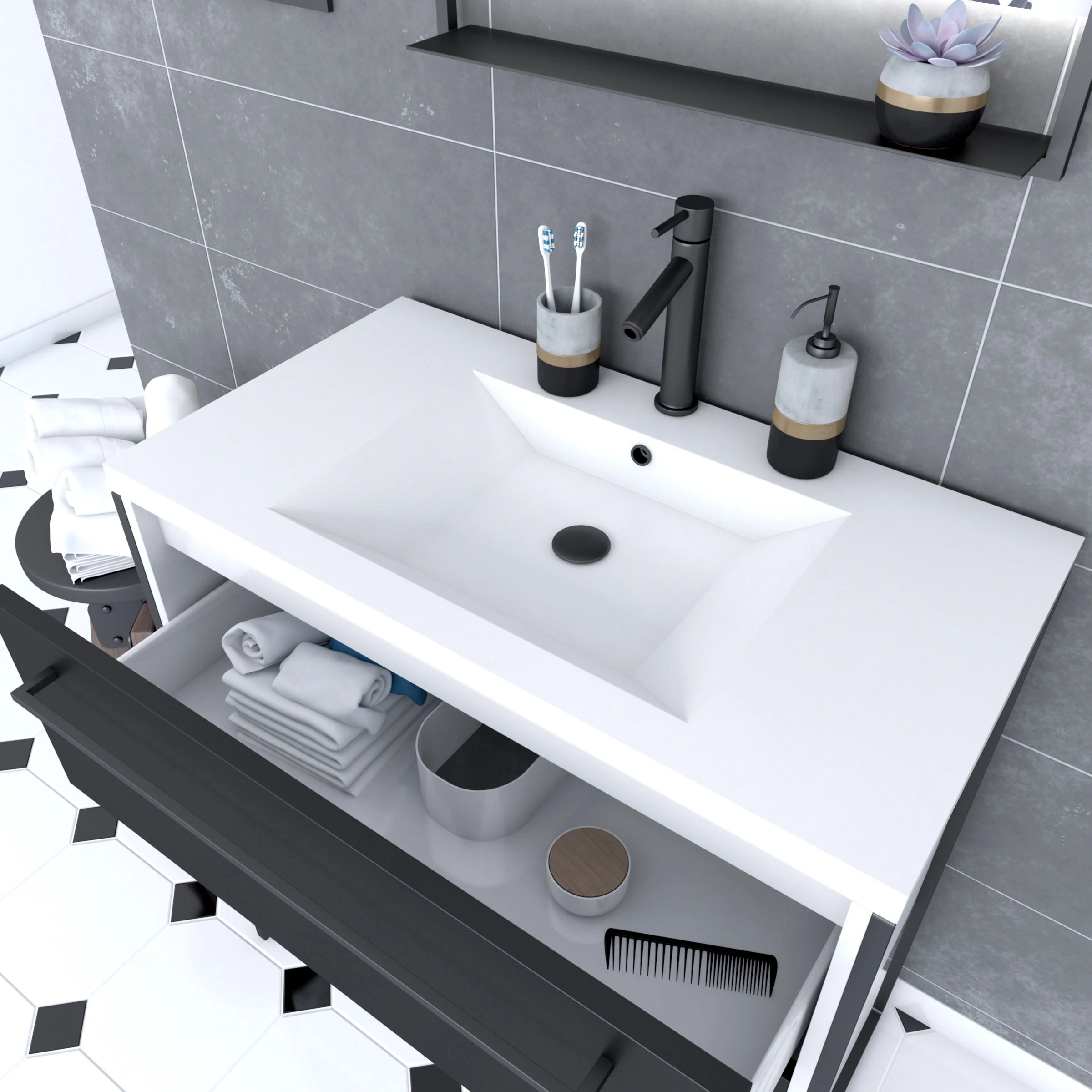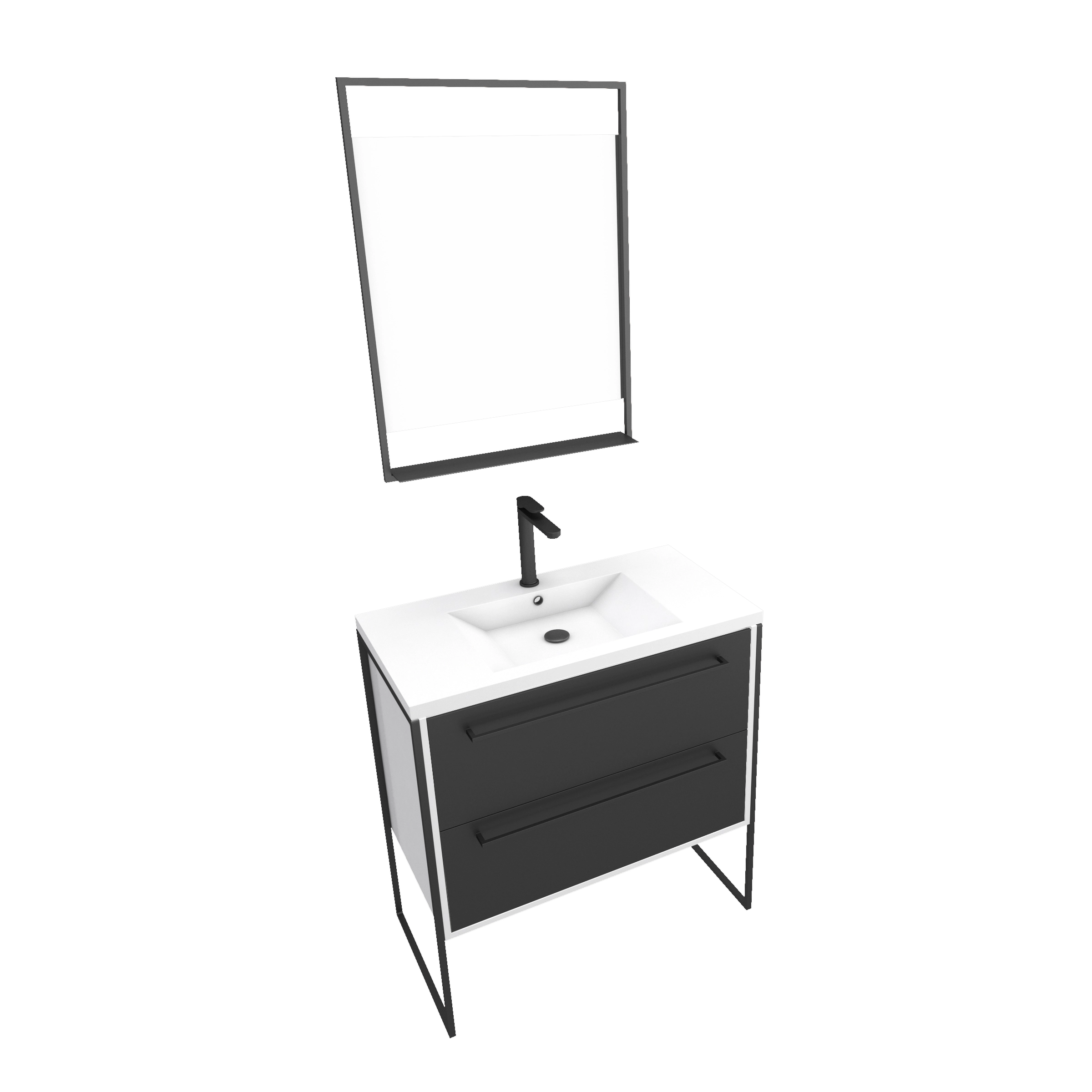 Meuble de salle de bain blanc comprenant une vasque blanche et 2 tiroirs noir mat + un miroir LED 4W. Caractéristiques du meuble :