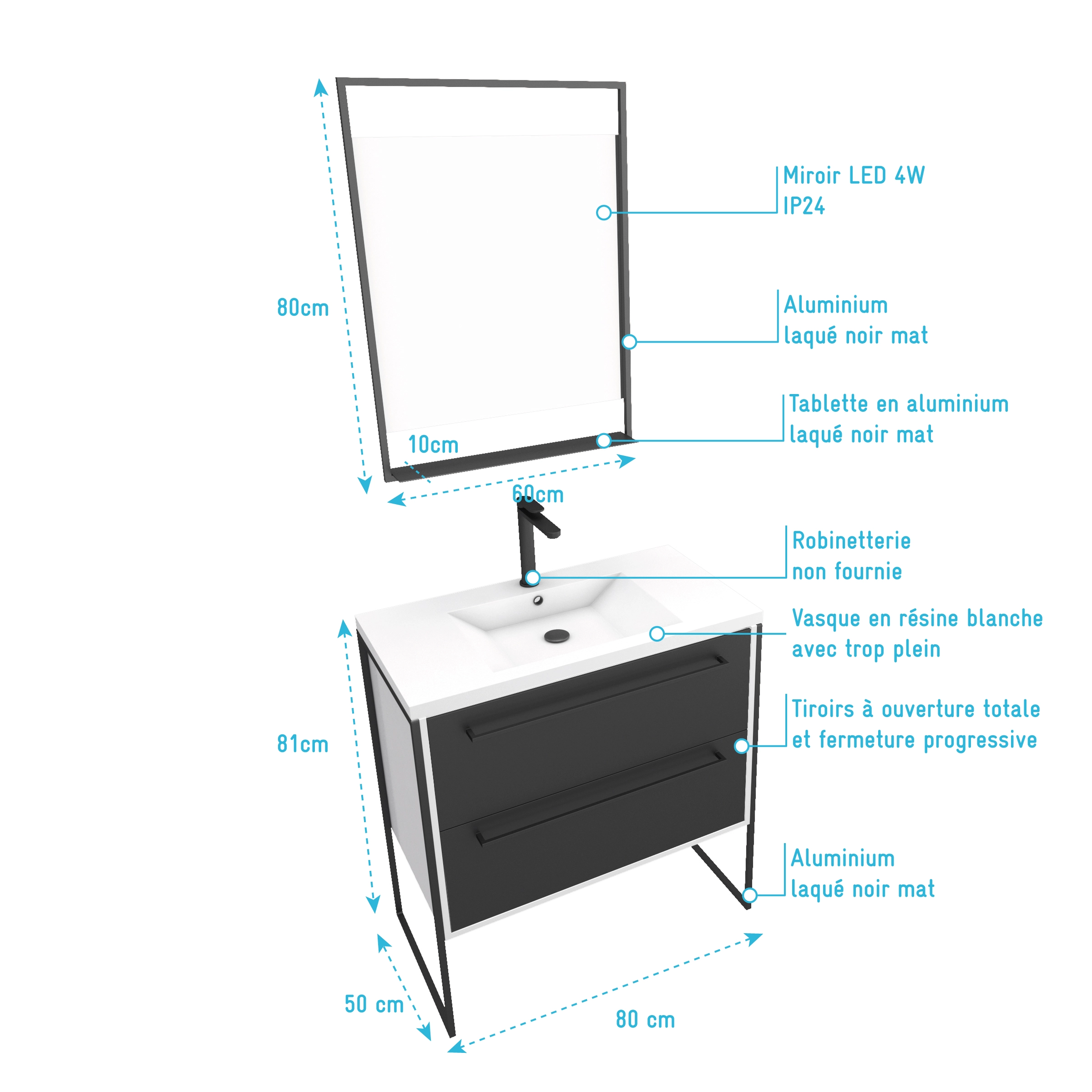 2 avis pour Pack meuble de salle de bain 80×50 cm Blanc – 2 tiroirs – vasque resine blanche – miroir LED
