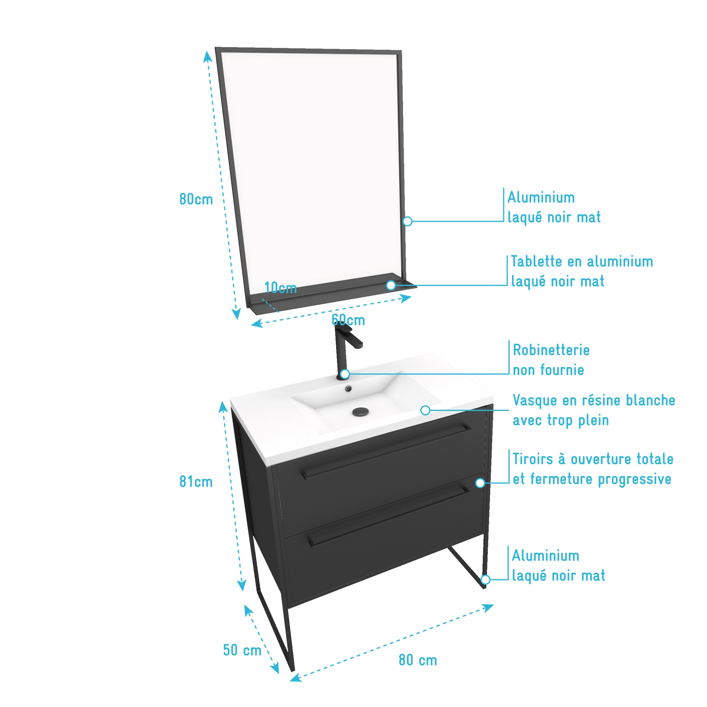 Pack Meuble de salle de bain 80×50 cm NOIR MAT – 2 tiroirs Noir mat – vasque blanche + miroir