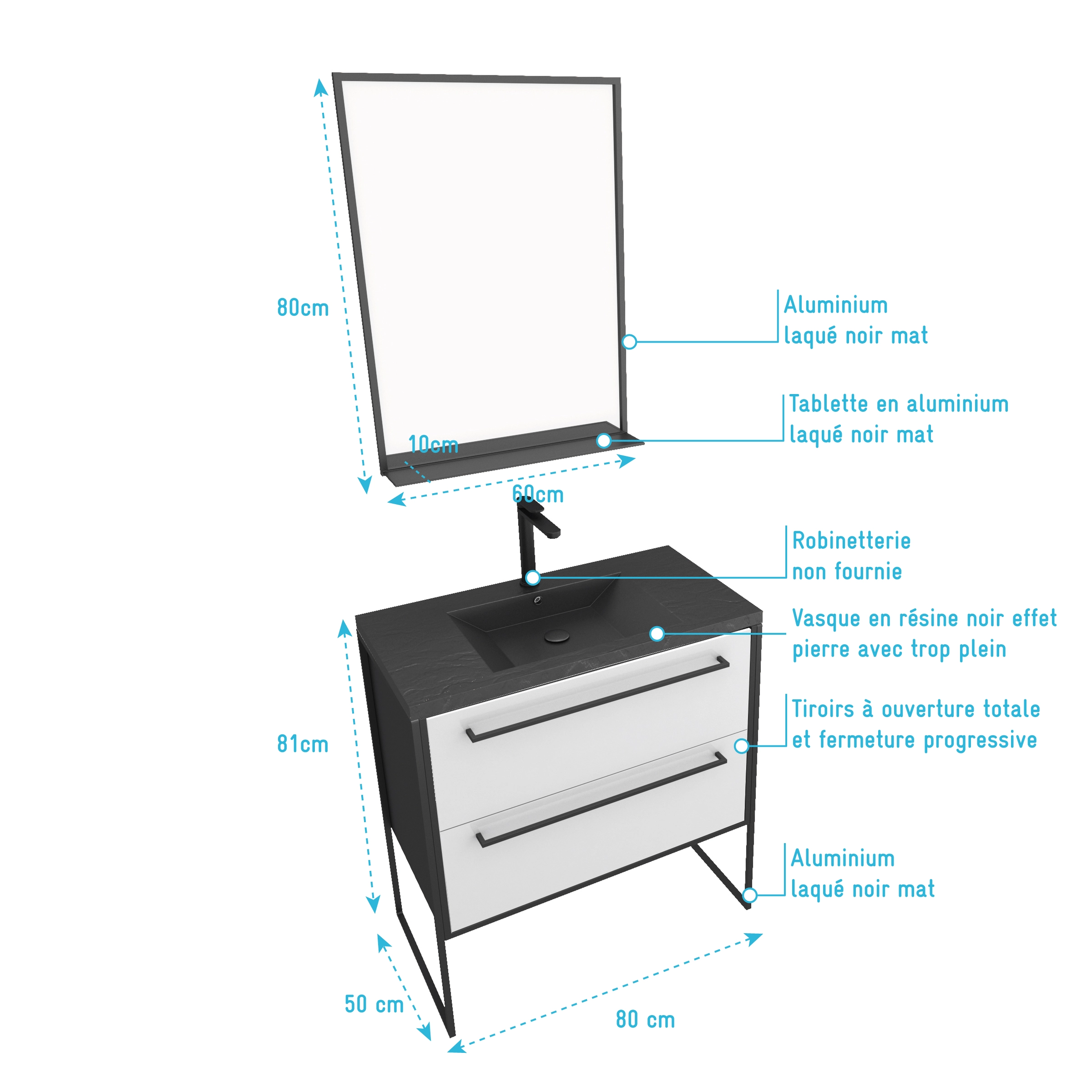 Pack Meuble de salle de bain 80x50cm – 2 tiroirs BLANC – vasque résine noire effet pierre – miroir