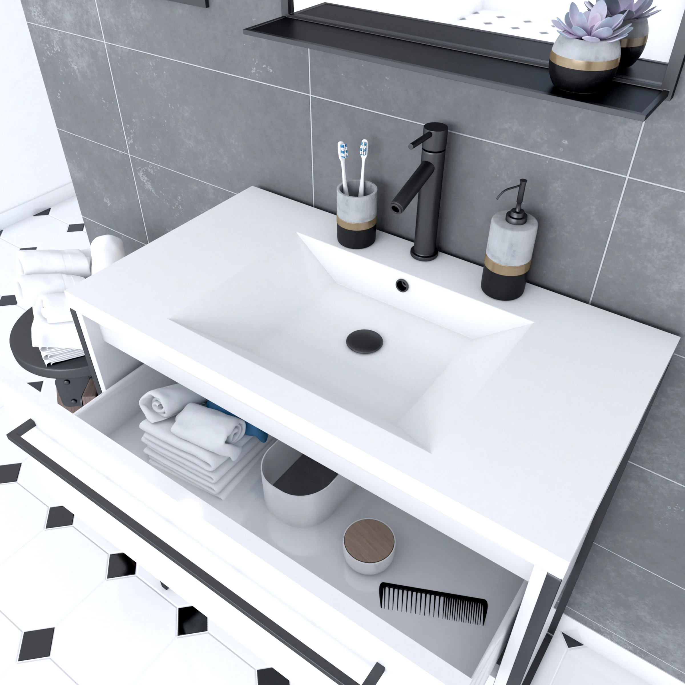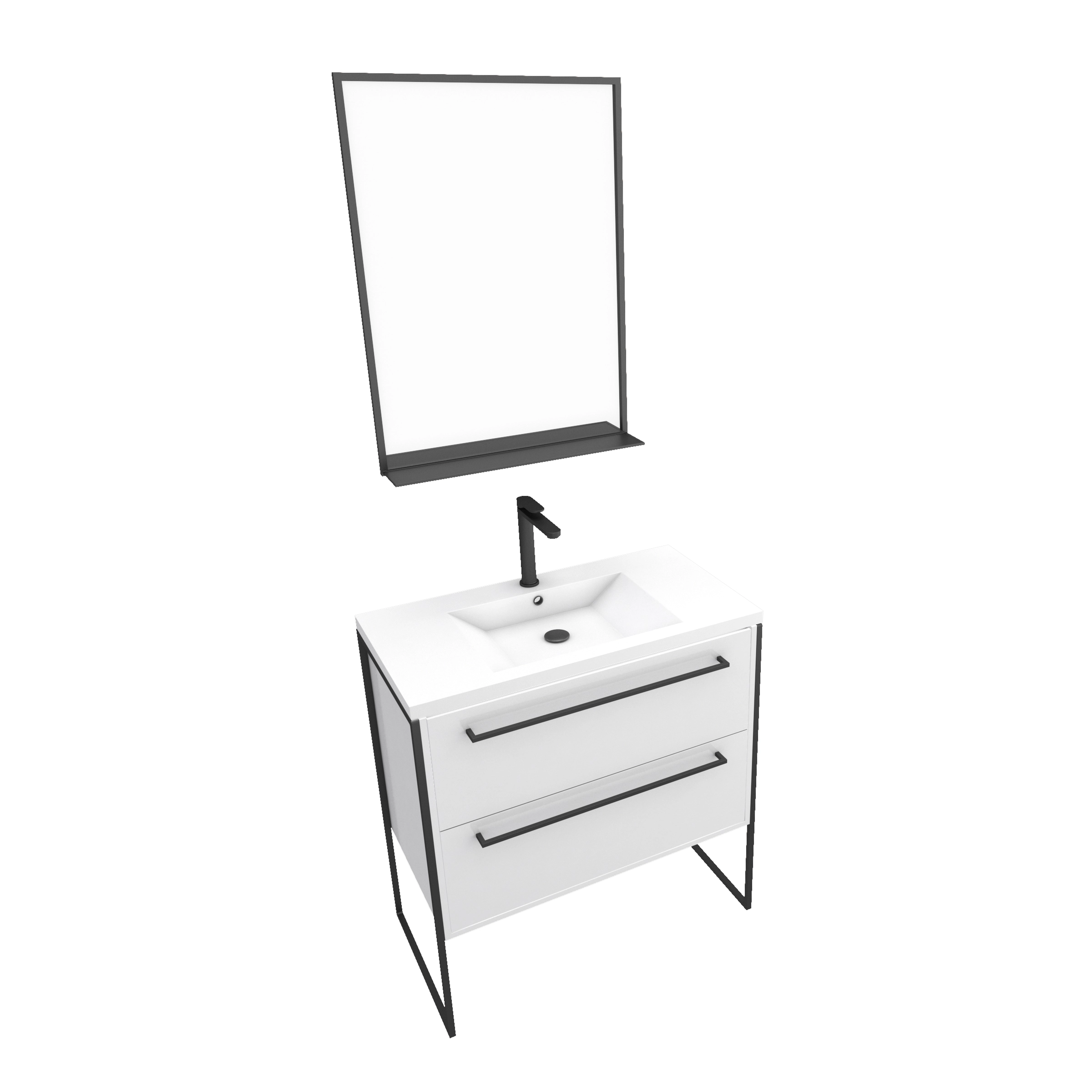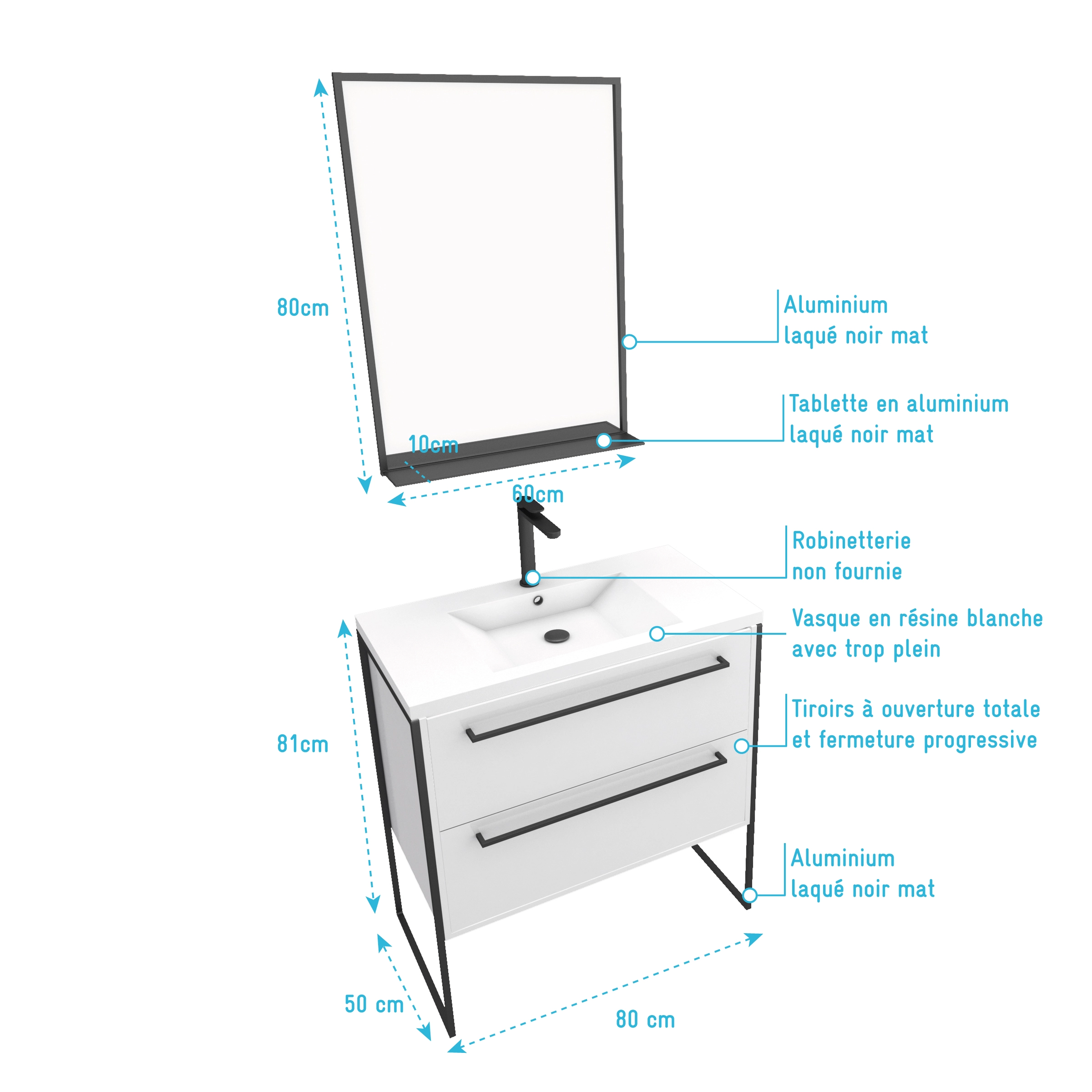 Pack meuble de salle de bain 80x50cm Blanc – 2 tiroirs blanc – vasque blanche + miroir noir mat
