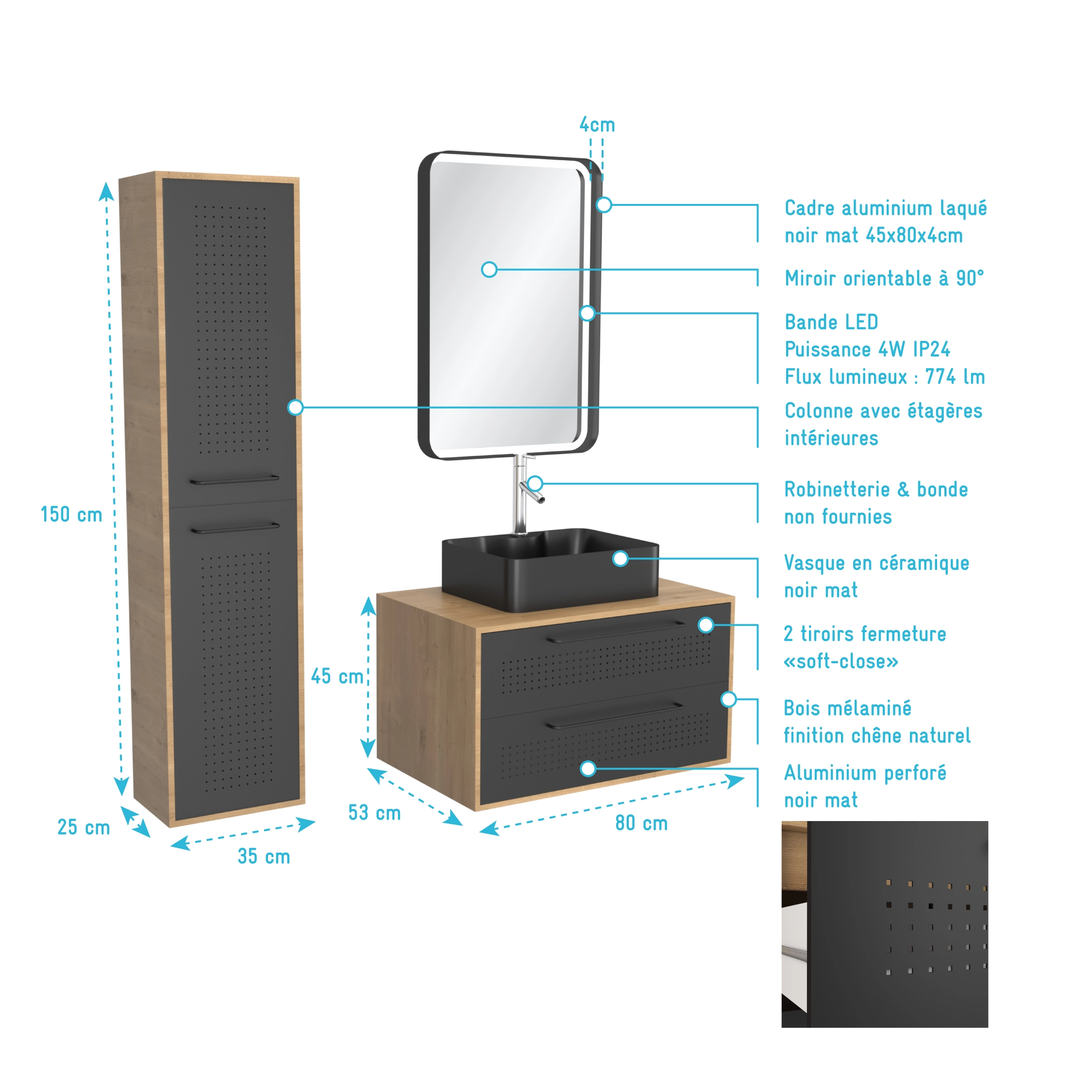 Meuble Salle de Bains 80 cm, Vasque Rectangle, Miroir Led et Colonne – Chêne naturel et Noir – UBY