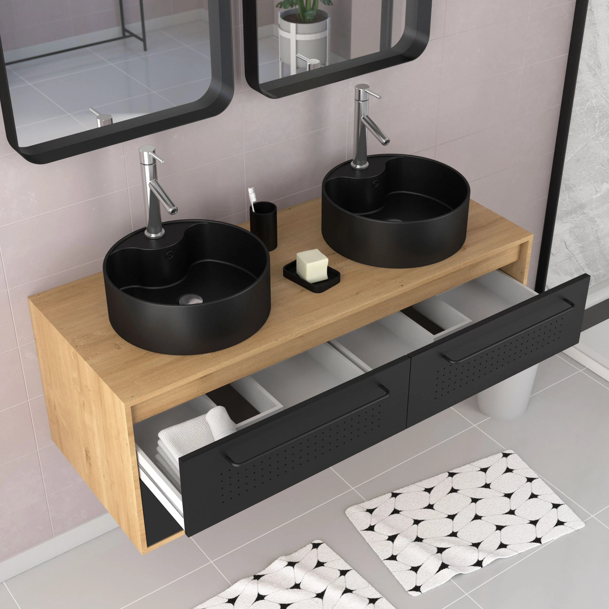 Meuble de Salle de Bains 120 cm – 2 Vasques Rondes et Colonne – Chêne naturel et Noir Mat – UBY