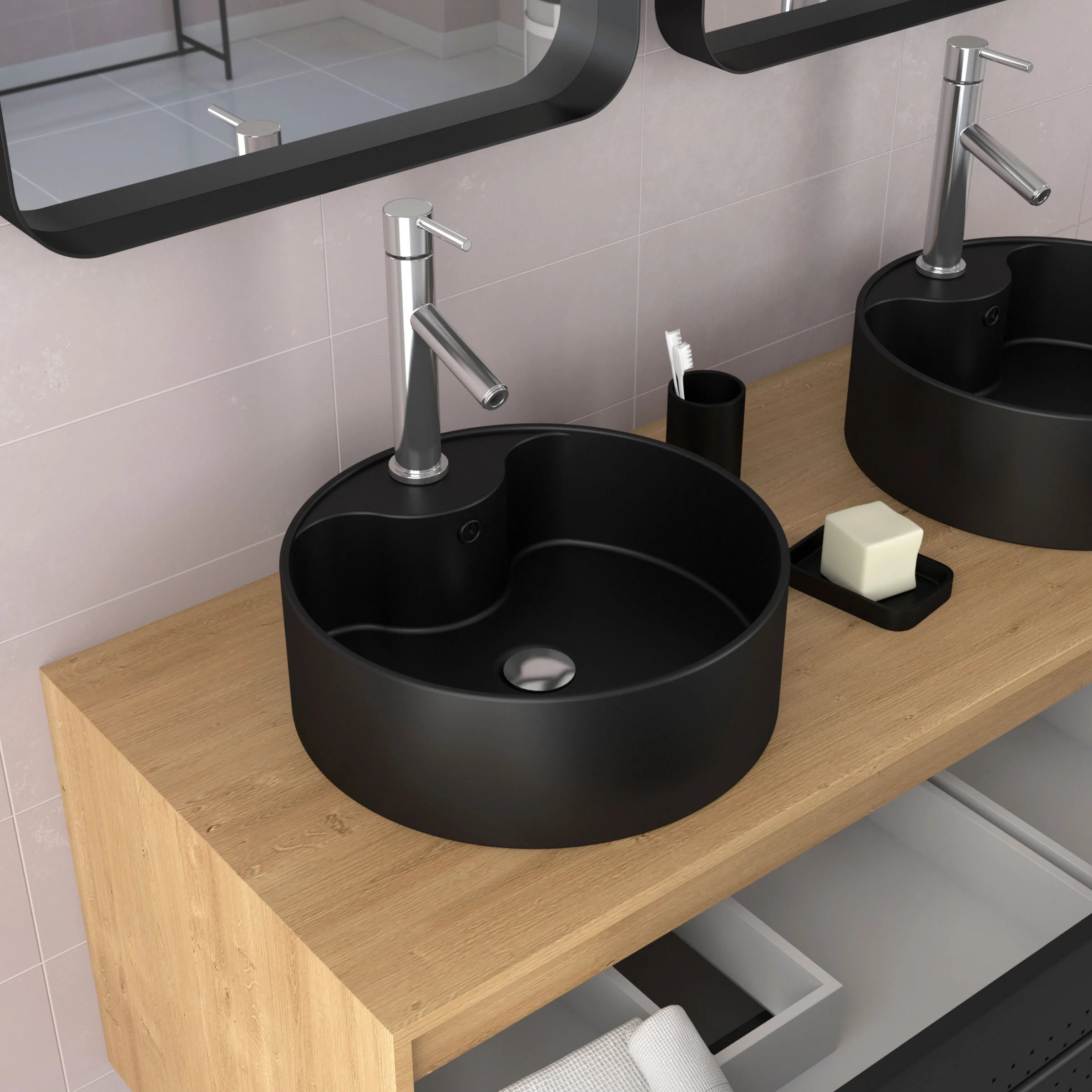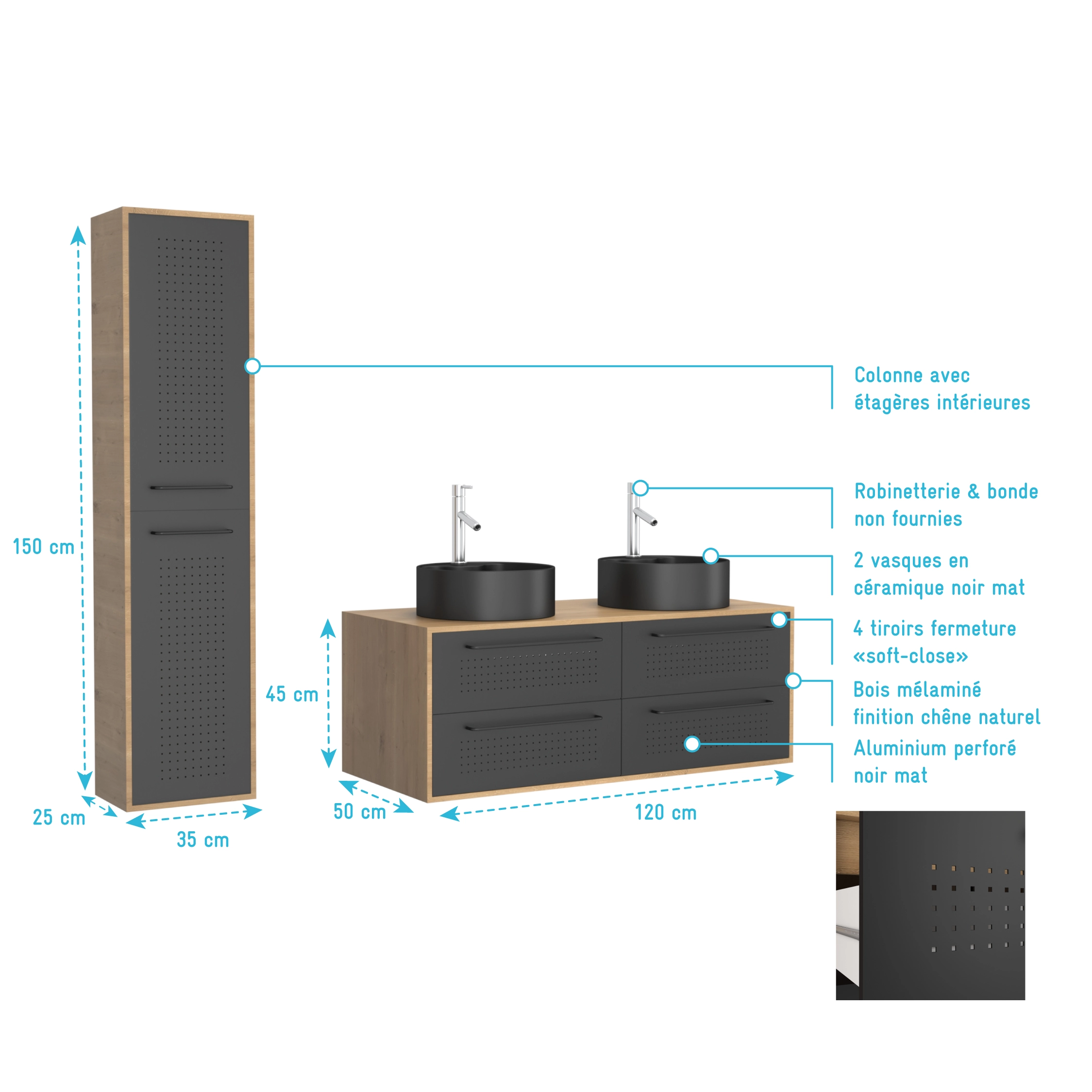 0 avis OMEGA Meuble de Salle de Bains 120 cm - 2 Vasques Rondes et Colonne - Chêne naturel et Noir Mat - UBY