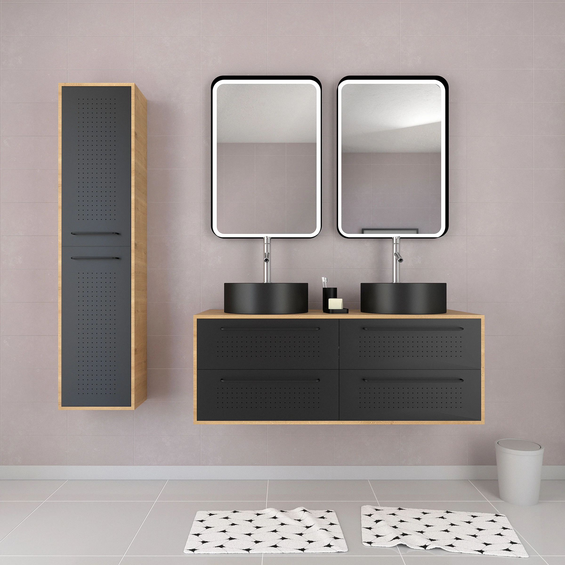 0 avis OMEGA Meuble Salle de Bains 120cm vasques Rectangles Miroirs Led et Colonne - Chene naturel et Noir - UBY