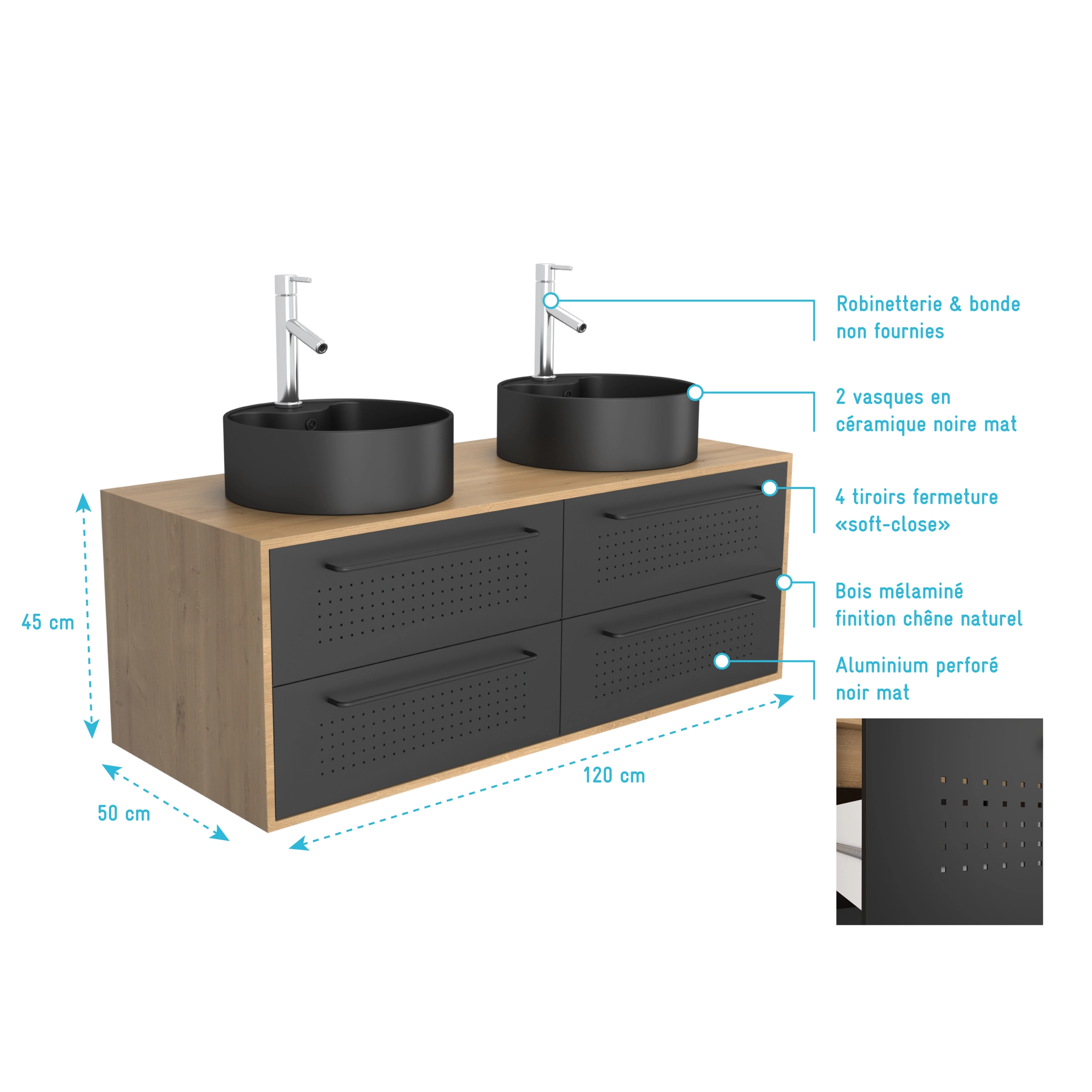 1 avis pour Meuble de Salle de Bains 120 cm – 2 Vasques Rondes – Chêne naturel et Noir Mat – UBY