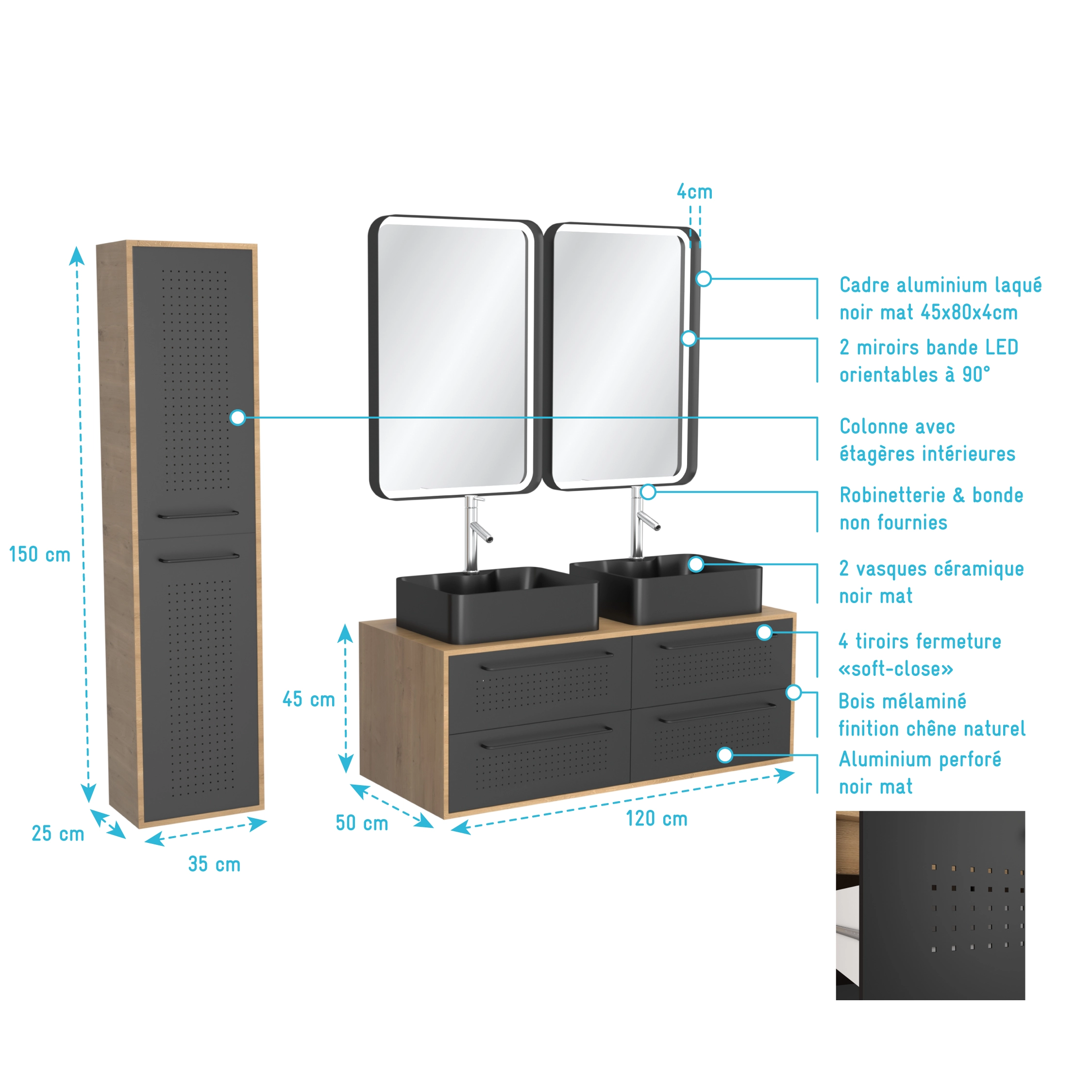 Apportez de l’authenticité à votre salle de bain grâce à ce meuble de rangement en noir mat, composé de trous perforés.