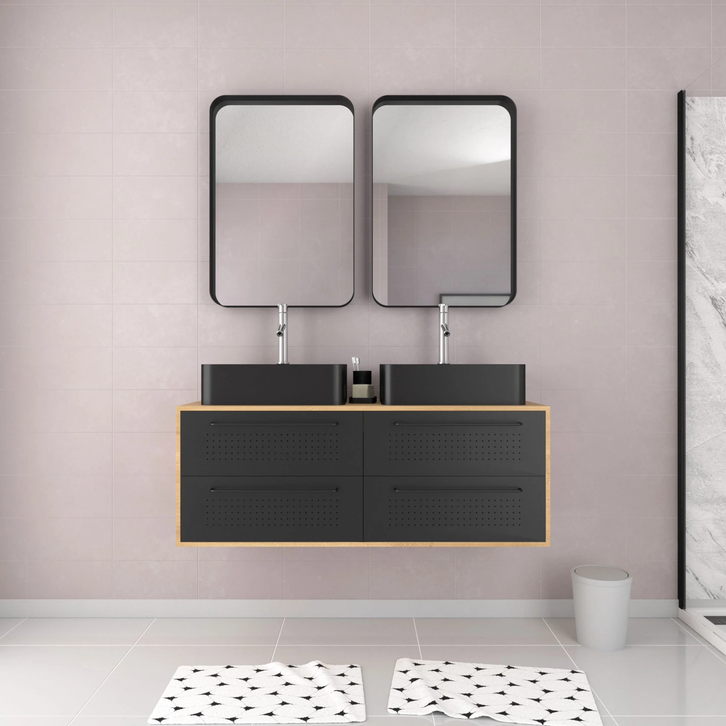 Meuble de Salle de Bains 120 cm – 2 Vasques Rectangles – 2 miroirs – Chene naturel et Noir Mat – UBY