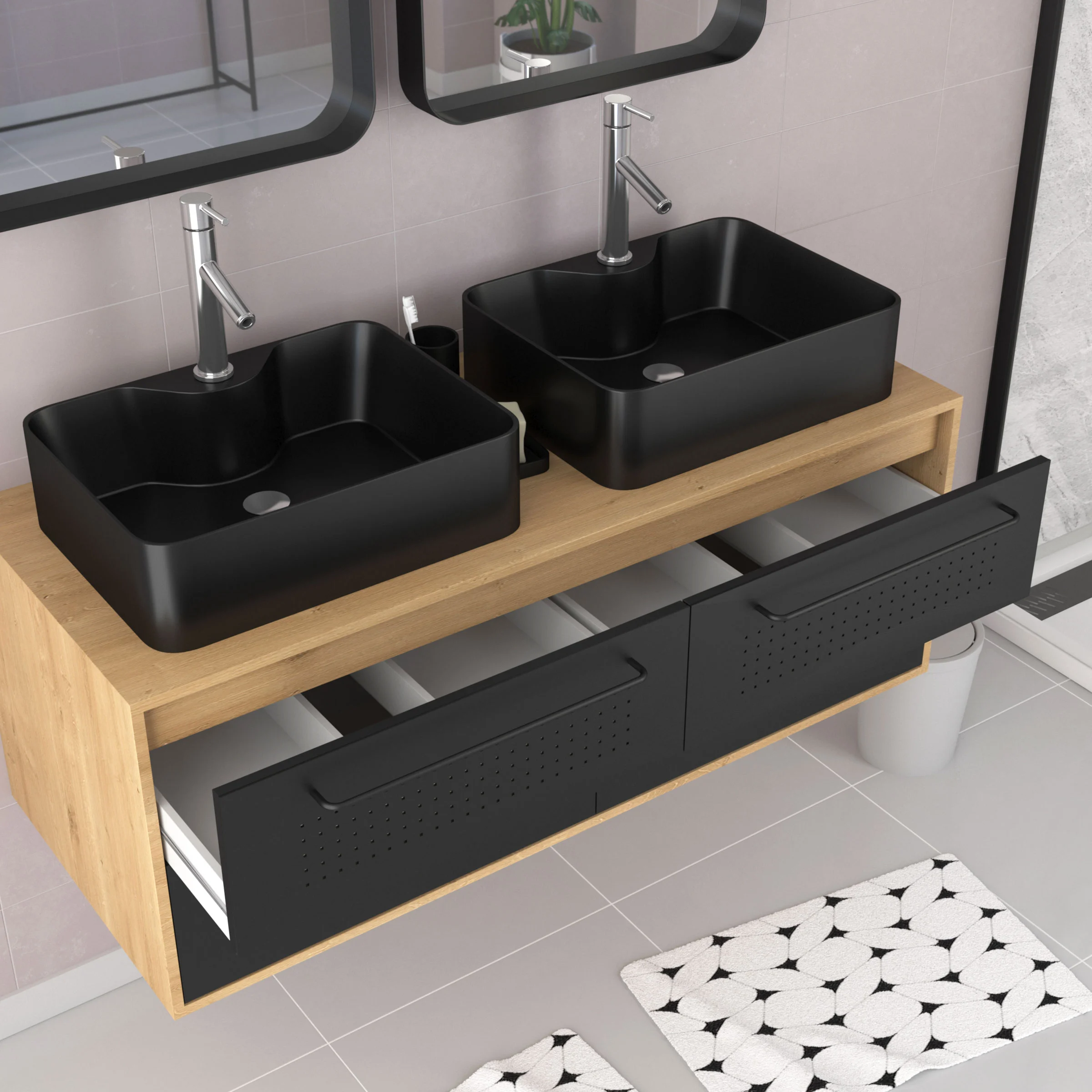 0 avis TIMBER Meuble Salle de Bains 120cm 4 Tiroirs Chêne Naturel, 2 Vasques Noires 41x41x15cm, 2 Miroirs 55x75cm