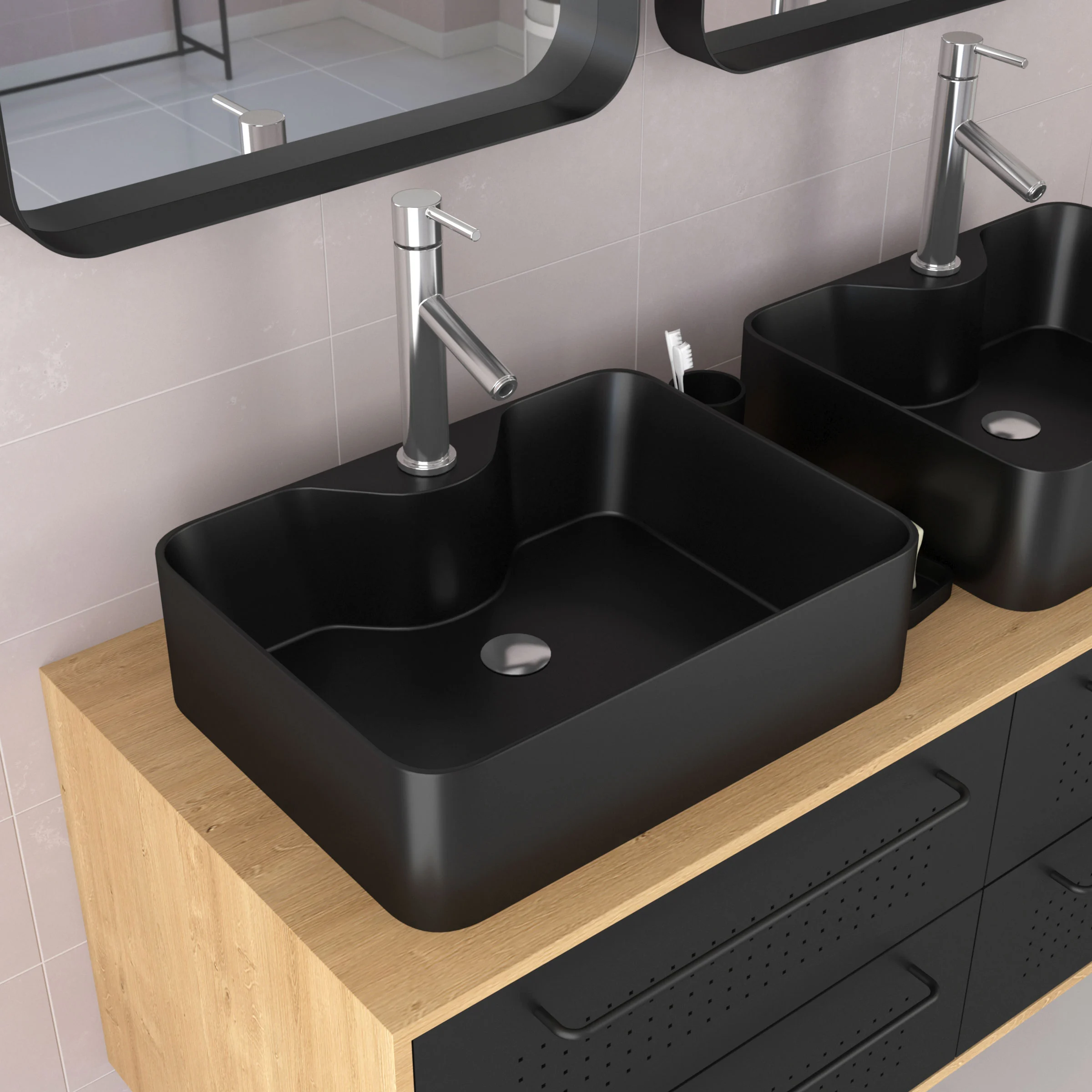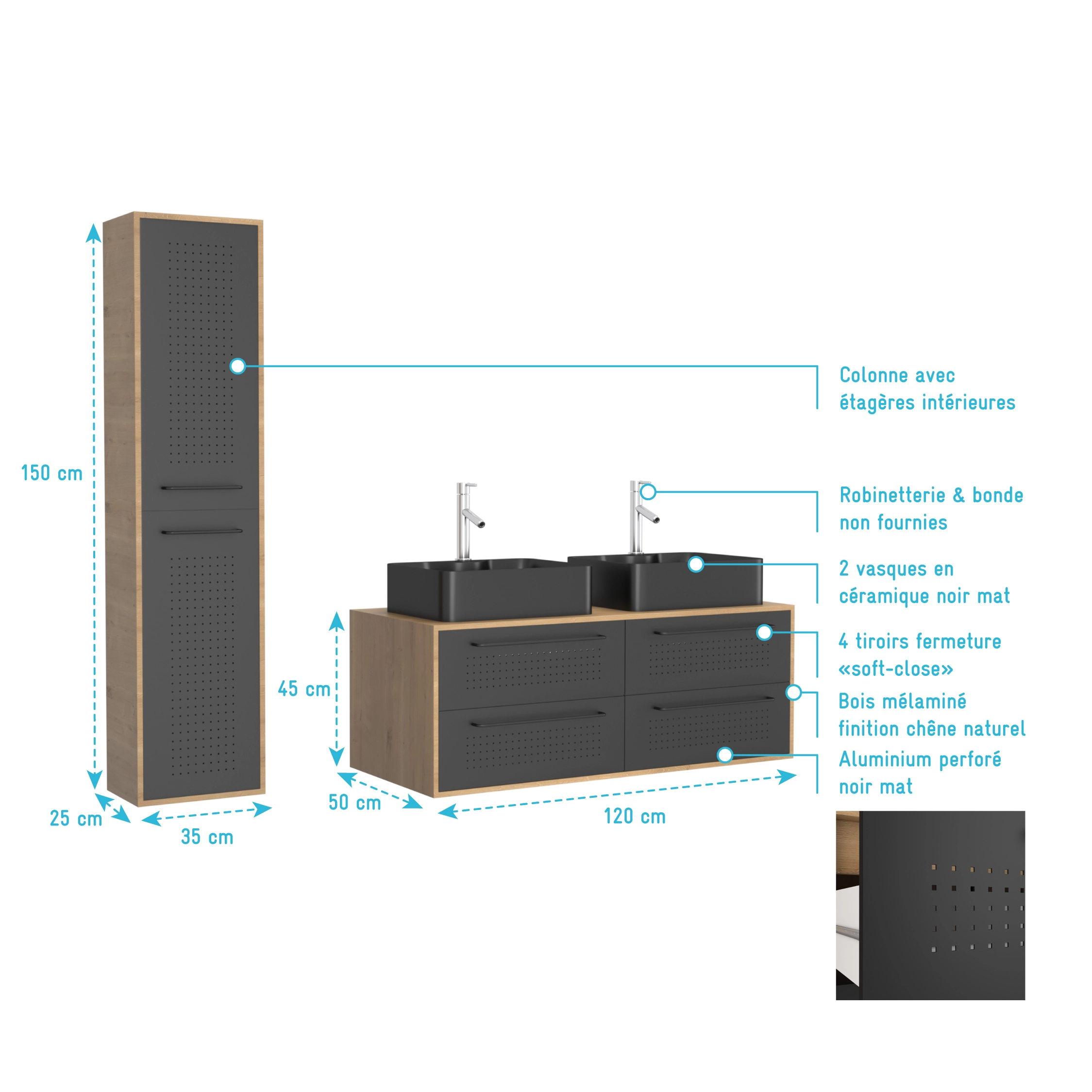 • Meuble de Salle de Bains 120 cm - 2 Vasques Rectangles et Colonne - Chêne naturel et Noir Mat - UBY
