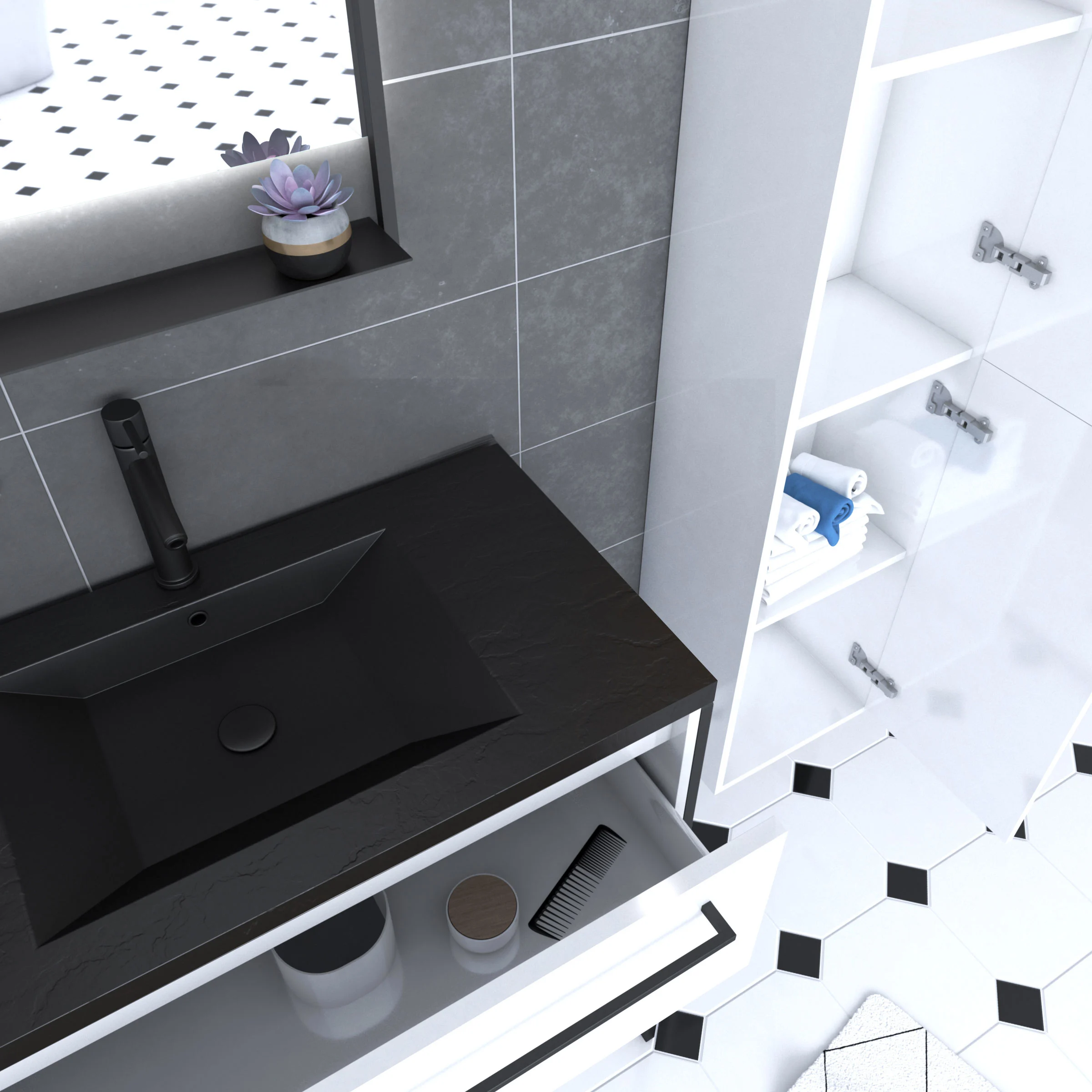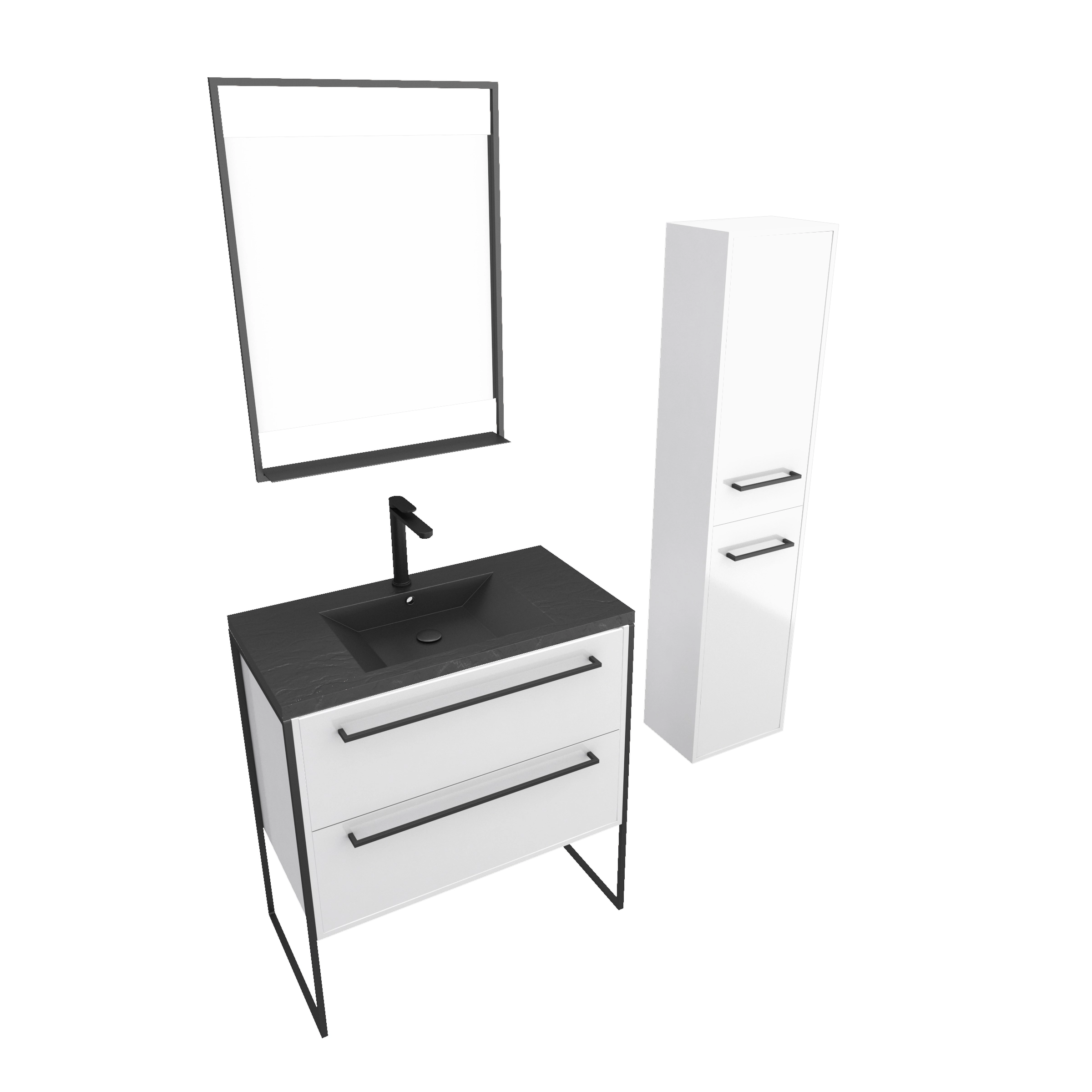 Meuble Salle de Bains 80 cm, Vasque Noire, Miroir Led et Colonne – Blanc – STRUCTURA