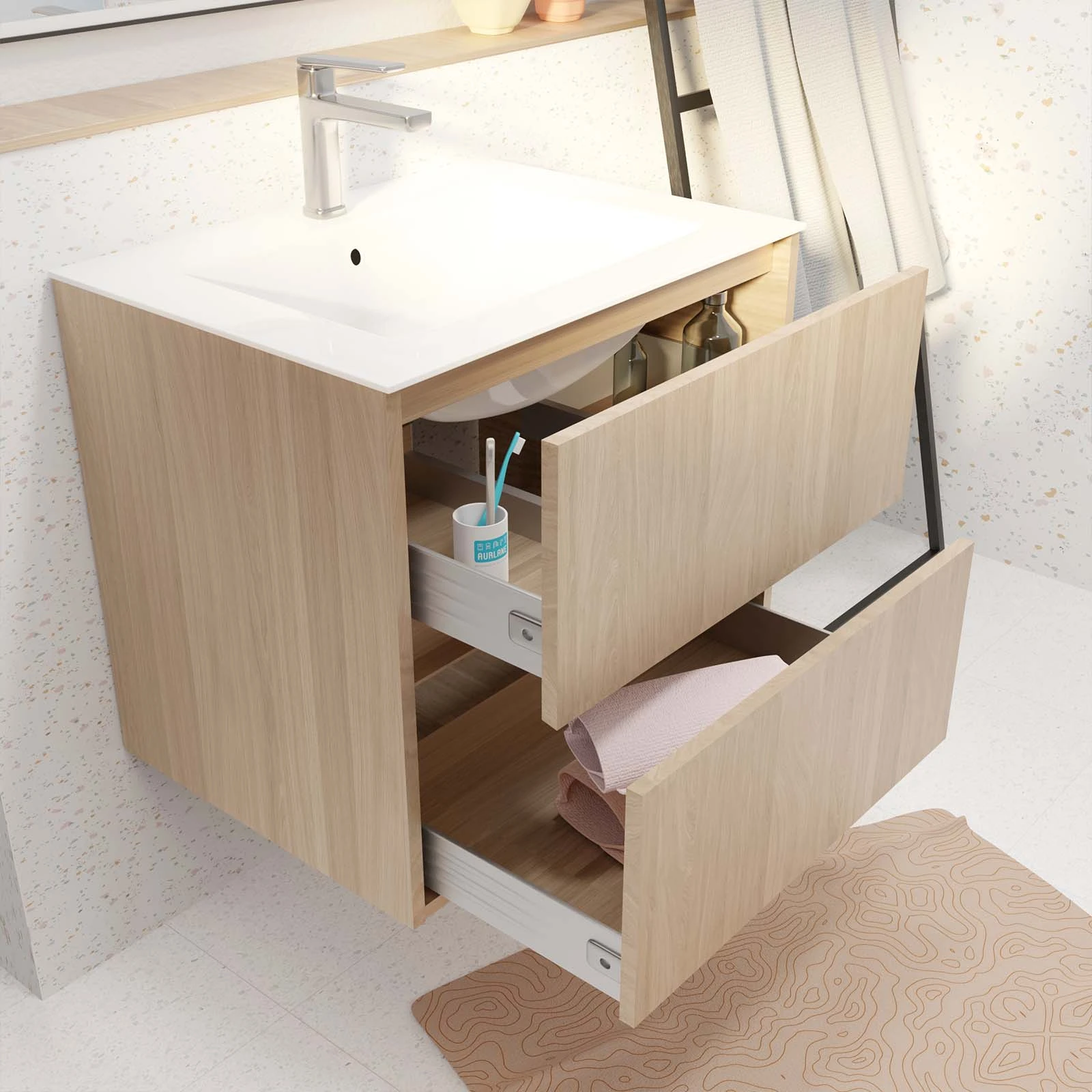 Pack Meuble Salle de Bains 60 cm Chêne Clair, 2 tiroirs avec Vasque Céramique – XENOS
