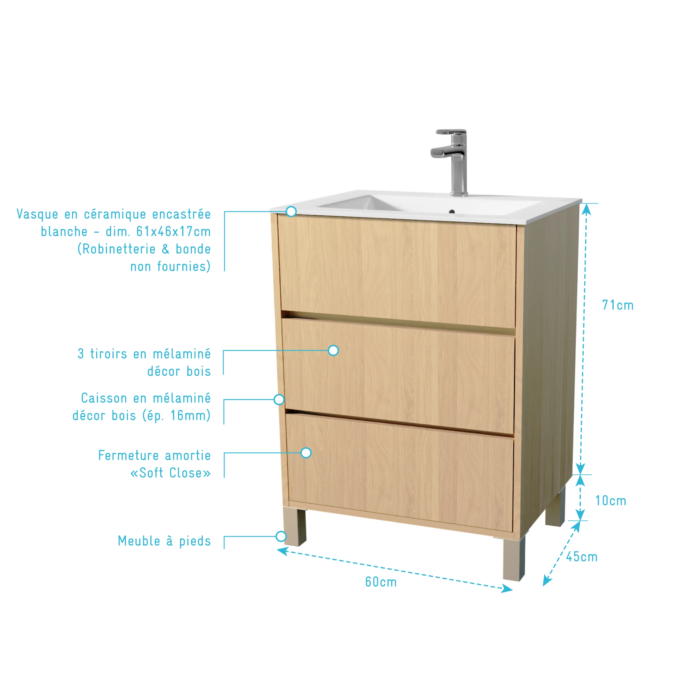 1 avis pour Pack Meuble Salle de Bains 60 cm Chêne Clair, 3 tiroirs avec Vasque Céramique – XENOS