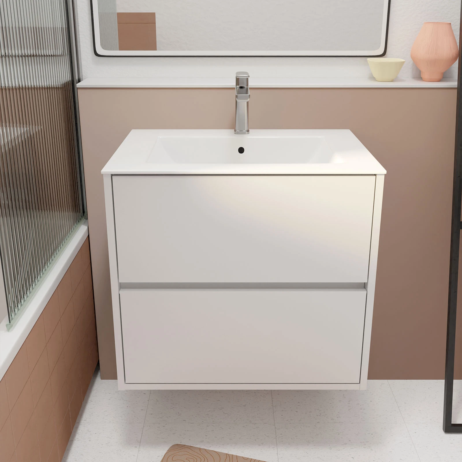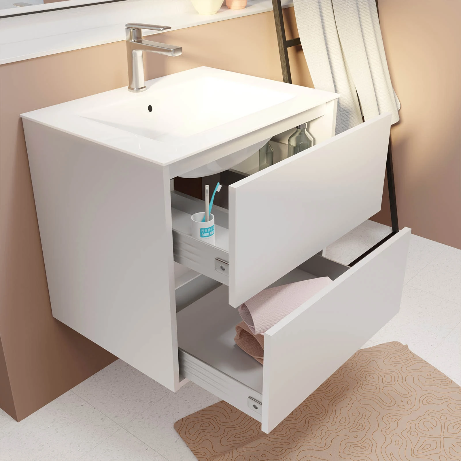 Pack Meuble Salle de Bains 60 cm Laqué Blanc, 2 tiroirs avec Vasque Céramique – XENOS