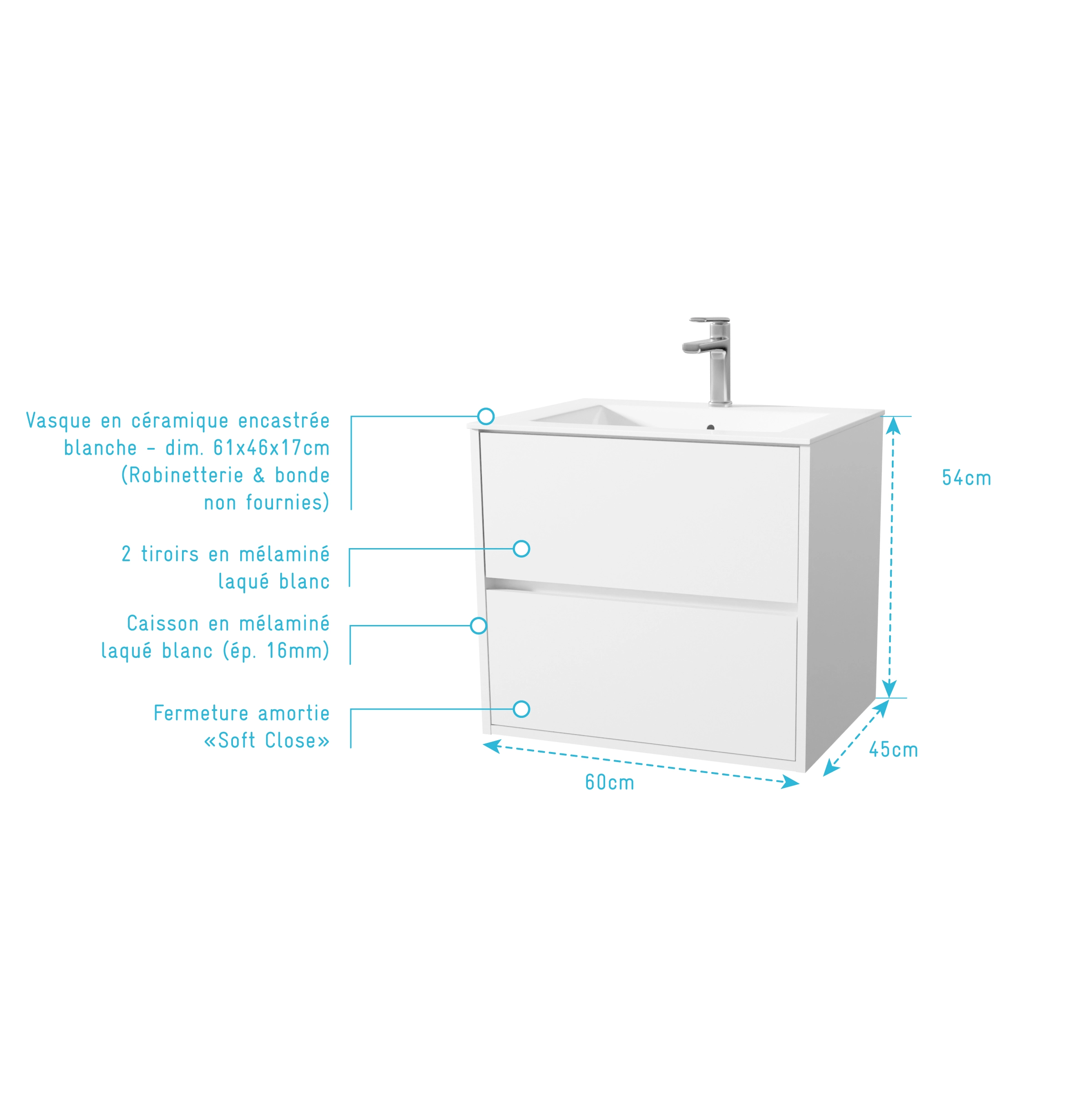 0 avis ELEMENTARY Meuble de Salle de Bains 60cm Suspendu Blanc 2 Tiroirs - Vasque Blanche - ELEMENTARY