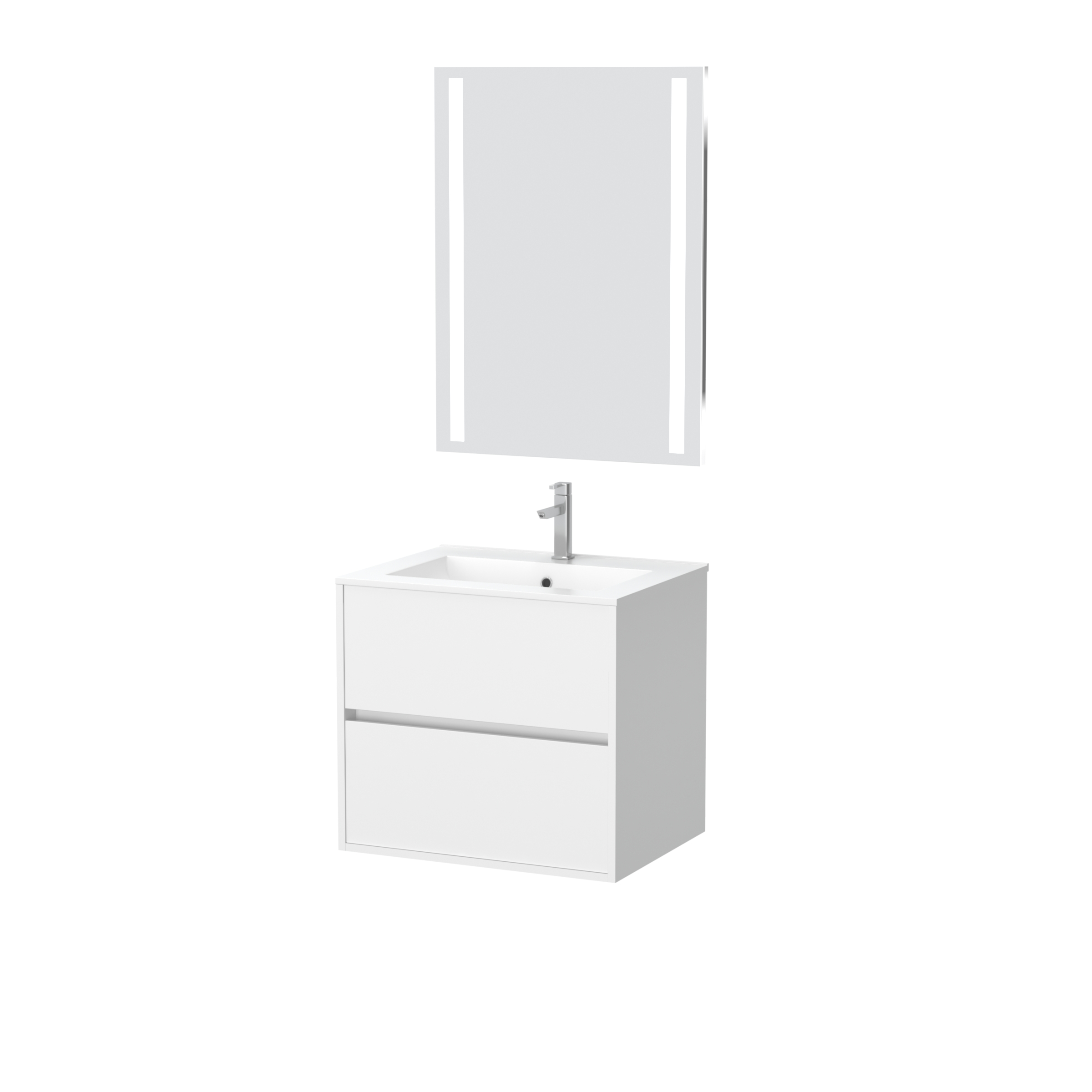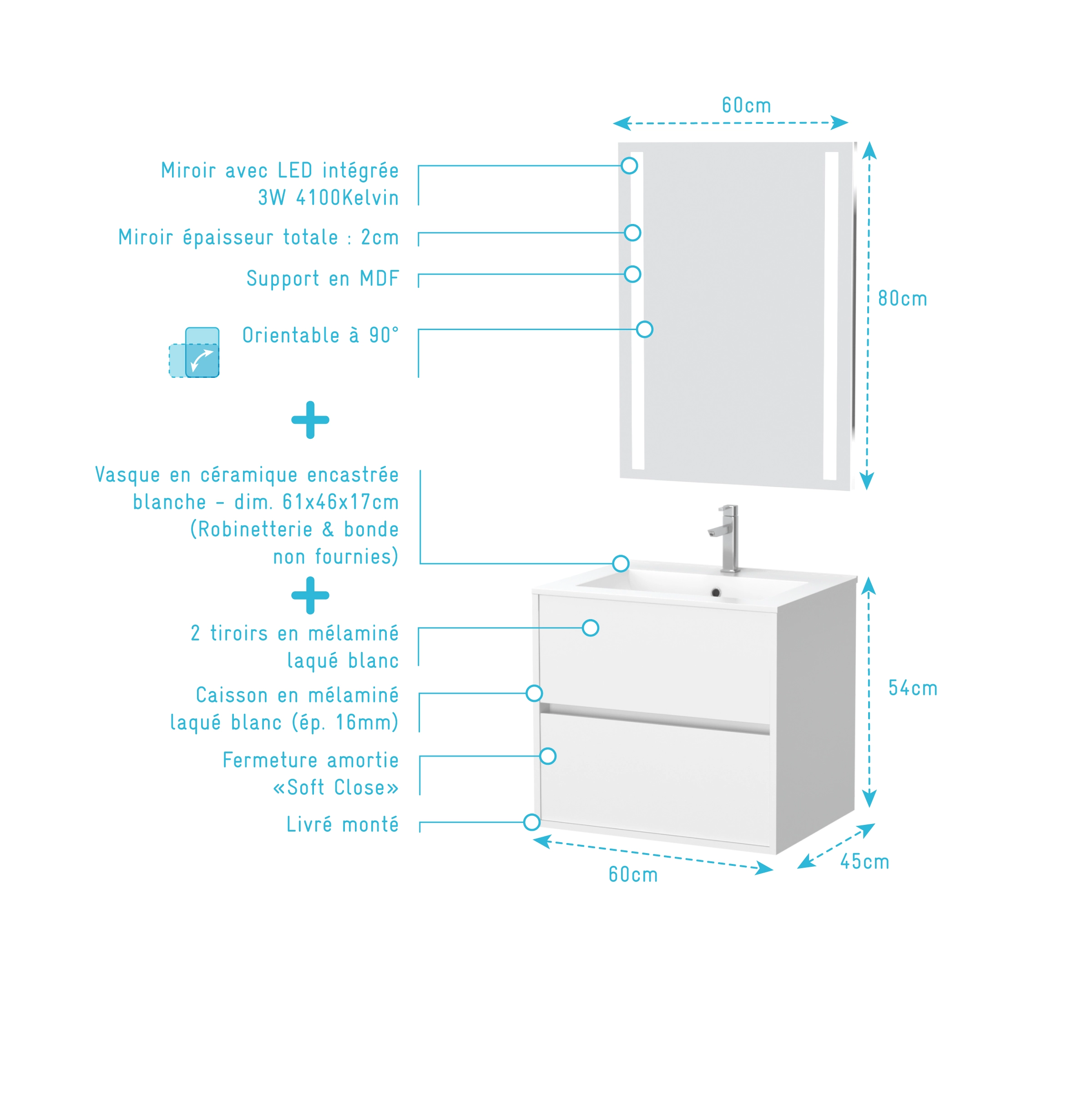 Pack Meuble Salle de Bains 60cm Blanc 2 Tiroirs, Vasque, Miroir 60×80 à Leds intégrées – XENOS