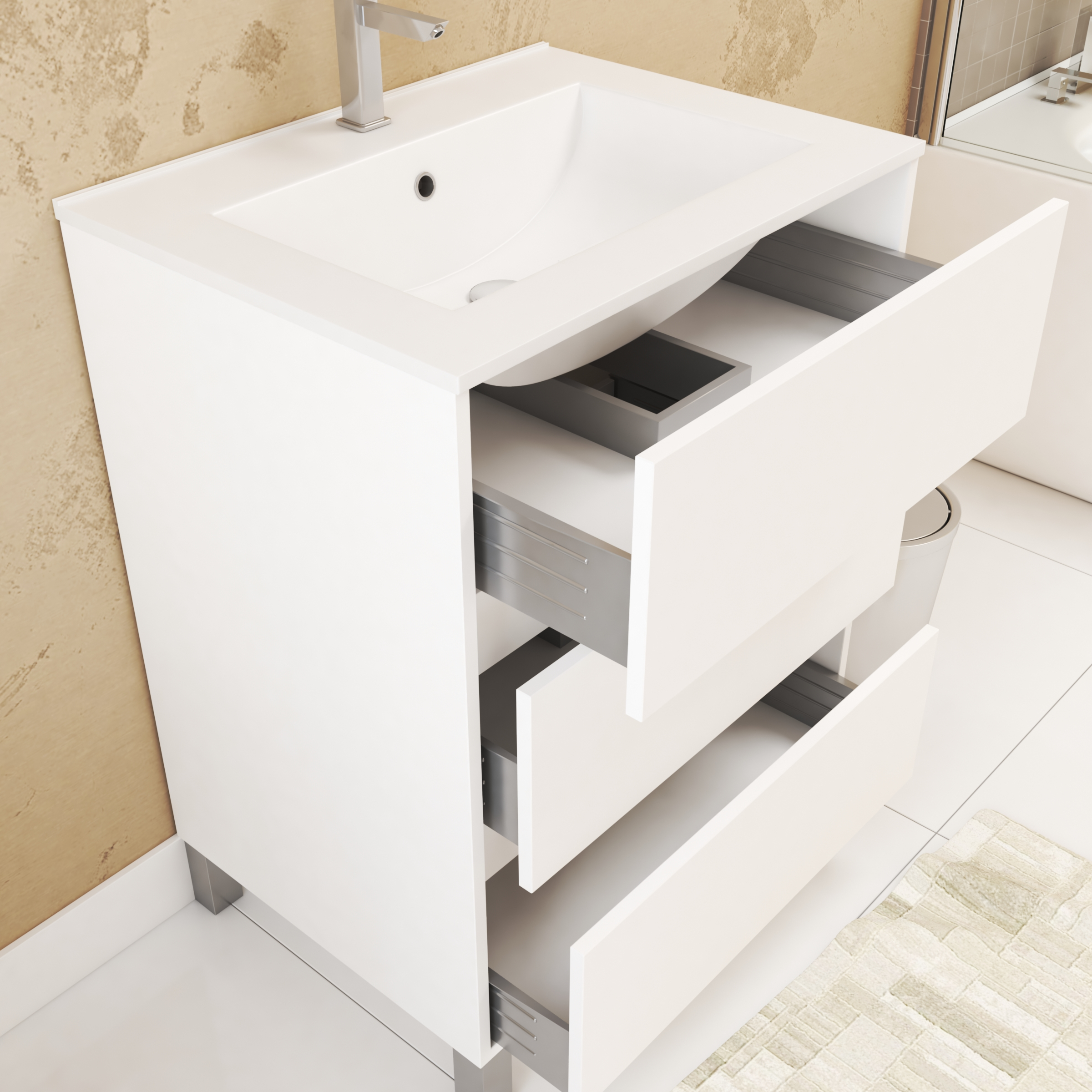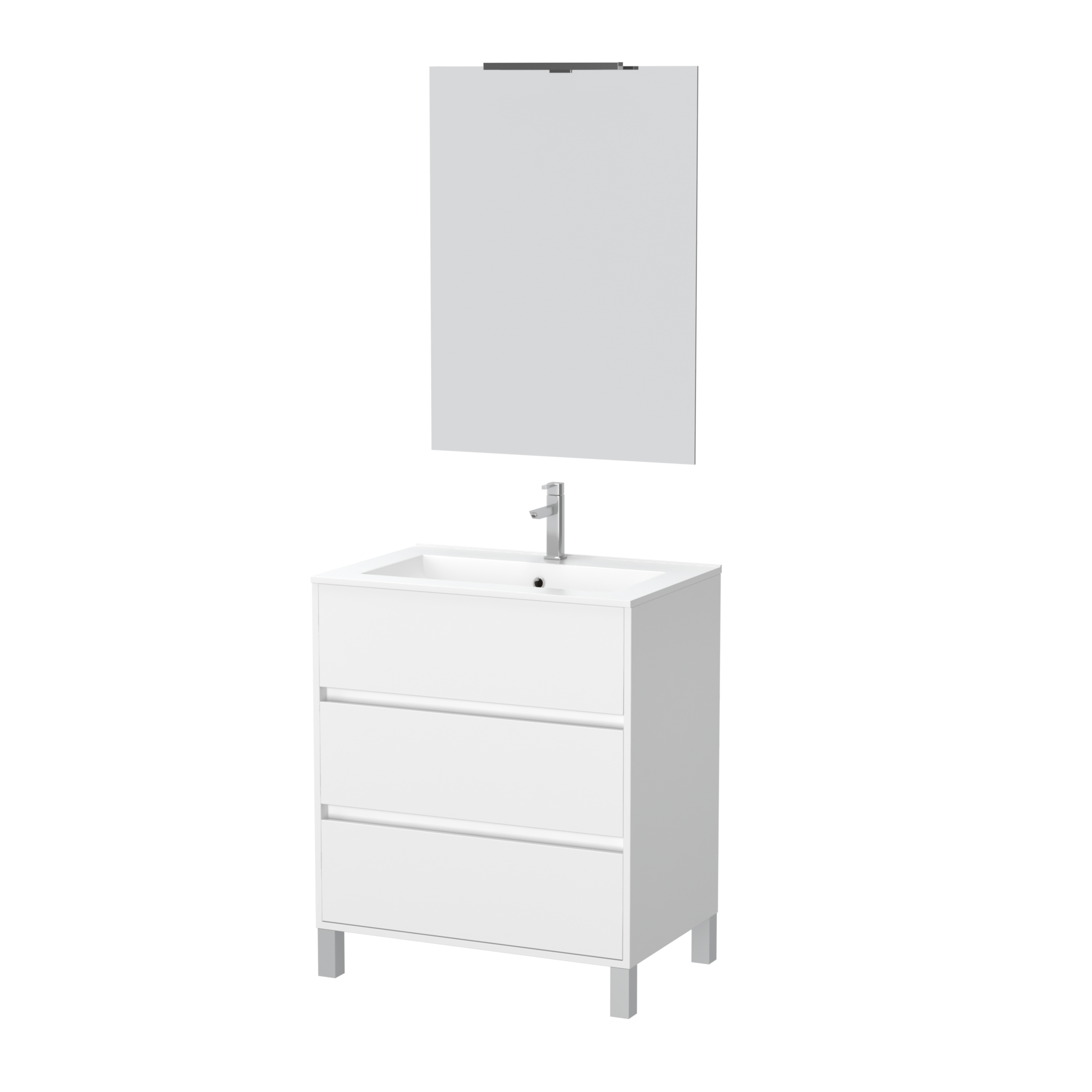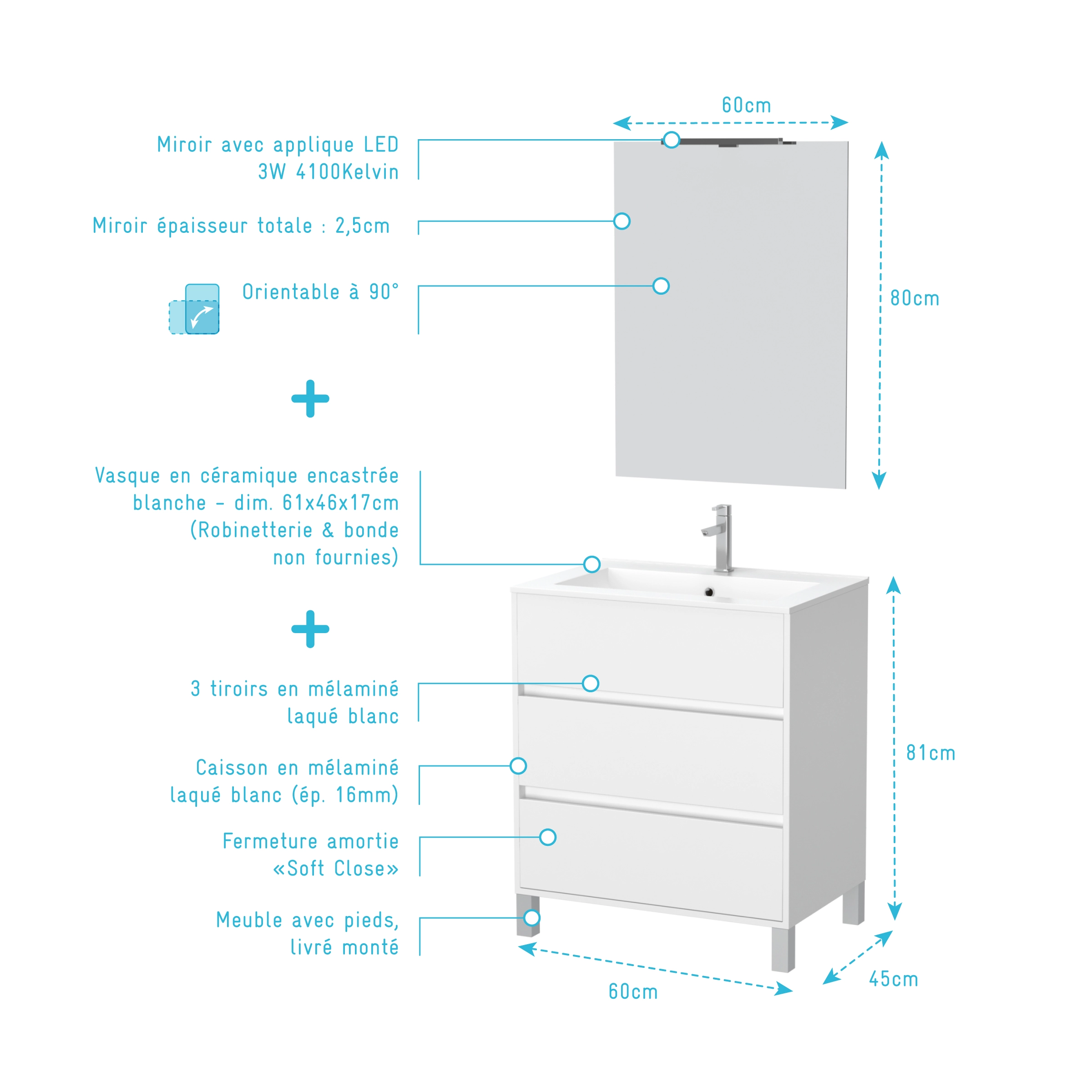 Pack Meuble Salle de Bains 60cm Blanc 3 Tiroirs, Vasque, Miroir 60×80 et réglette Led – XENOS