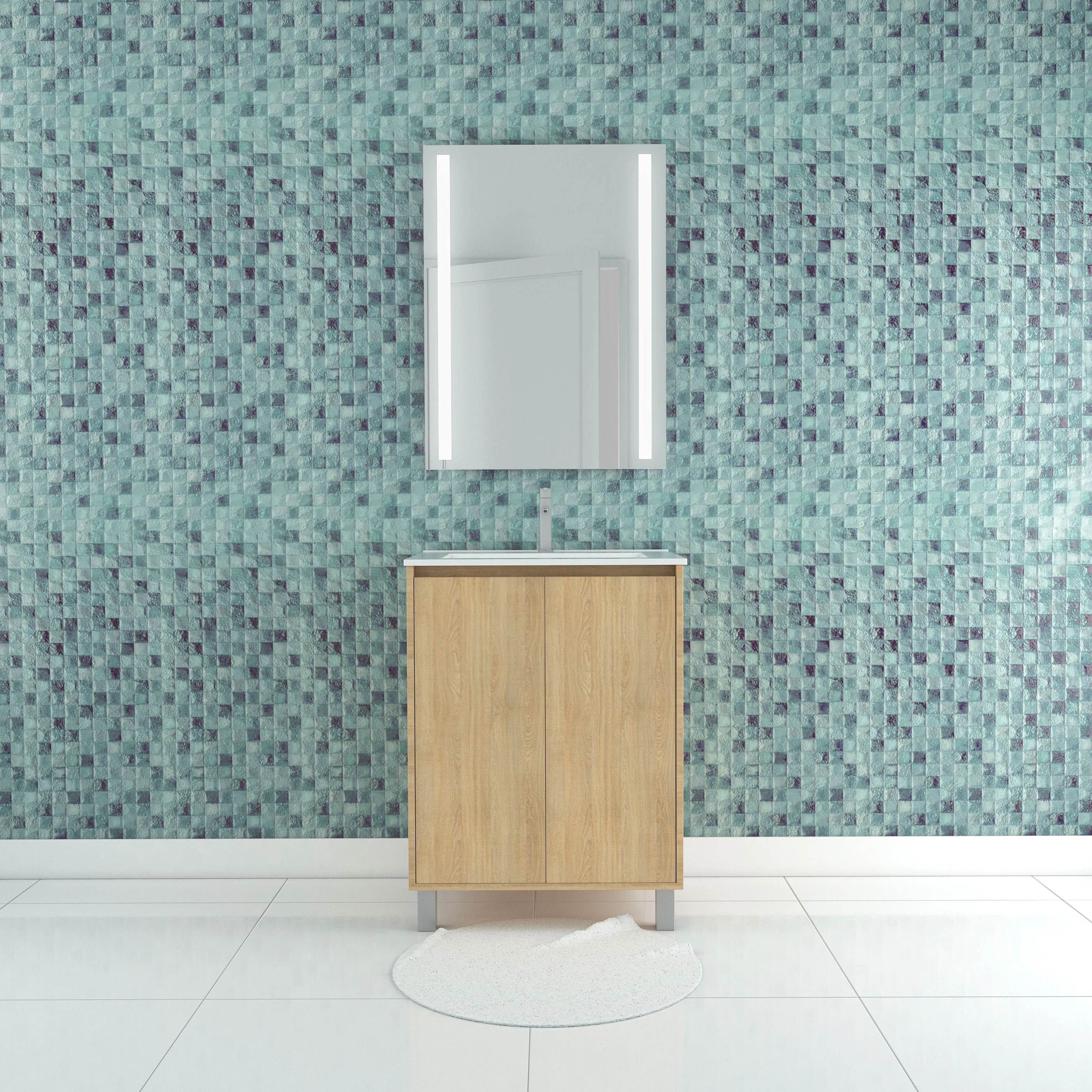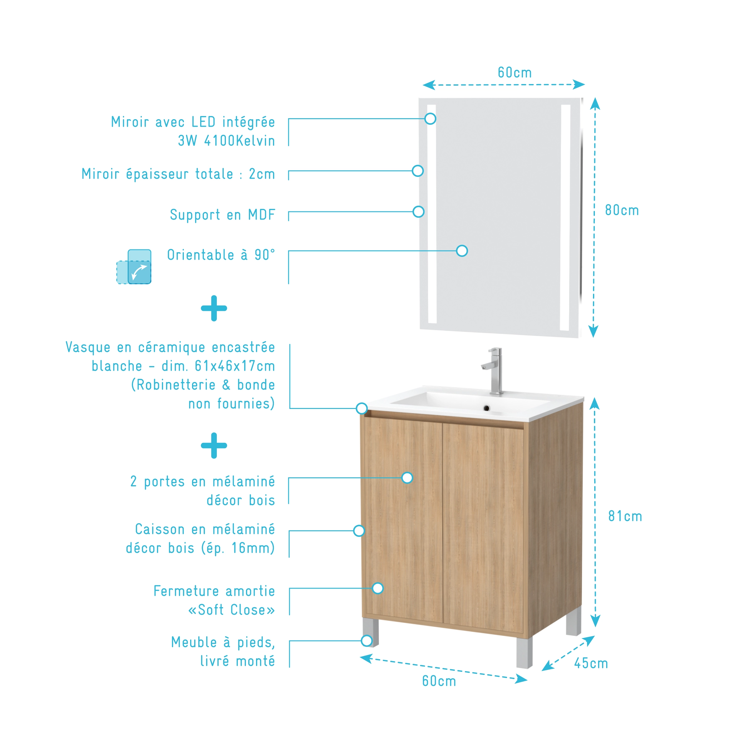 Pack Meuble Salle de Bains 60cm Chêne Clair 2 Portes, Vasque, Miroir 60×80 à Leds intégrées – XENOS