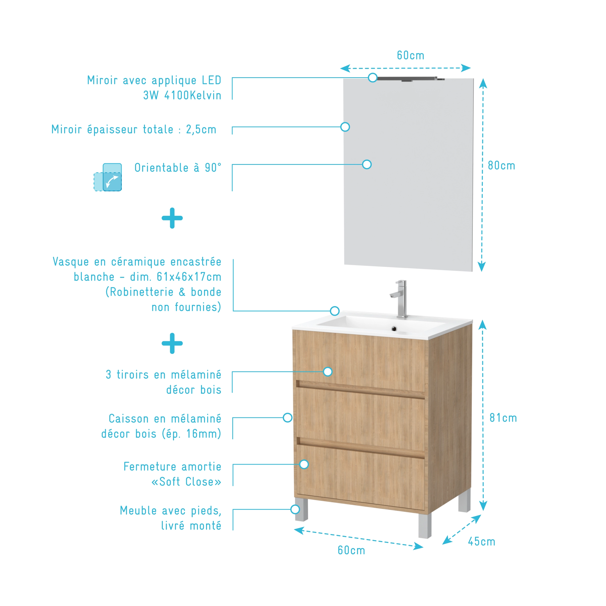 Pack Meuble Salle de Bains 60cm Chêne Clair 3 Tiroirs, Vasque, Miroir 60×80 et réglette Led – XENOS