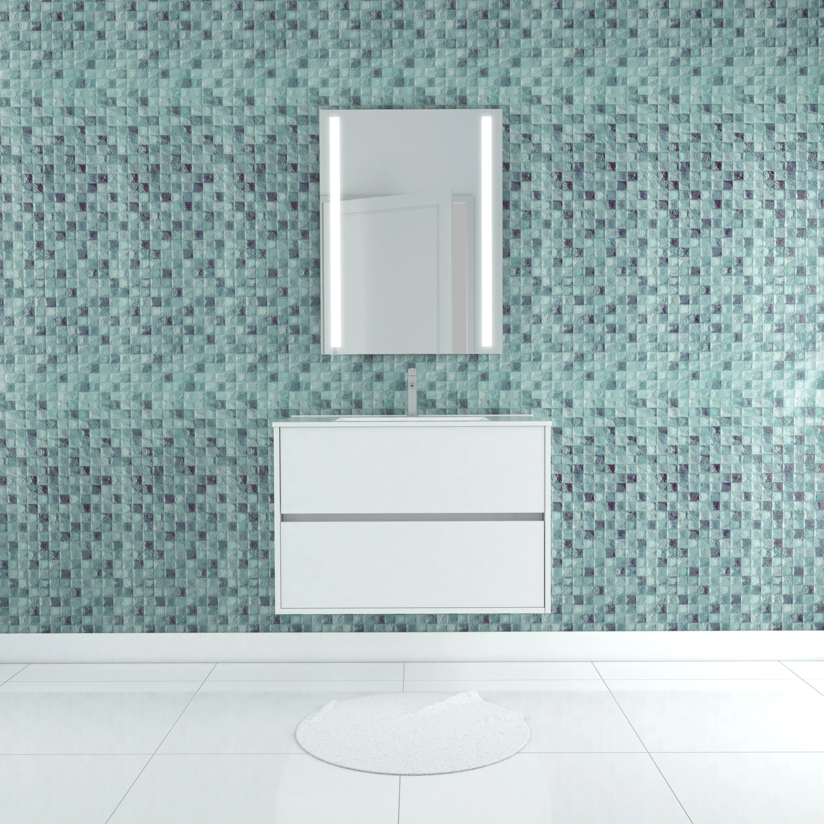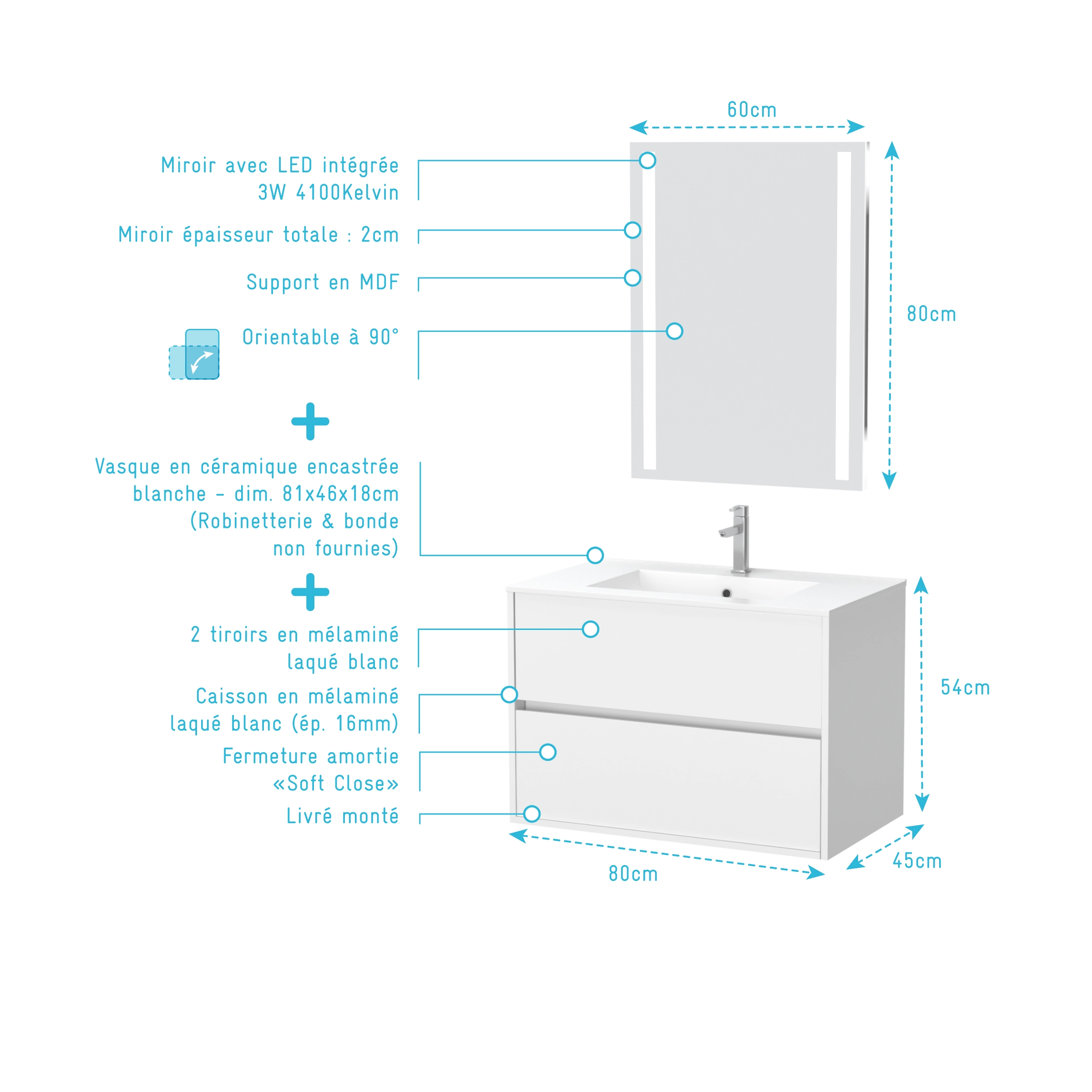 Pack Meuble Salle de Bains 80cm Blanc 2 Tiroirs, Vasque, Miroir 60×80 à Leds intégrées – XENOS