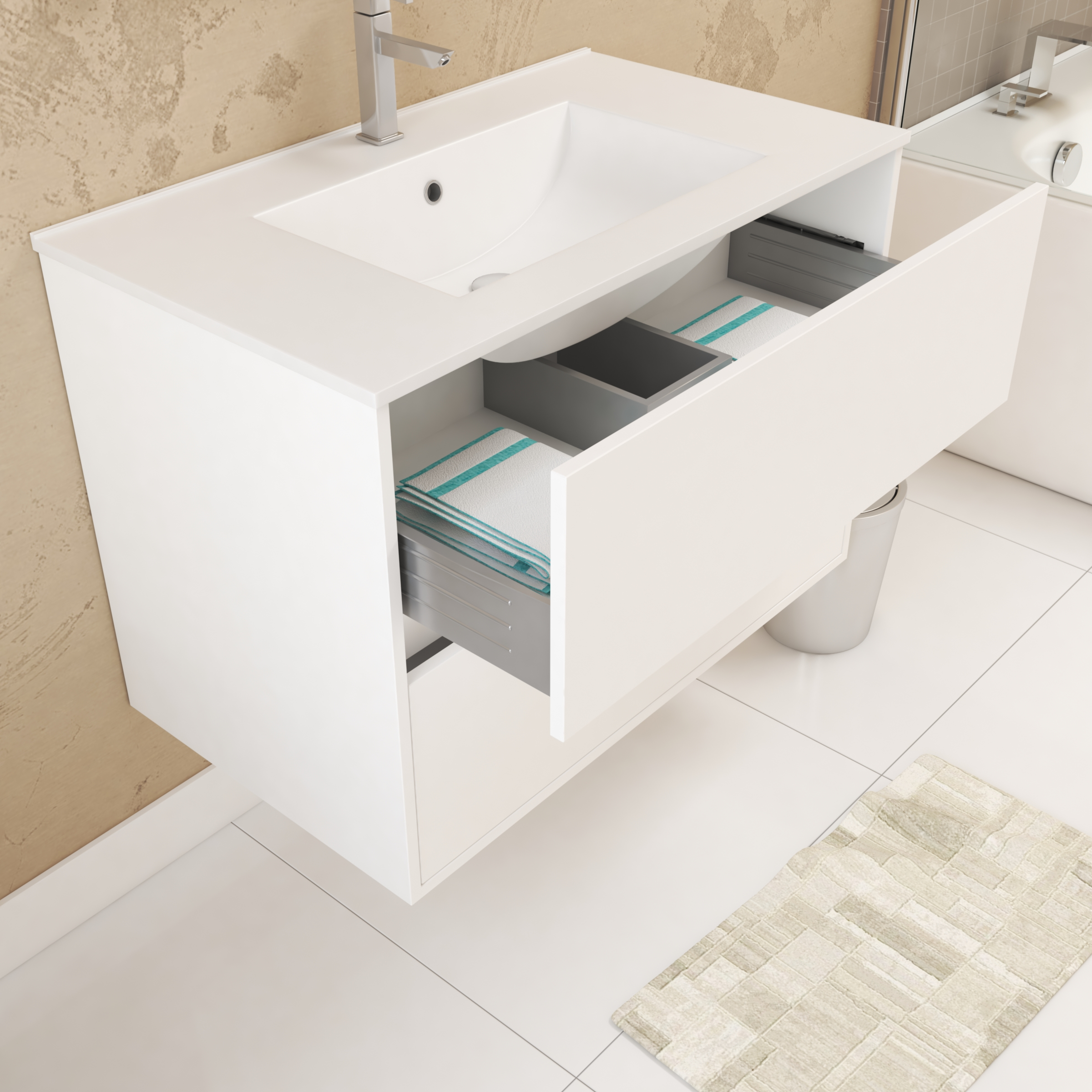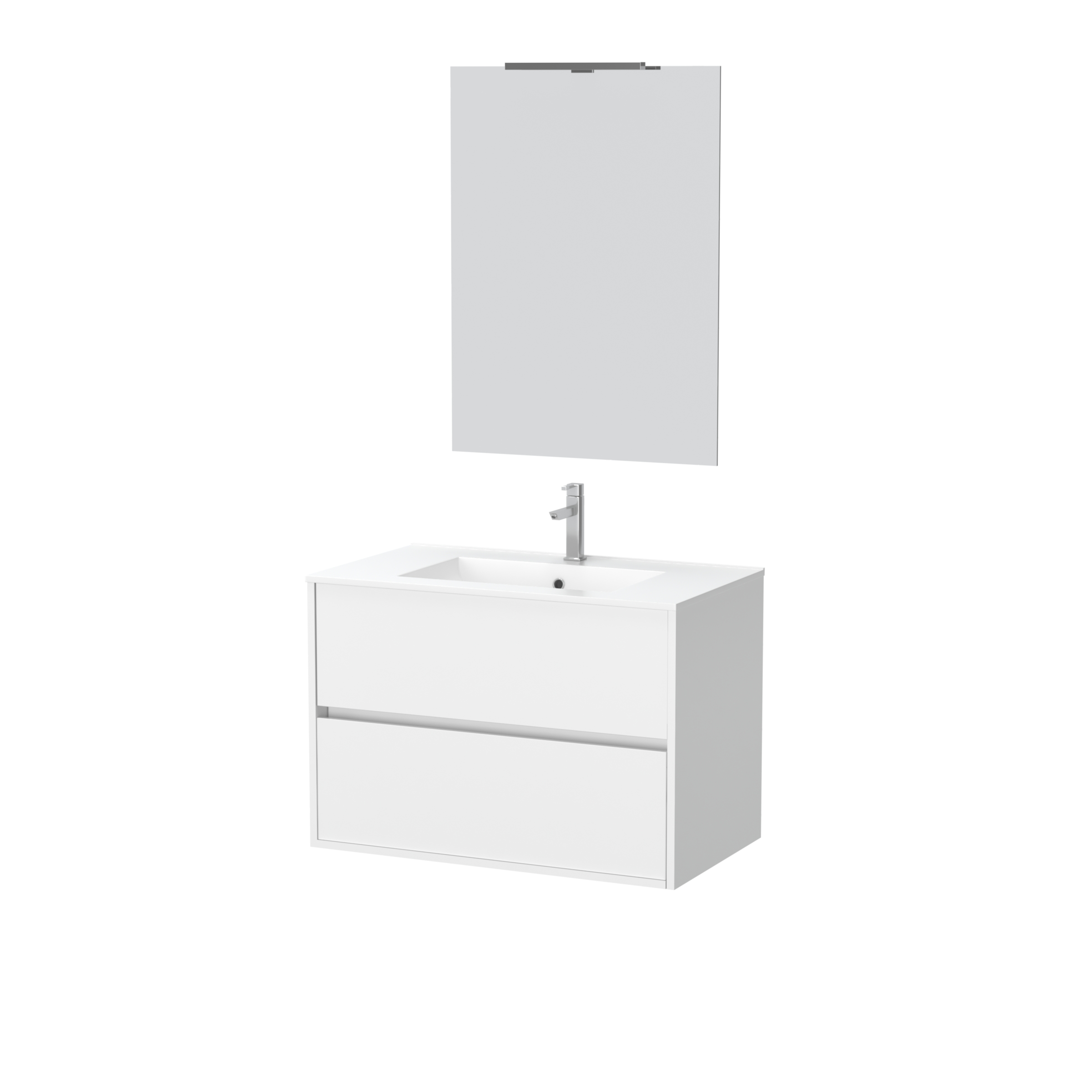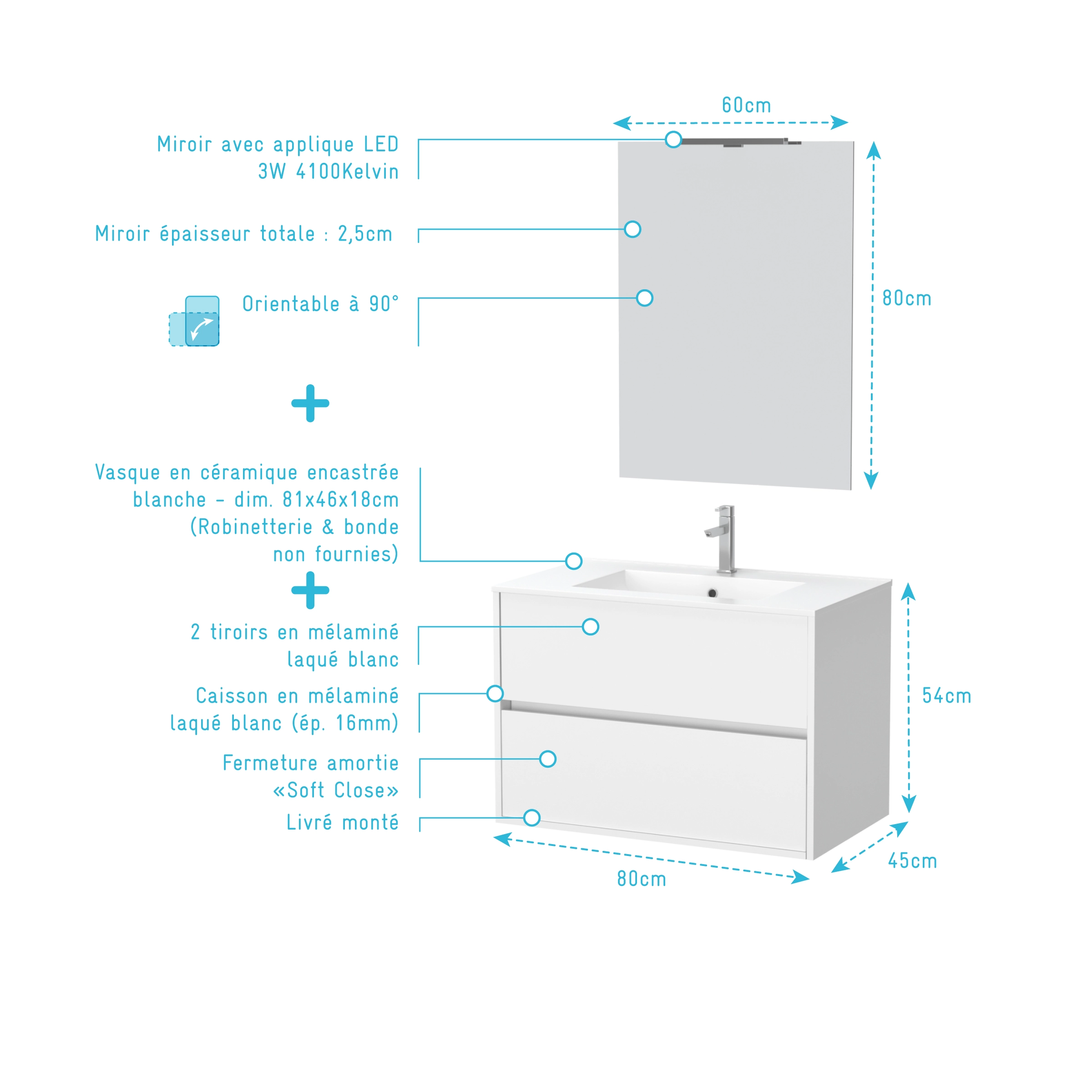 Pack Meuble Salle de Bains 80cm Blanc 2 Tiroirs, Vasque, Miroir 60×80 et réglette Led – XENOS
