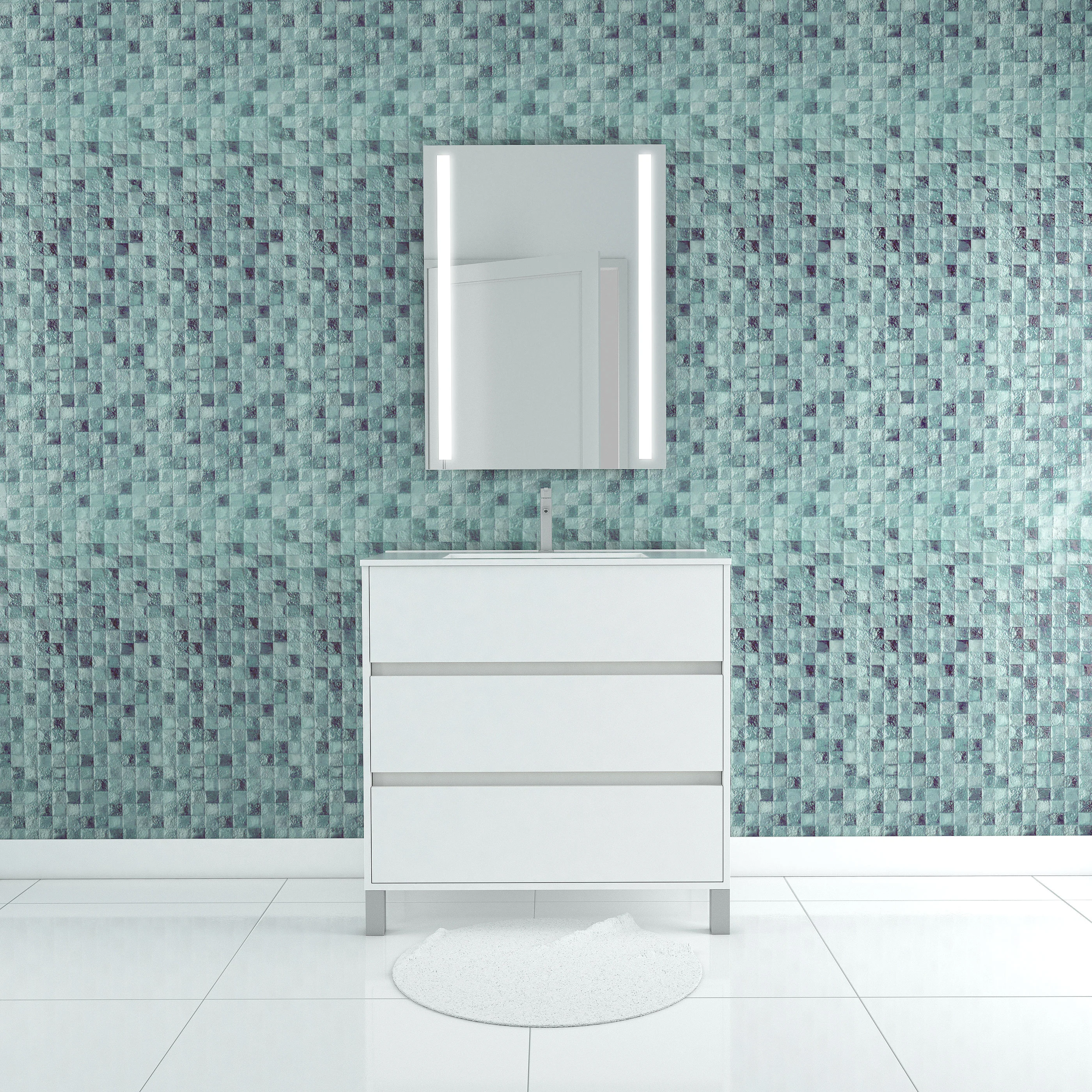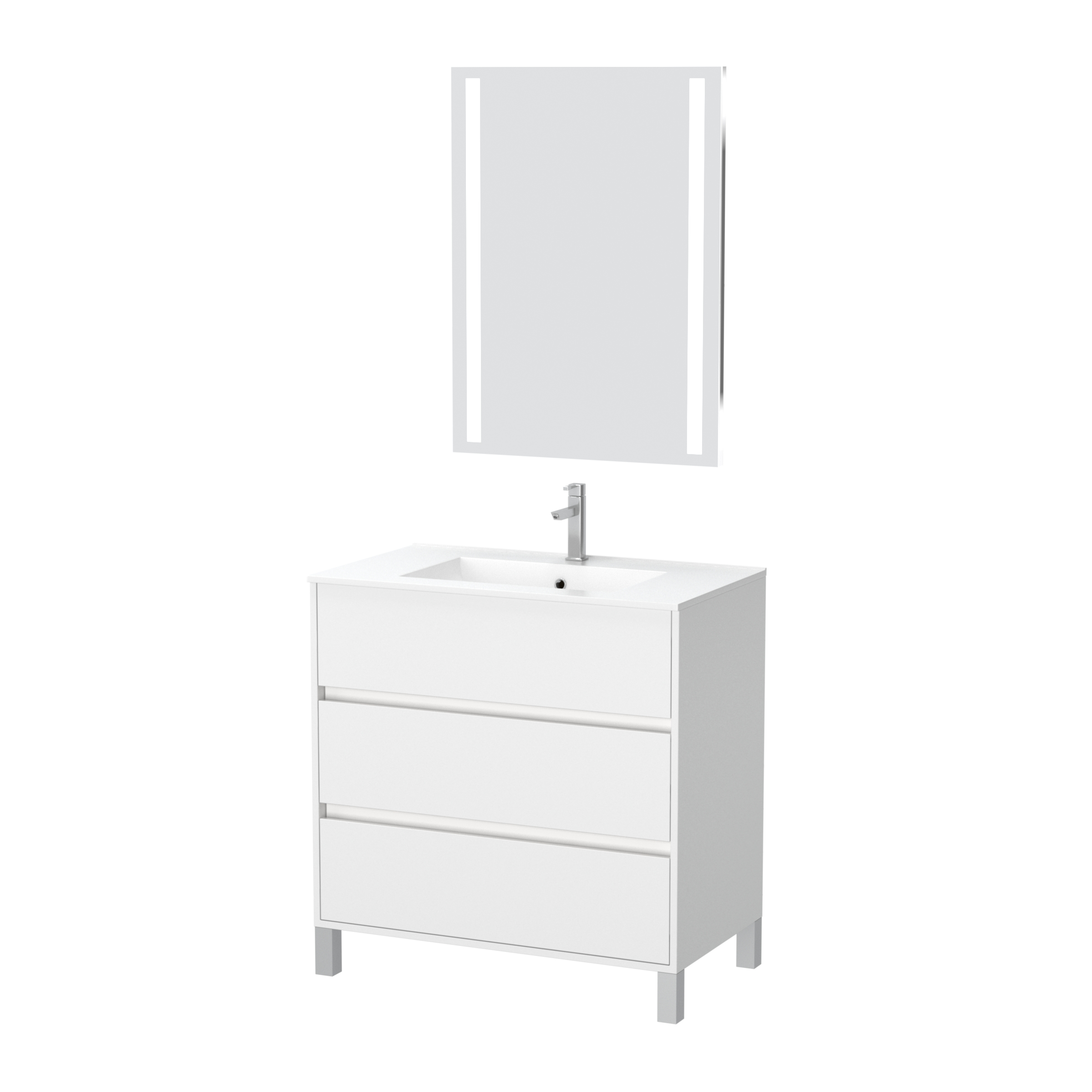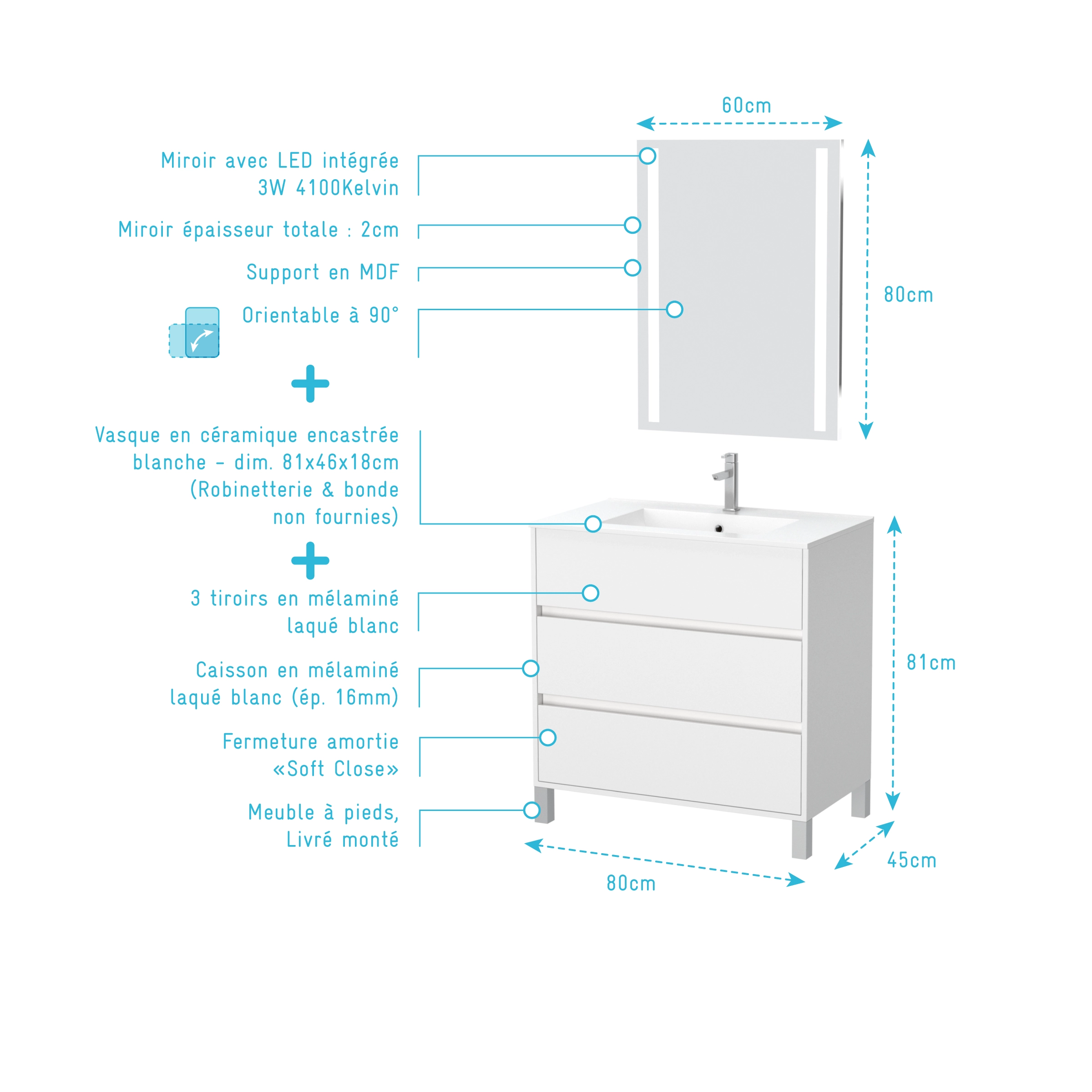 Pack Meuble Salle de Bains 80cm Blanc 3 Tiroirs, Vasque, Miroir 60×80 à Leds intégrées – XENOS