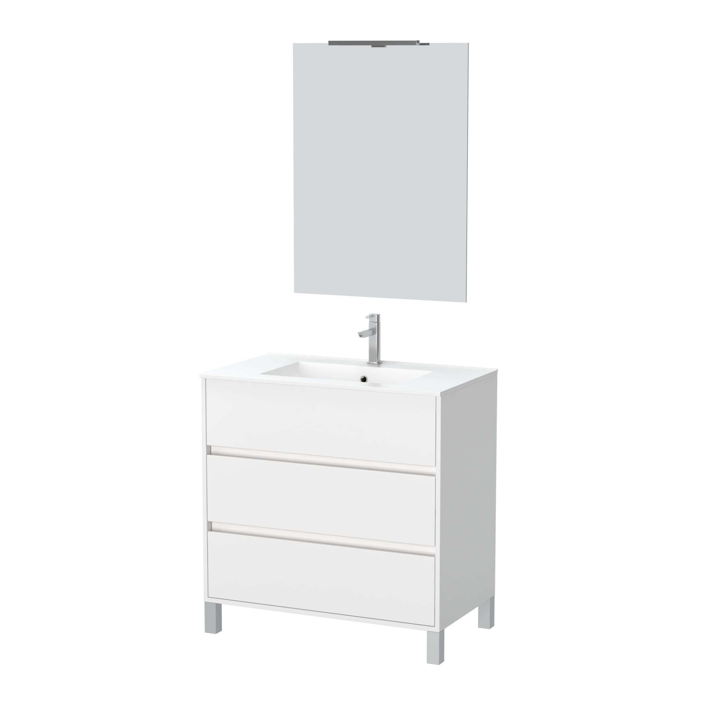 Pack Meuble Salle de Bains 80cm Blanc 3 Tiroirs, Vasque, Miroir 60×80 et réglette Led – XENOS