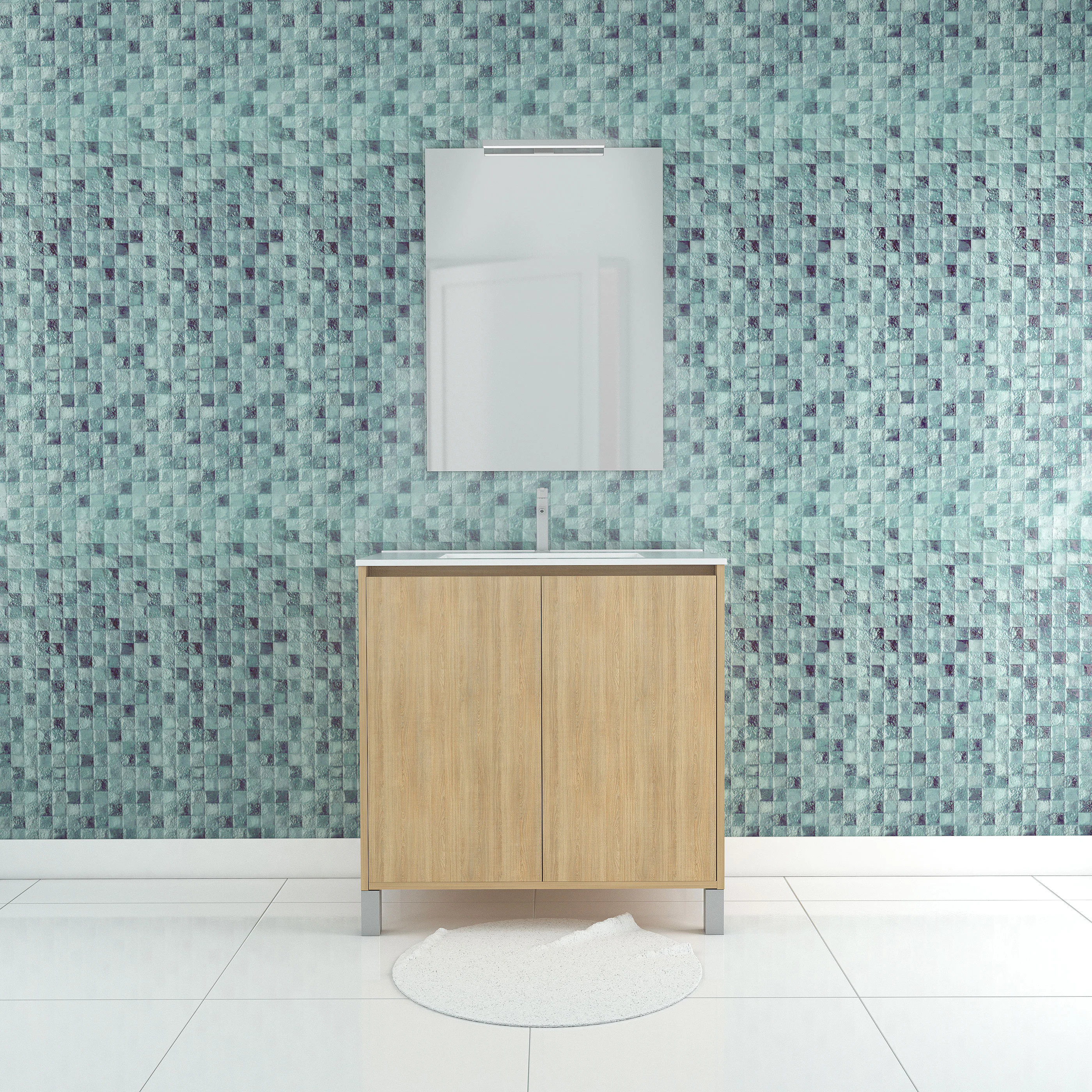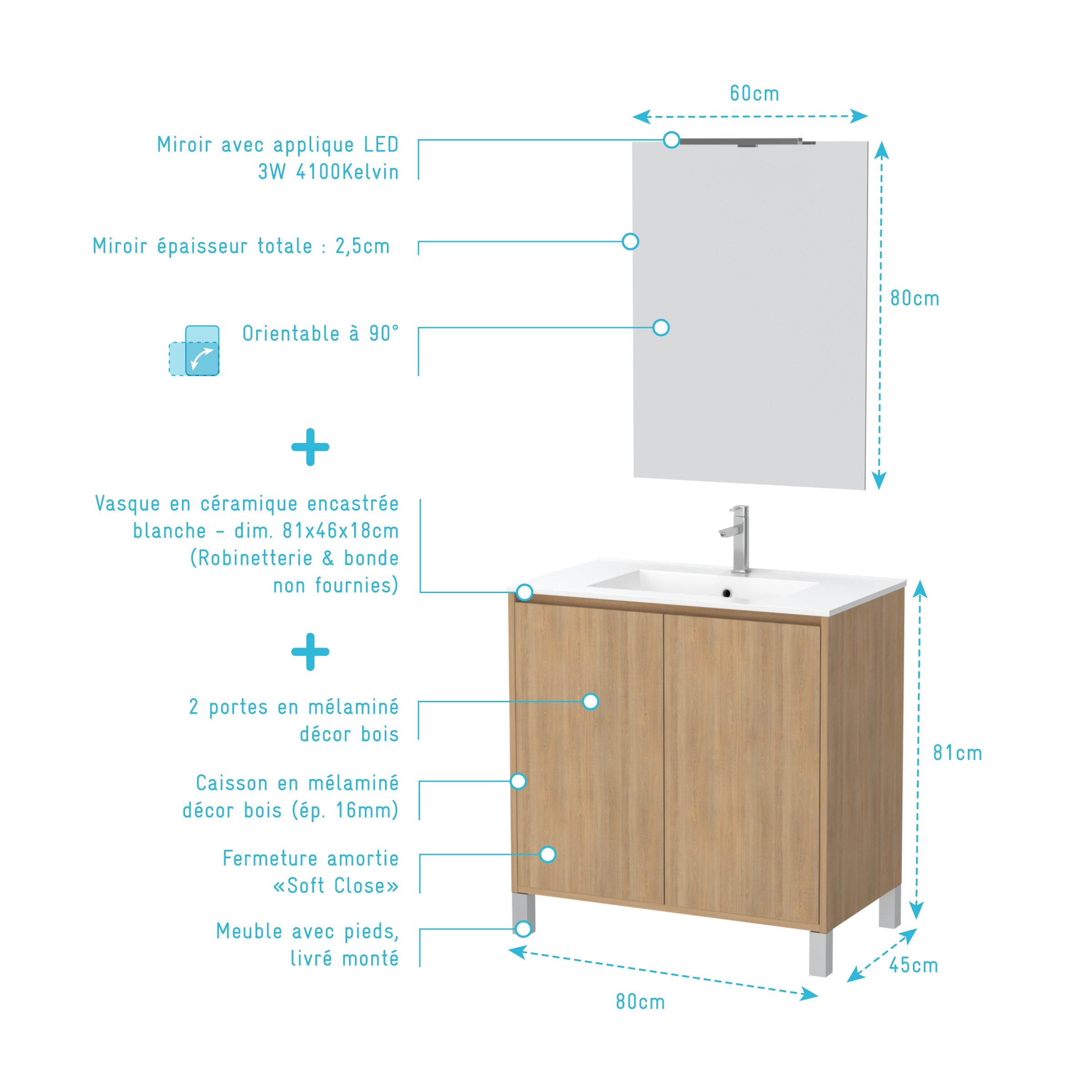 Pack Meuble Salle de Bains 80cm Chêne Clair 2 Portes, Vasque, Miroir 60×80 et réglette Led – XENOS