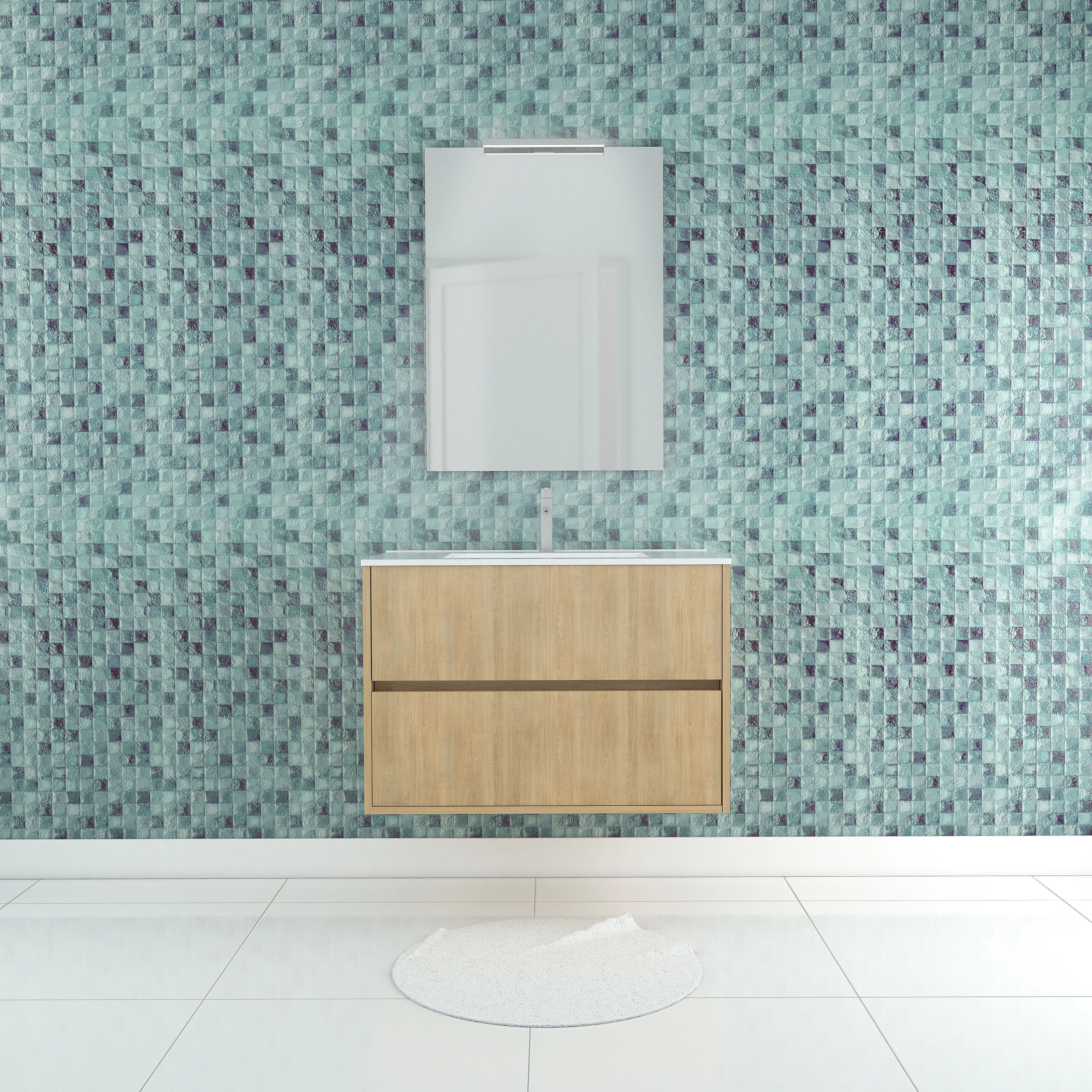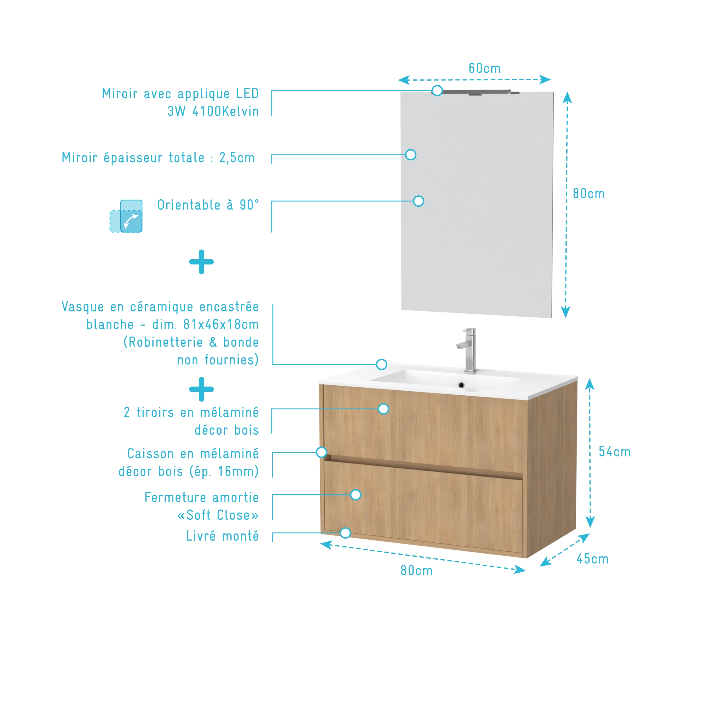 Pack Meuble Salle de Bains 80cm Chêne Clair 2 Tiroirs, Vasque, Miroir 60×80 et réglette Led – XENOS