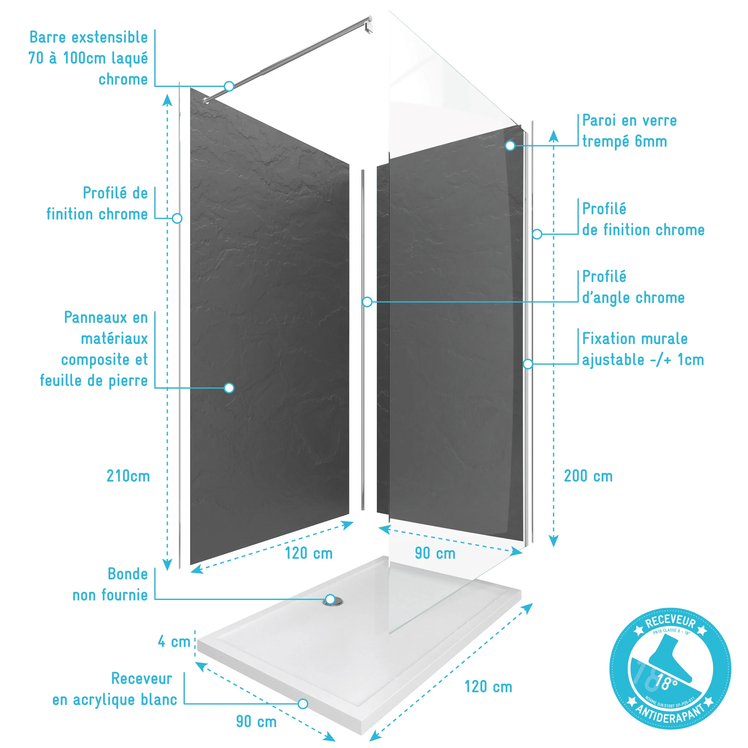 Pack Panneau muraux 120x210 + paroi 120x210 + receveur 90x120 + barre de fixation Chrome 70/100cm