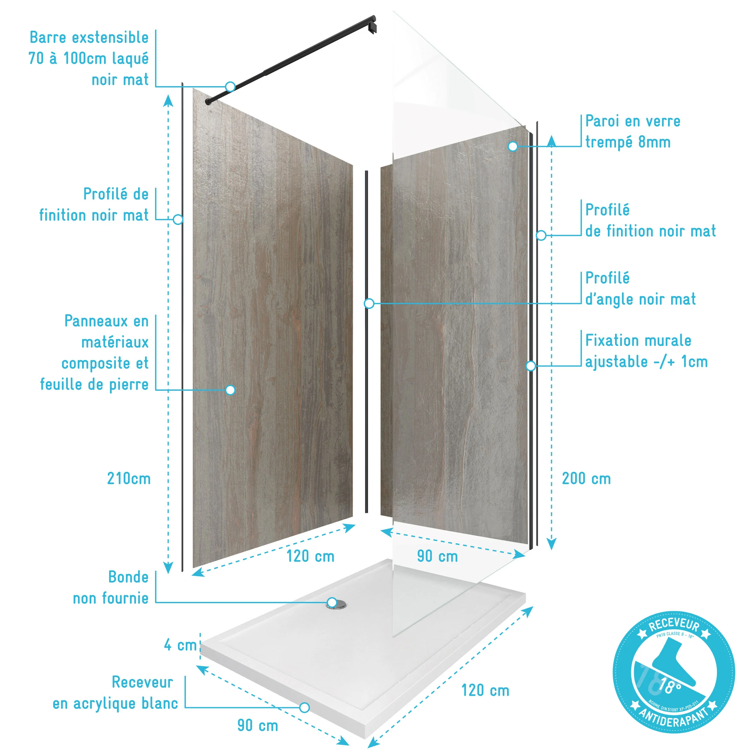 Pack Panneau muraux 120×210 + paroi 120×210 + receveur 90×120 + barre de fixation noir mat 70/100cm