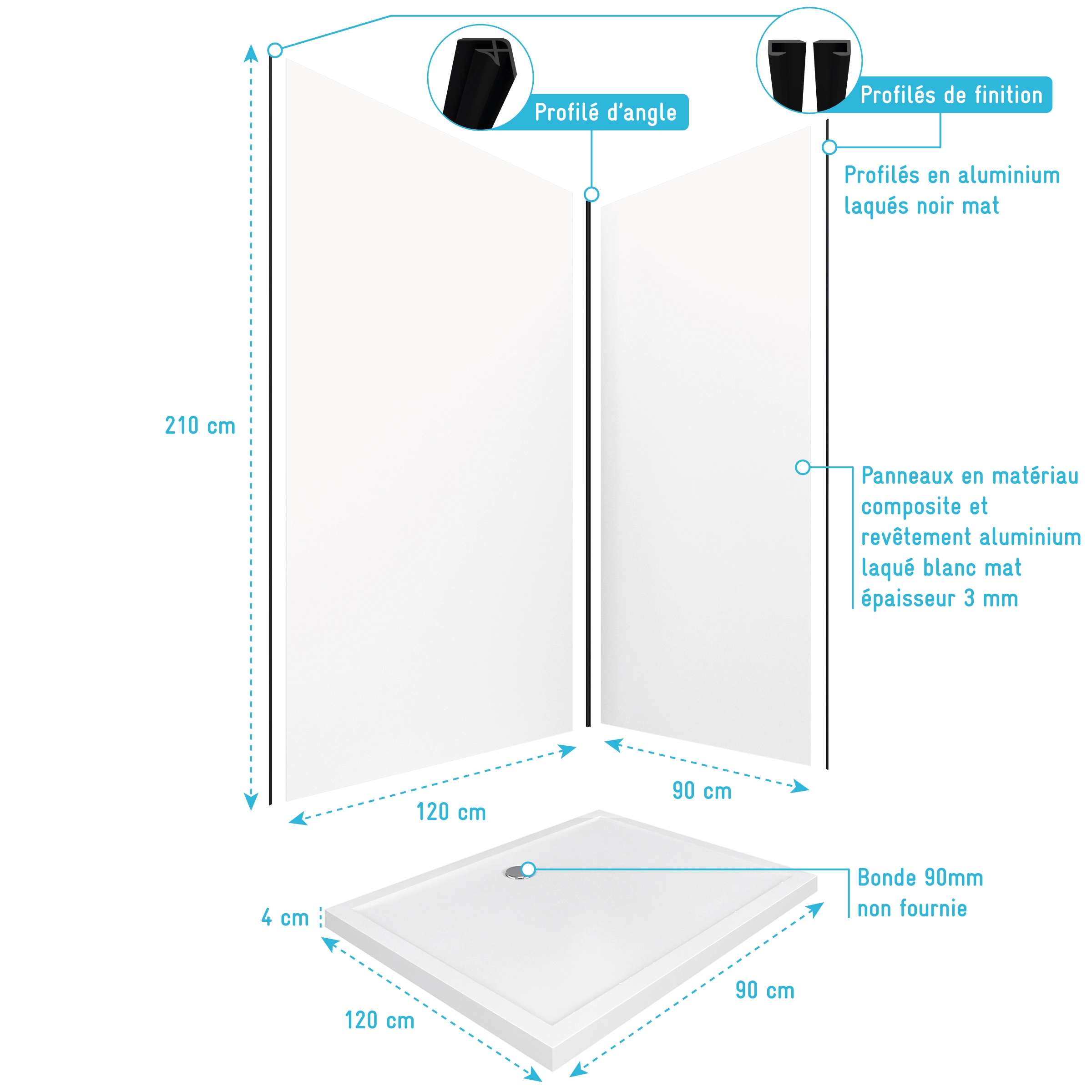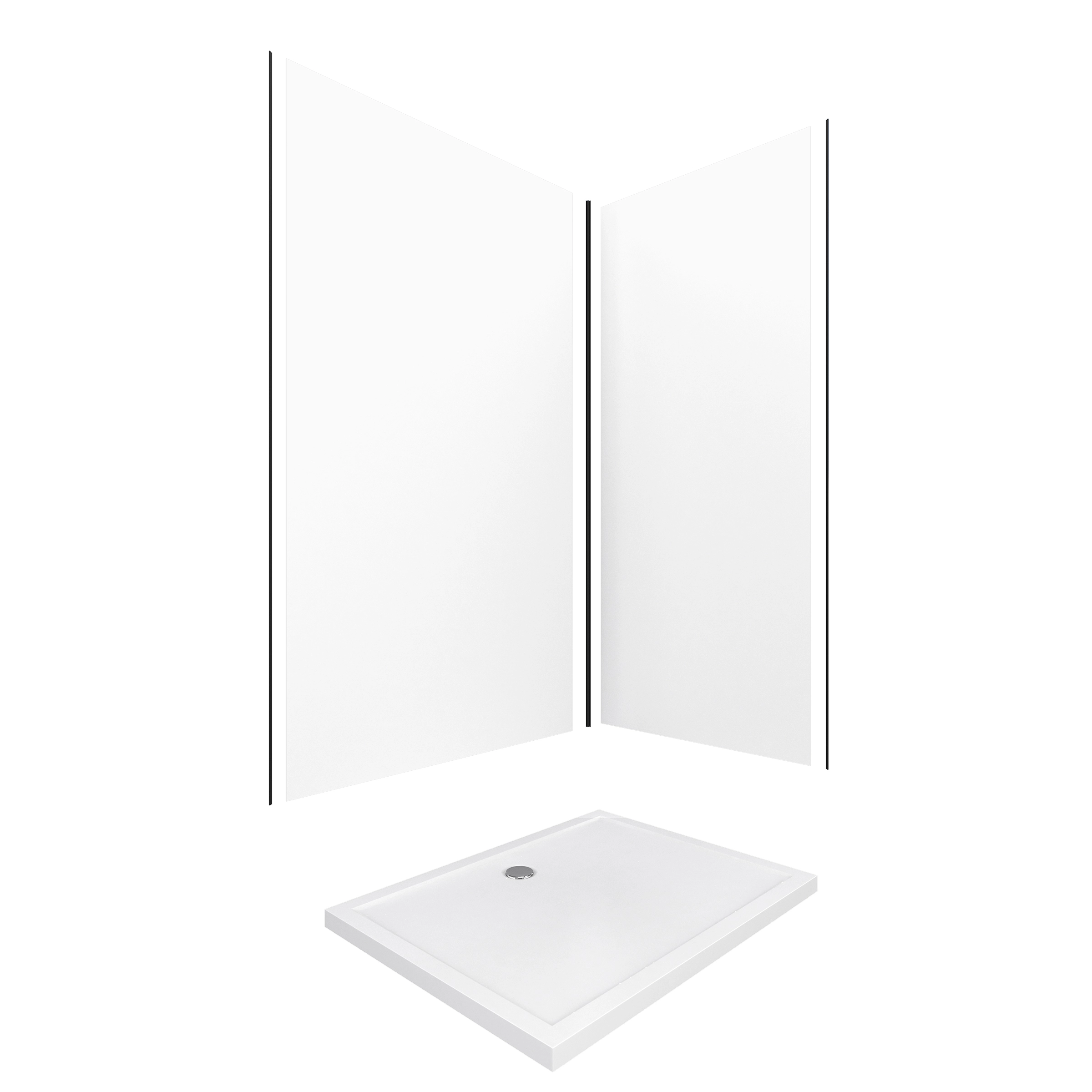 Transformez votre salle de bains en quelques heures grâce à ce pack complet comprenant 2 panneaux muraux en aluminium blanc de 120 + 90 x 210 cm, de profilés noirs et d’un receveur de douche de qualité.