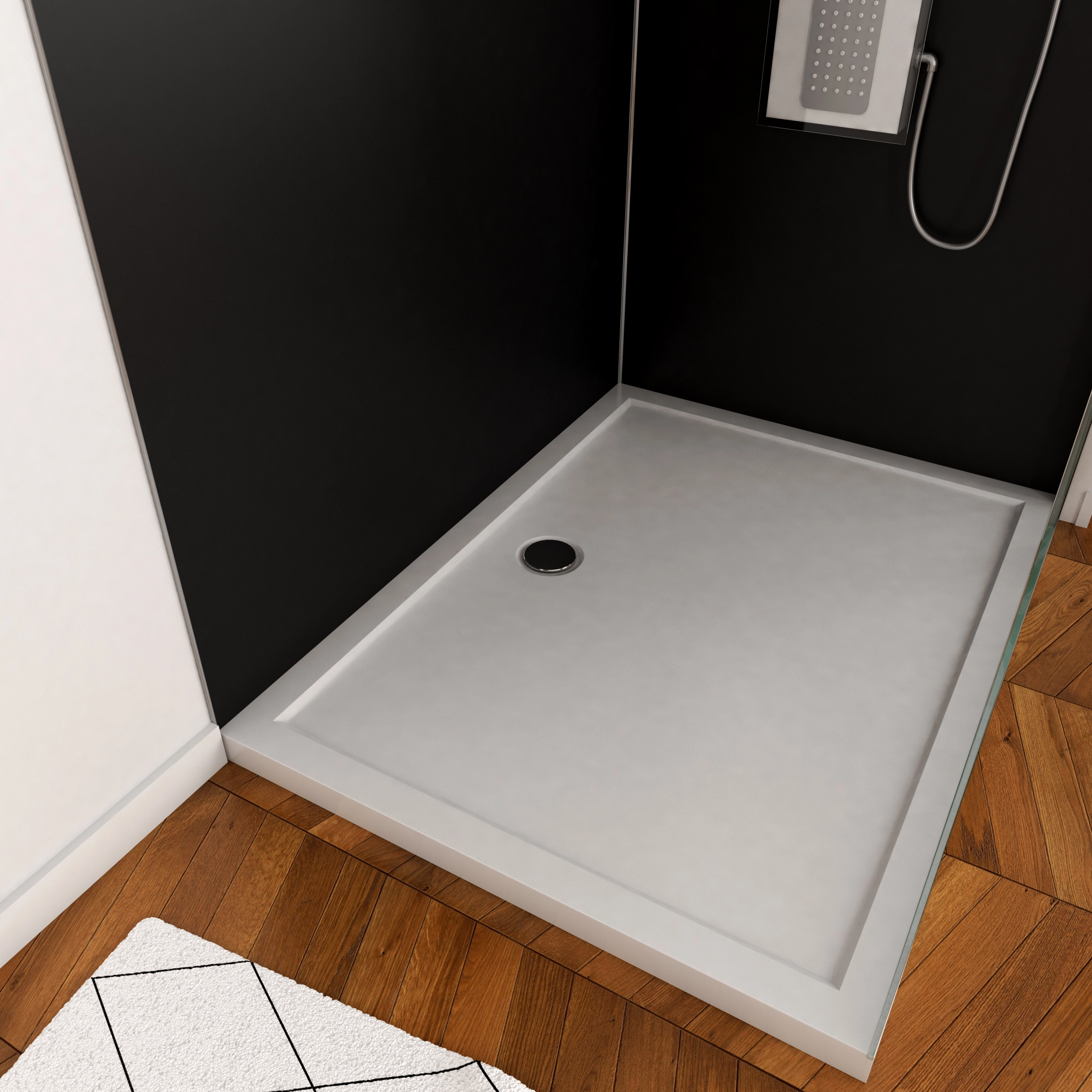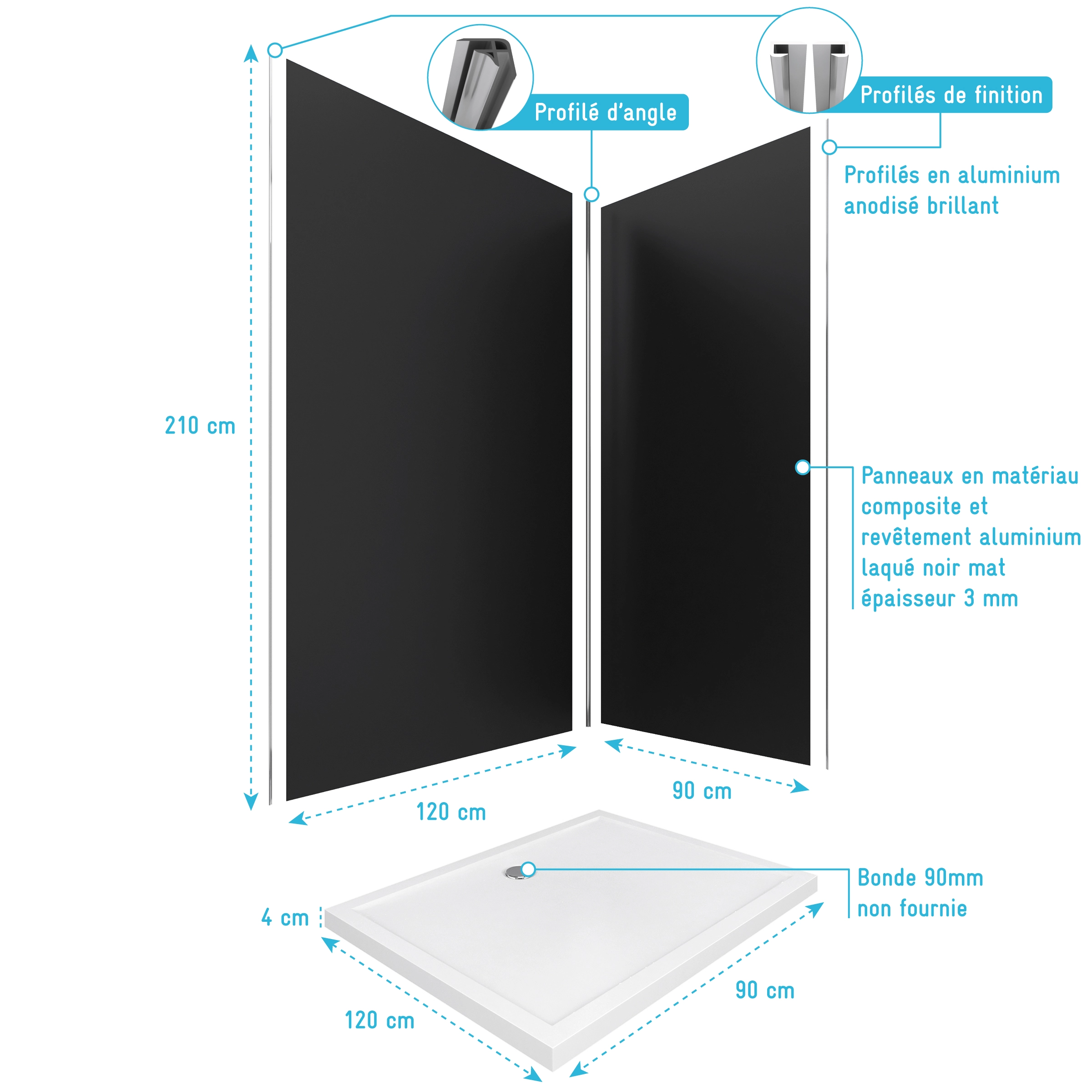 Transformez votre salle de bains en quelques heures grâce à ce pack complet comprenant 2 panneaux muraux en aluminium noir de 120 + 90 x 210 cm, de profilés chromes et d’un receveur de douche de qualité.