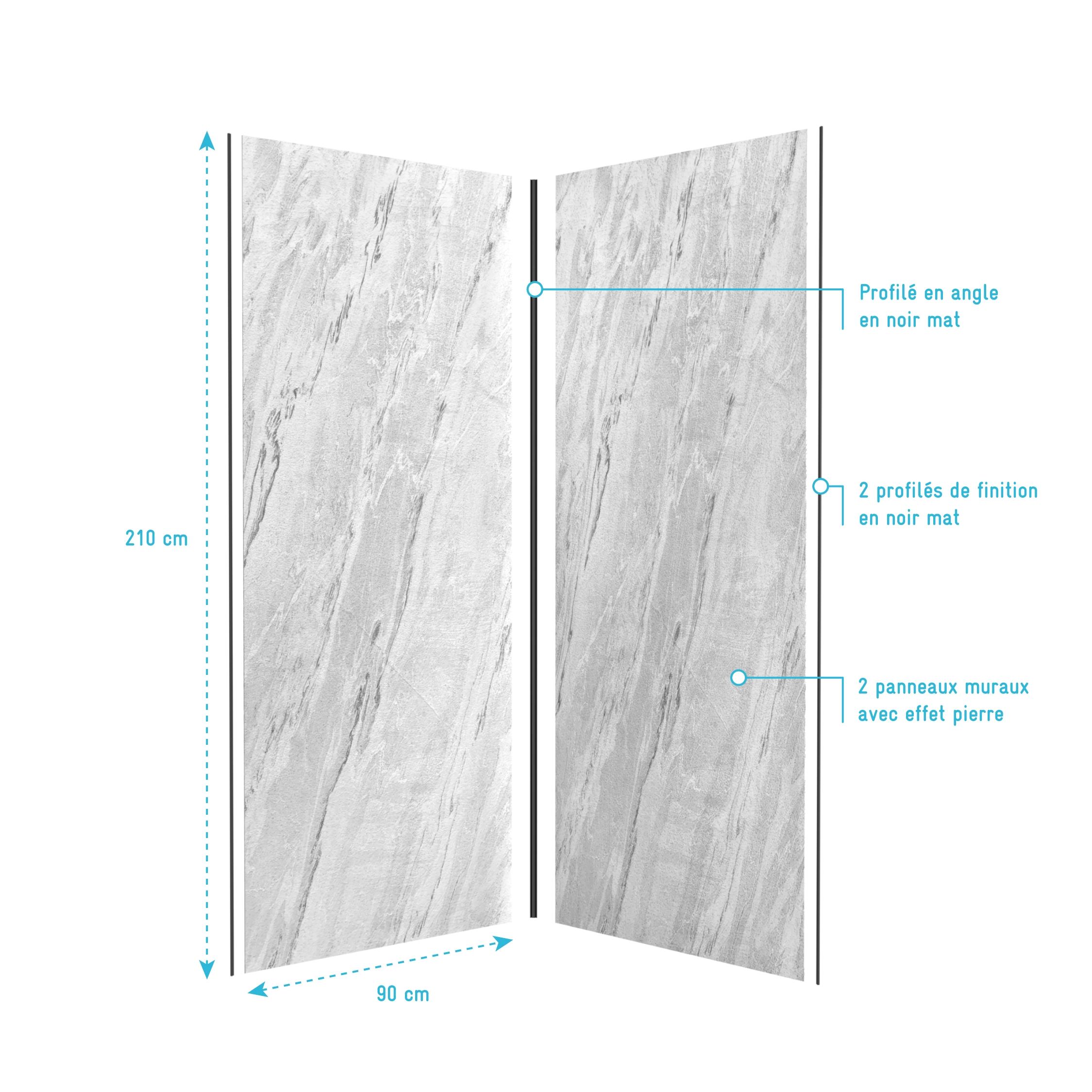 • Pack de 2 Panneaux Muraux Pierre Artic Storm 90+90x210 cm avec Profilés NOIR MAT - STONE'IT