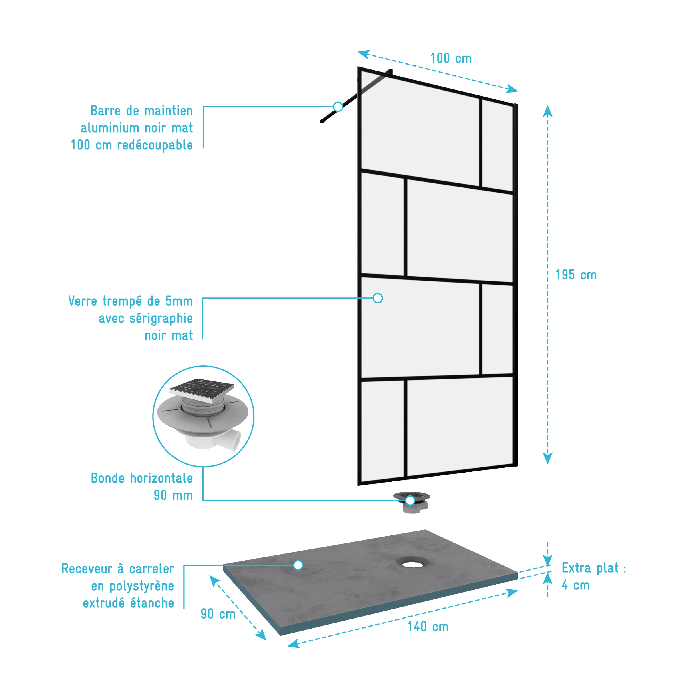 Pack Paroi de douche 100×195 cm + RECEVEUR A CARRELER DECOUPABLE 90X140 – BONDE HORIZONATLE