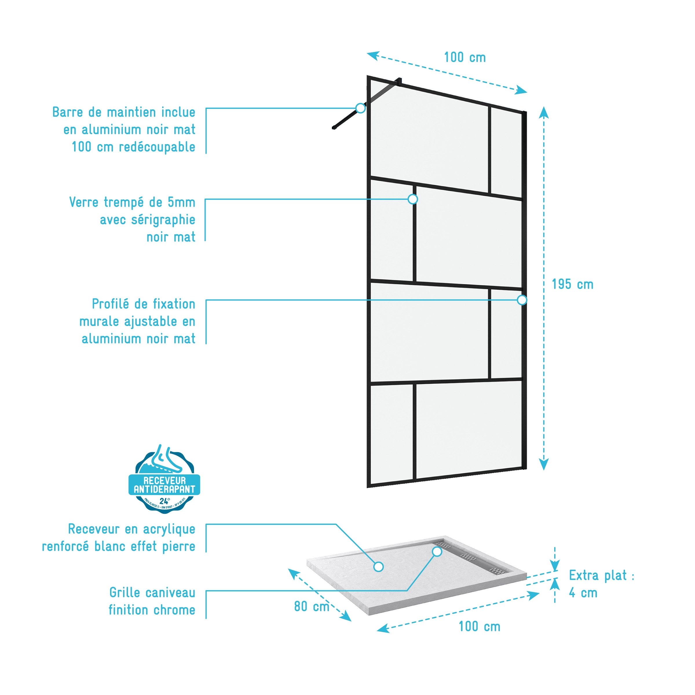 Pack Paroi de douche 100×195 cm + RECEVEUR EN ACRYLIQUE BLANC EFFET PIERRE 100X80