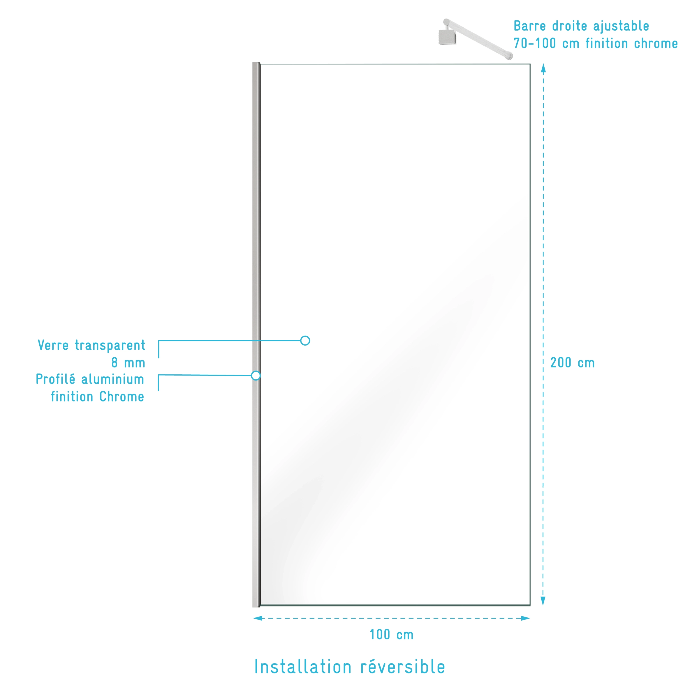 Paroi de Douche 100x200cm Verre Transparent – Barre de Fixation Extensible et Profil Chrome