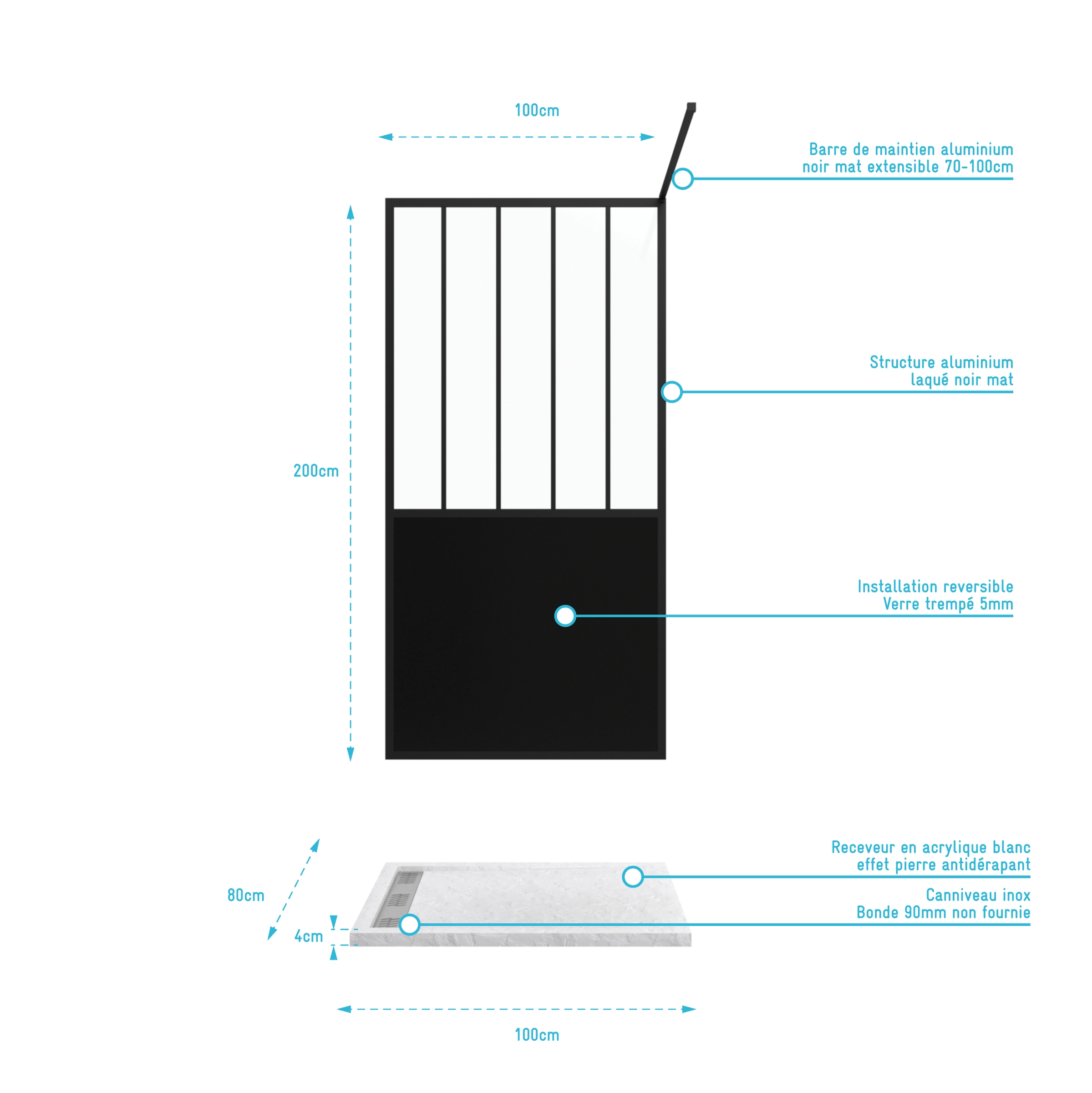 Ensemble douche à l’italienne avec Receveur blanc caniveau 80×100 + paroi atelier 100cm