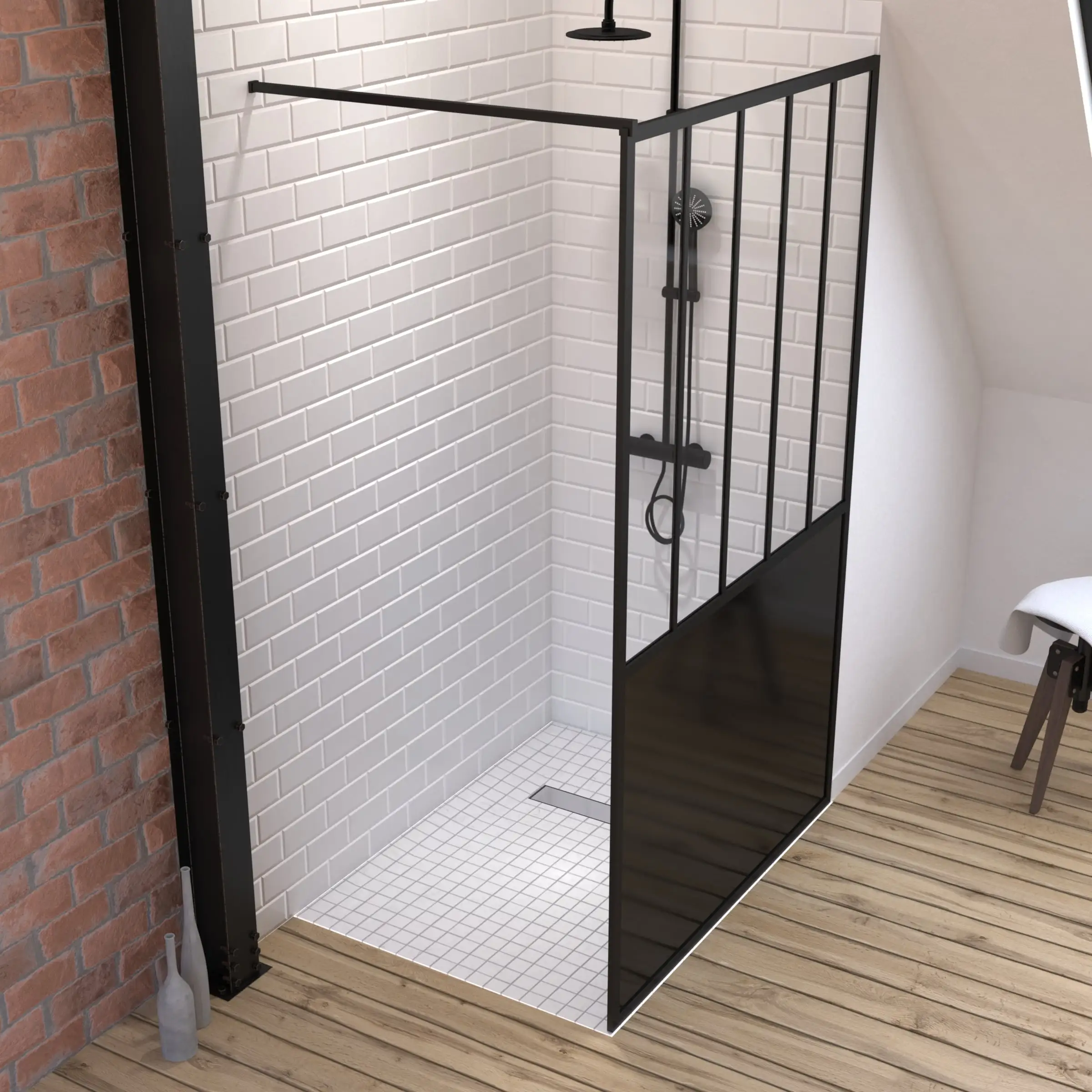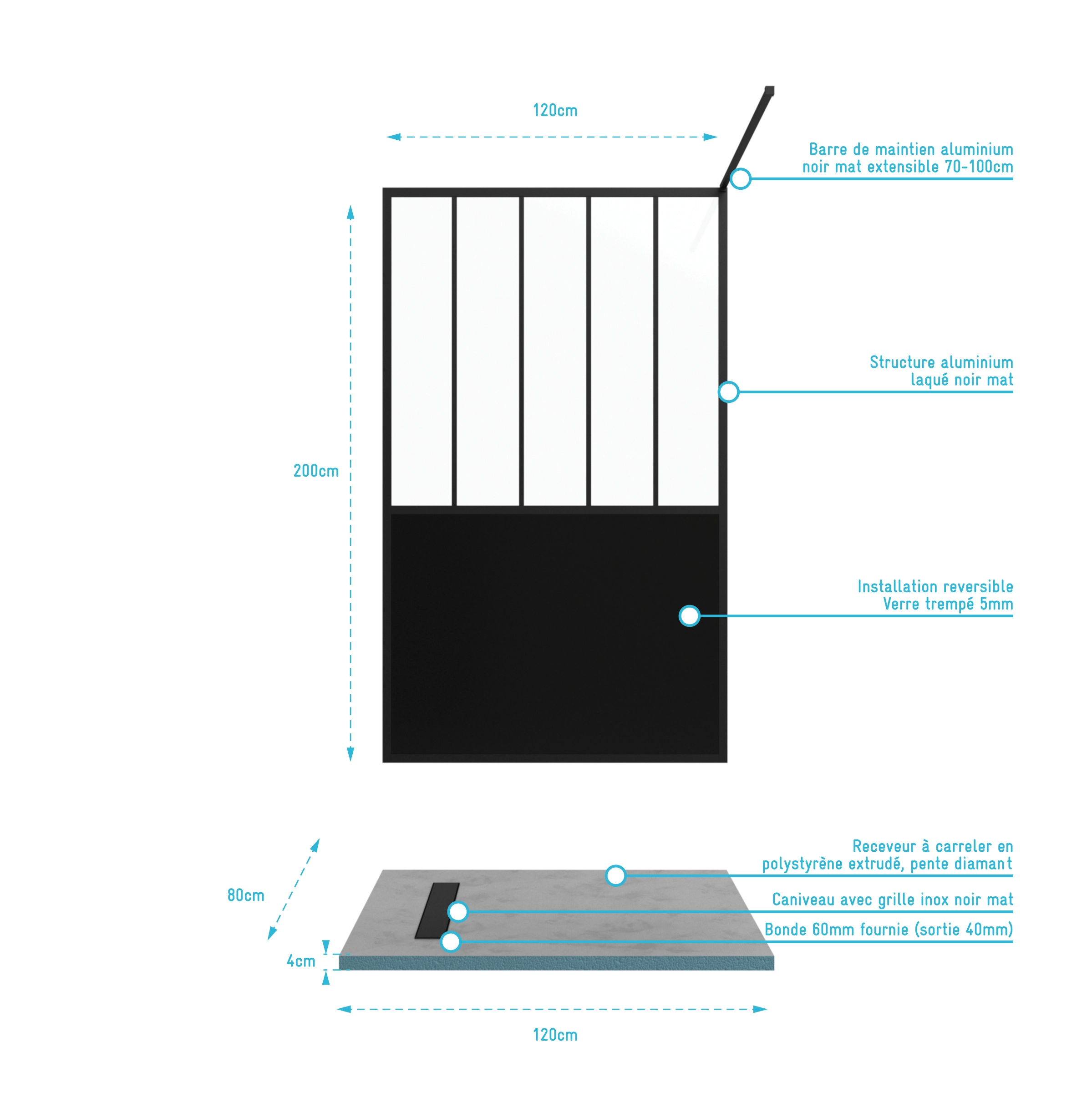 Pack Paroi de douche 120×200 cm noir mat + RECEVEUR DE DOUCHE A CARRELER 80x120CM RECOUPABLE