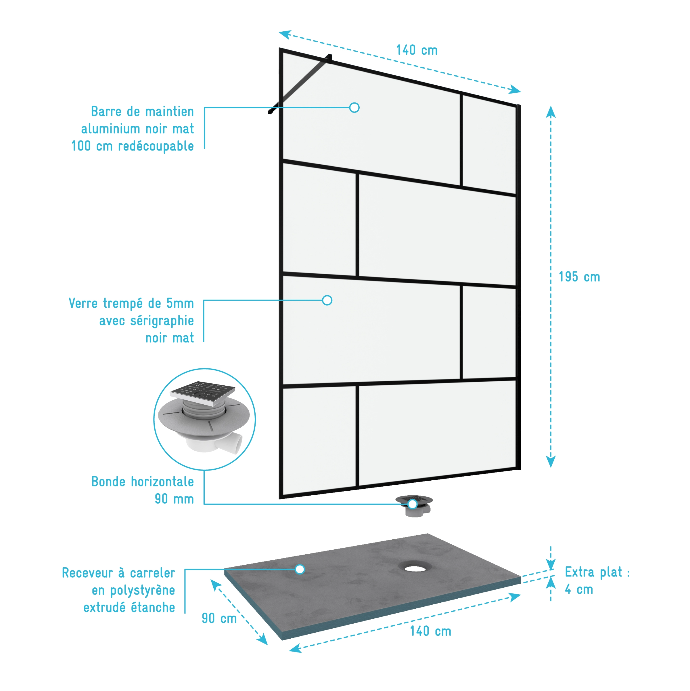 Pack Paroi de douche 140×195 cm + RECEVEUR DE DOUCHE A CARRELER 90×140 RECOUPABLE
