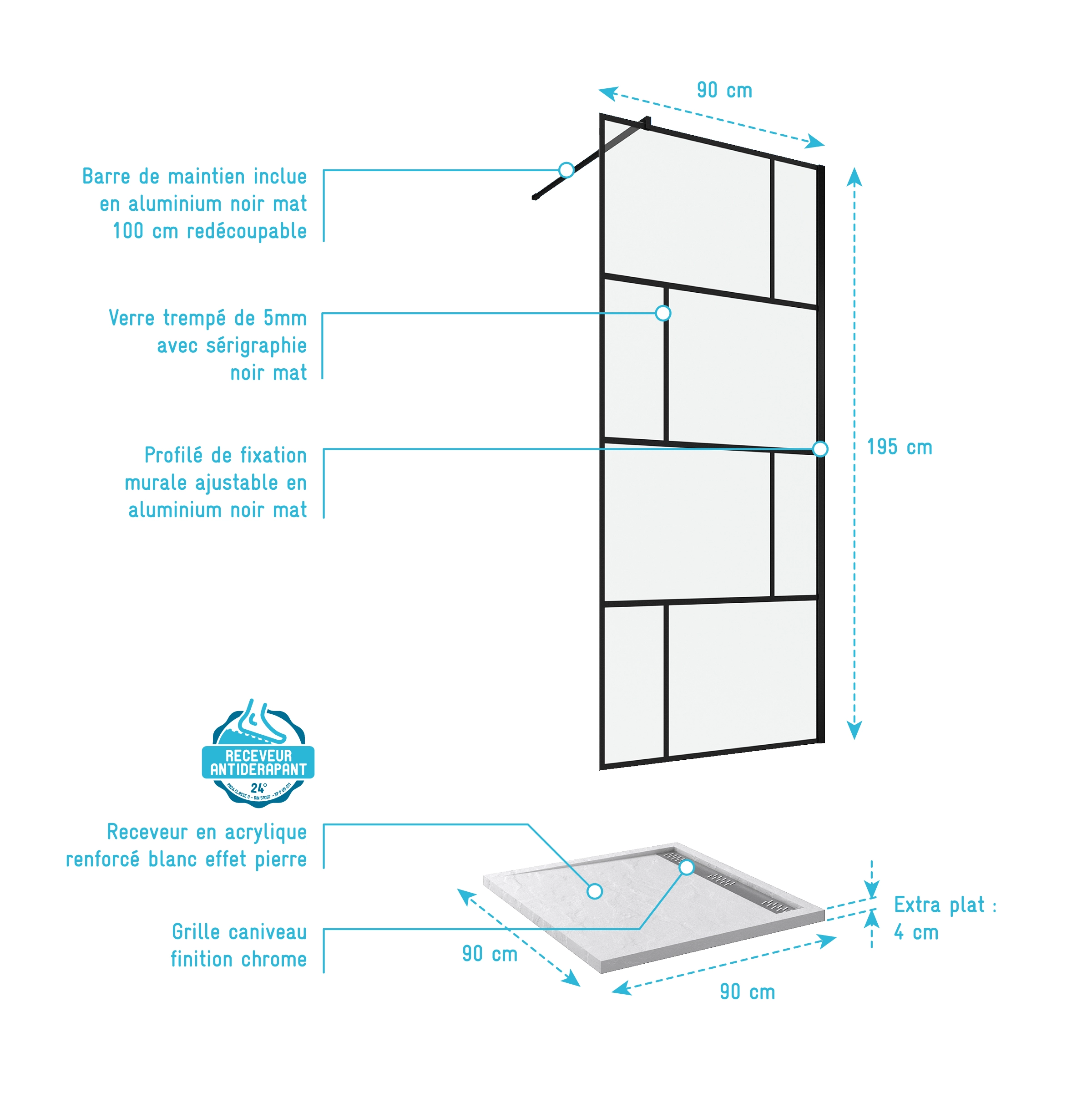 Pack Paroi de douche 90×195 cm + RECEVEUR EN ACRYLIQUE BLANC EFFET PIERRE 90X90