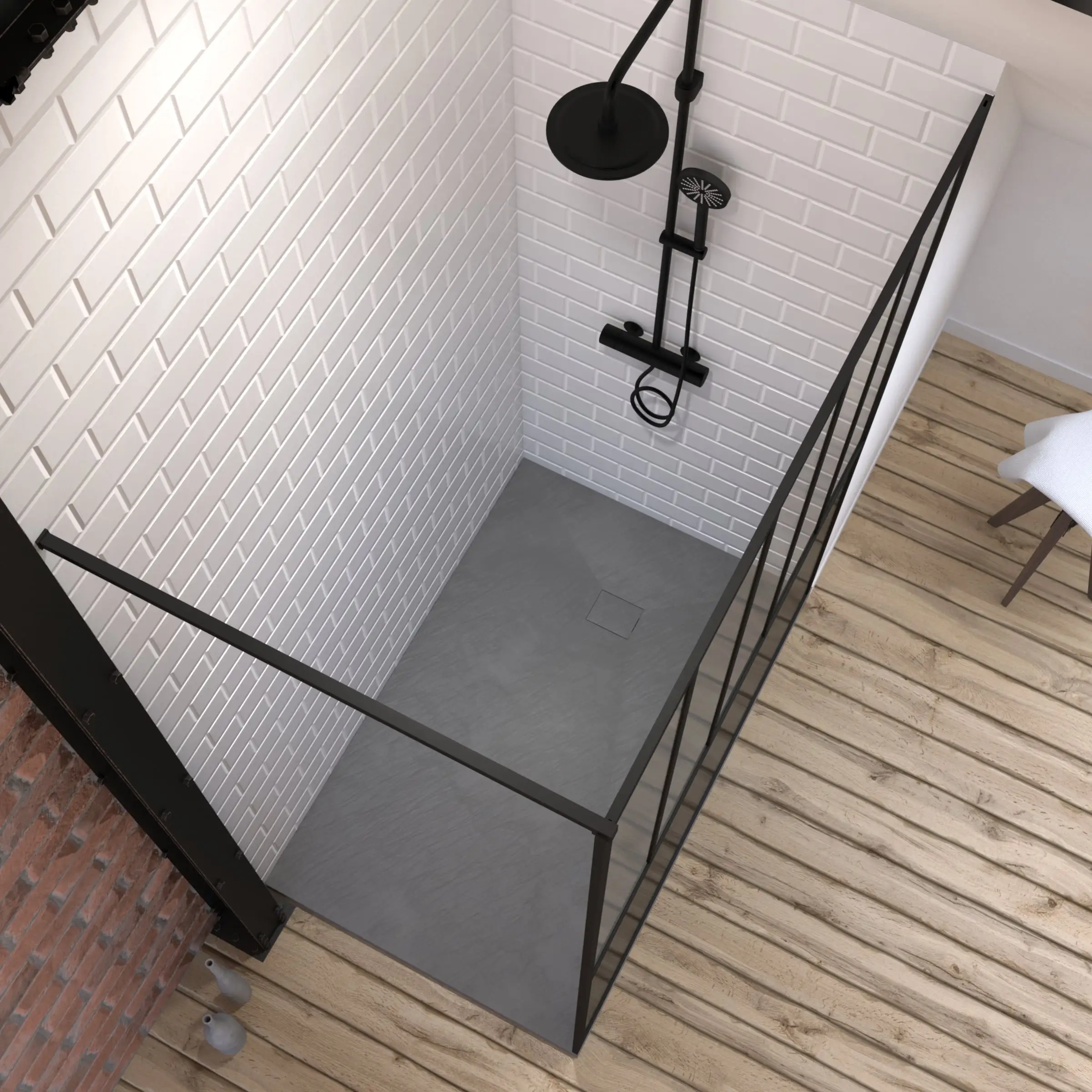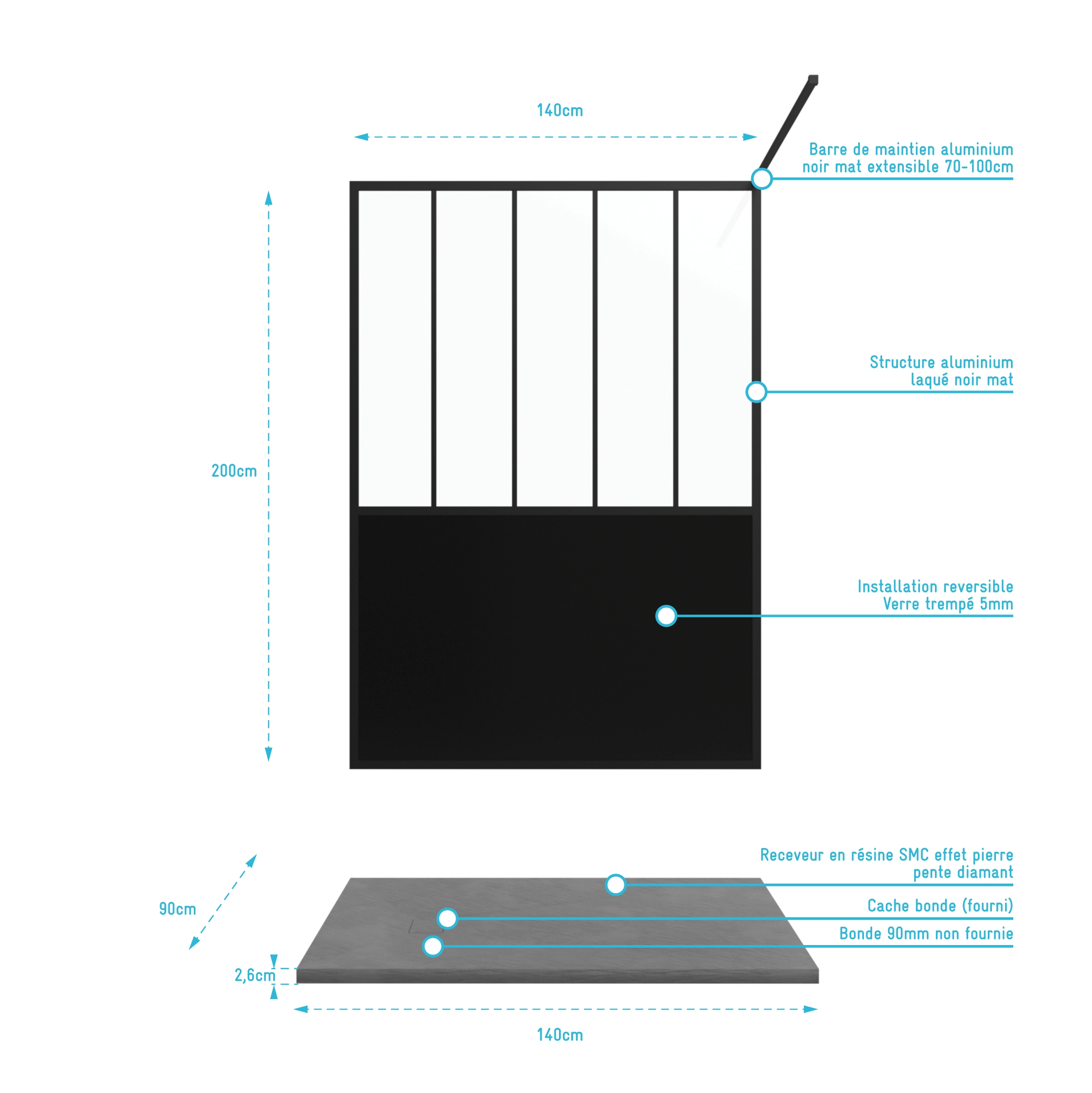 Pack Paroi de douche 90x195 cm + Receveur Noir effet pierre 140x90 cm