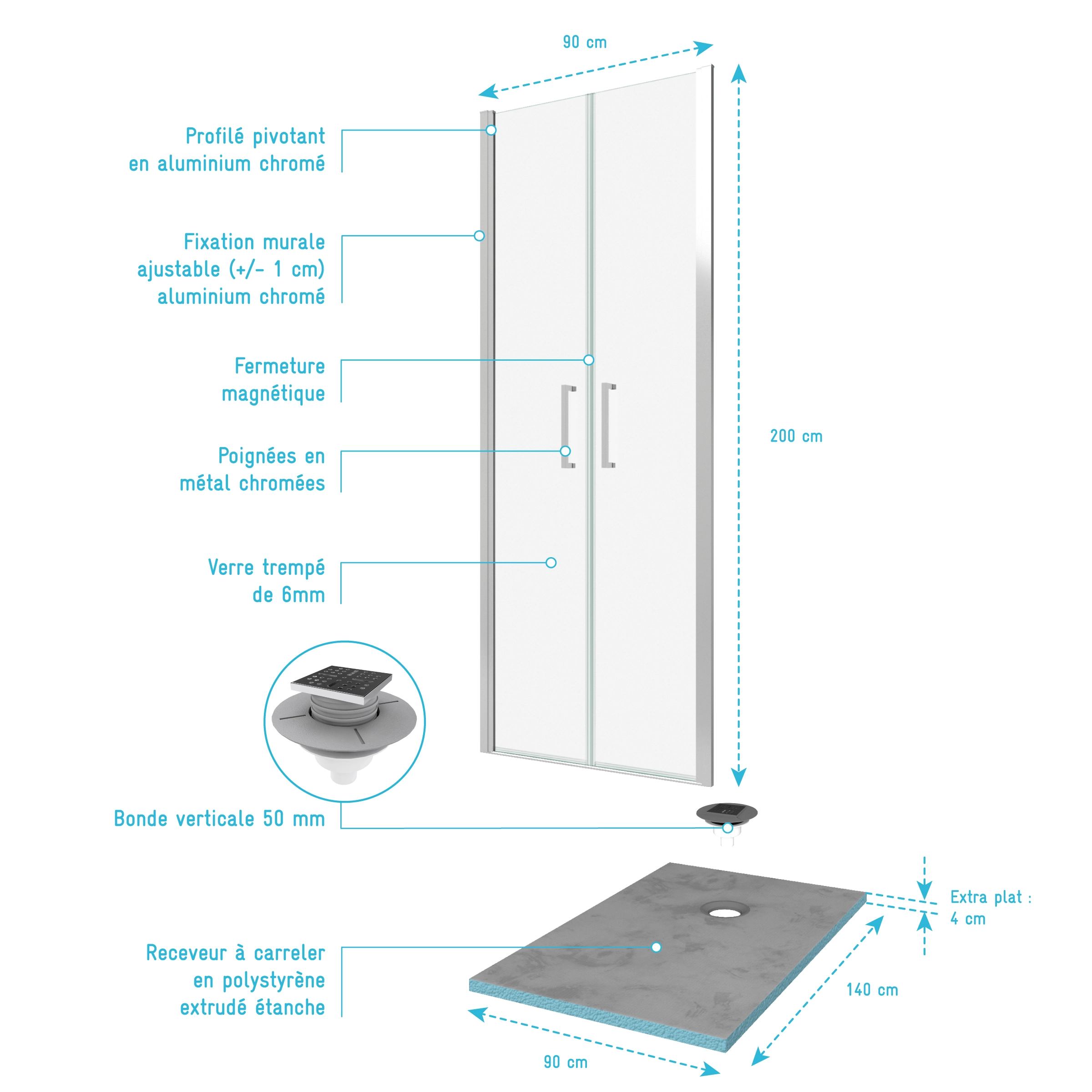Pack Paroi de douche 90×200 cm + RECEVEUR DE DOUCHE A CARRELER 90×140 RECOUPABLE
