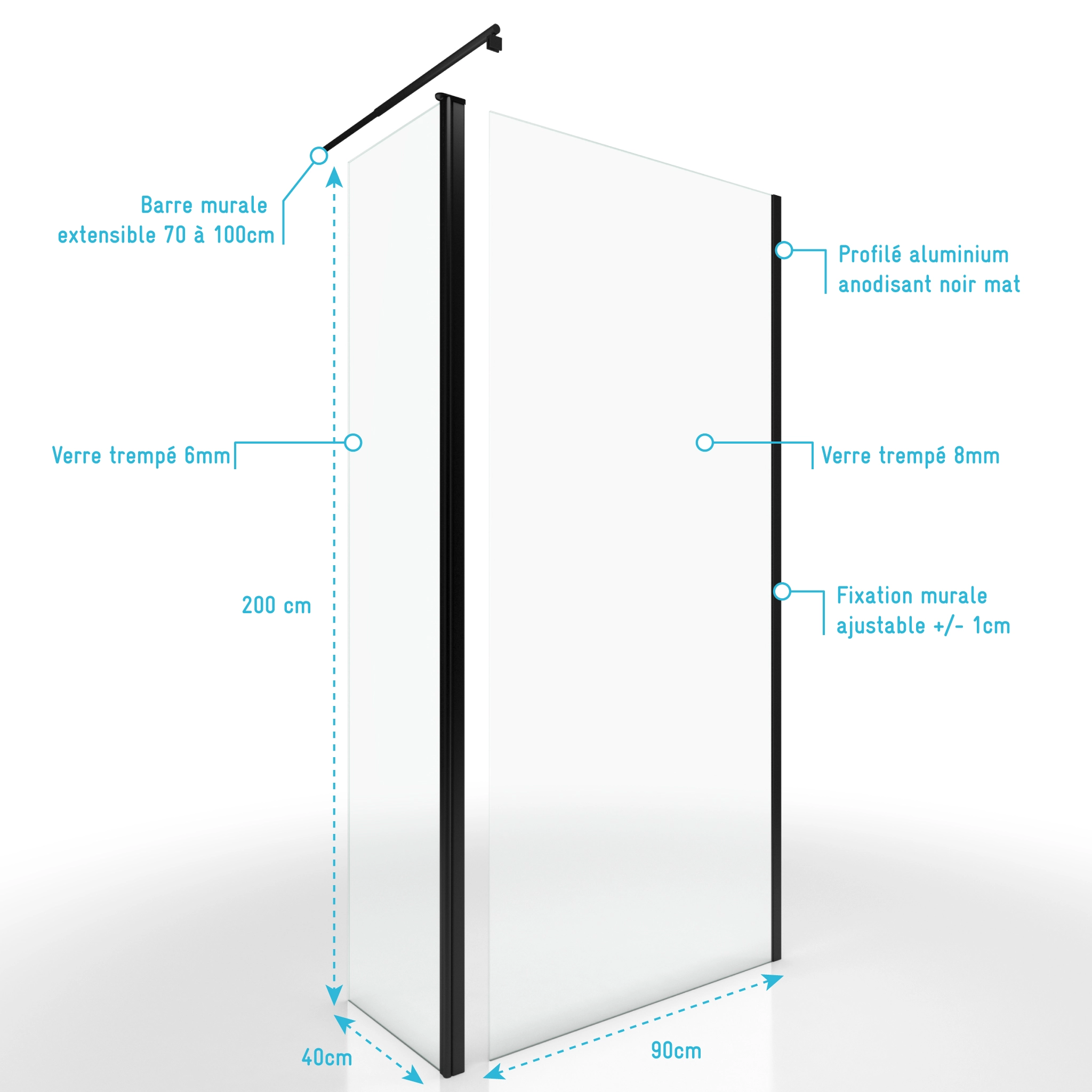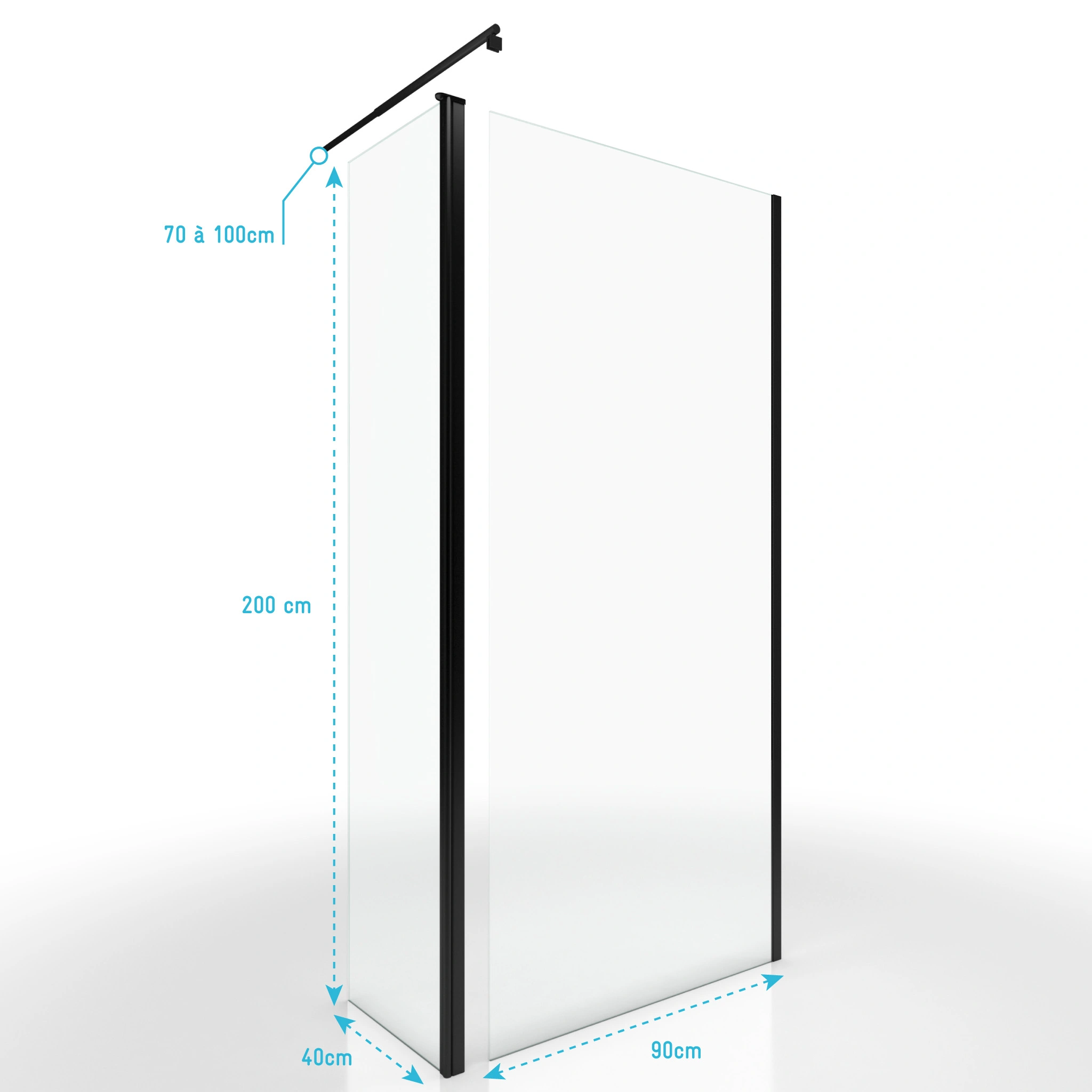 Pack paroi de douche à l’italienne 90x200cm et volet pivotant 40×200 cm en verre transparent. Profilé et barre de fixation murale extensible finition noire.