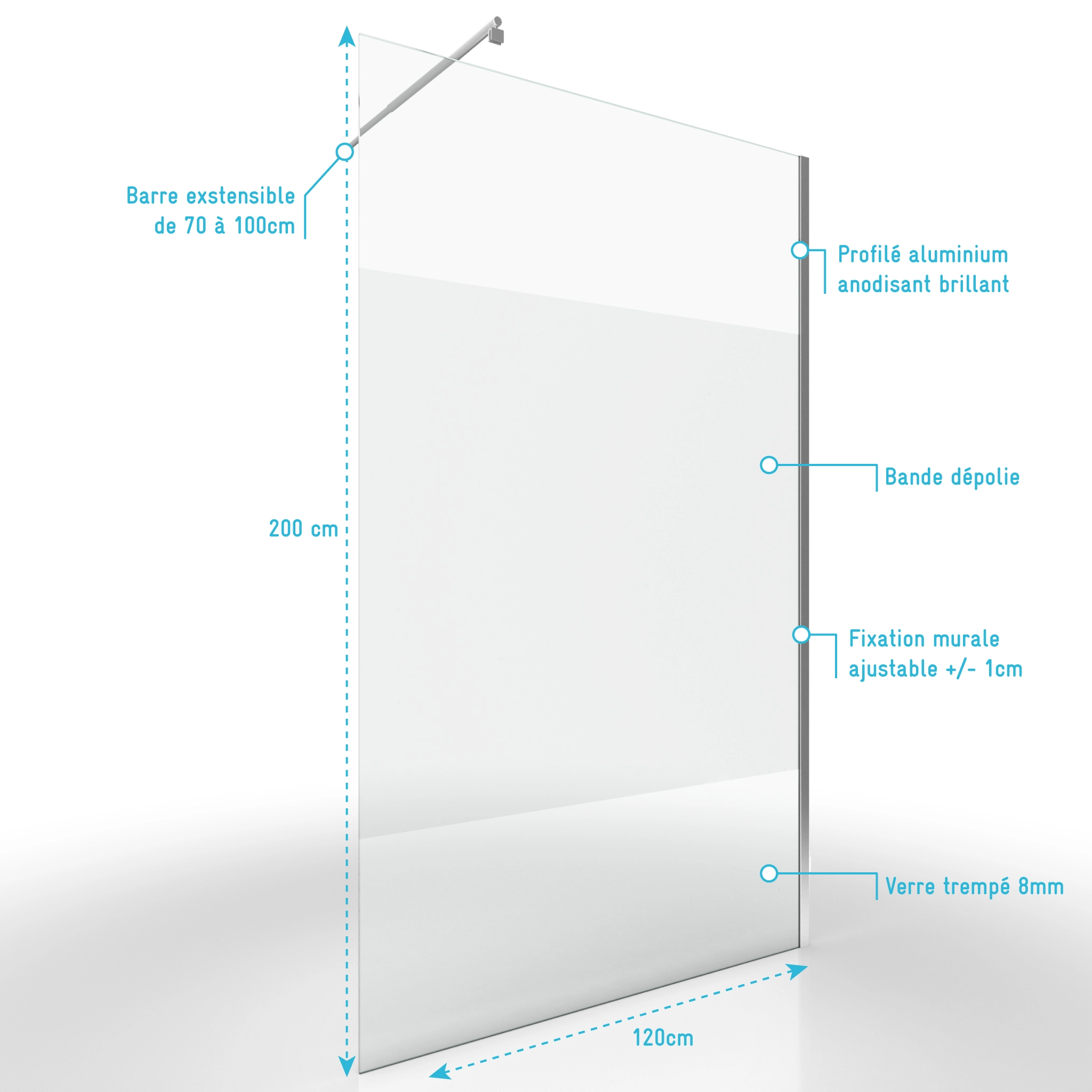 Paroi de Douche Dépolie 120x200cm + Barre de fixation extensible – Verre 8mm – Finition Chrome