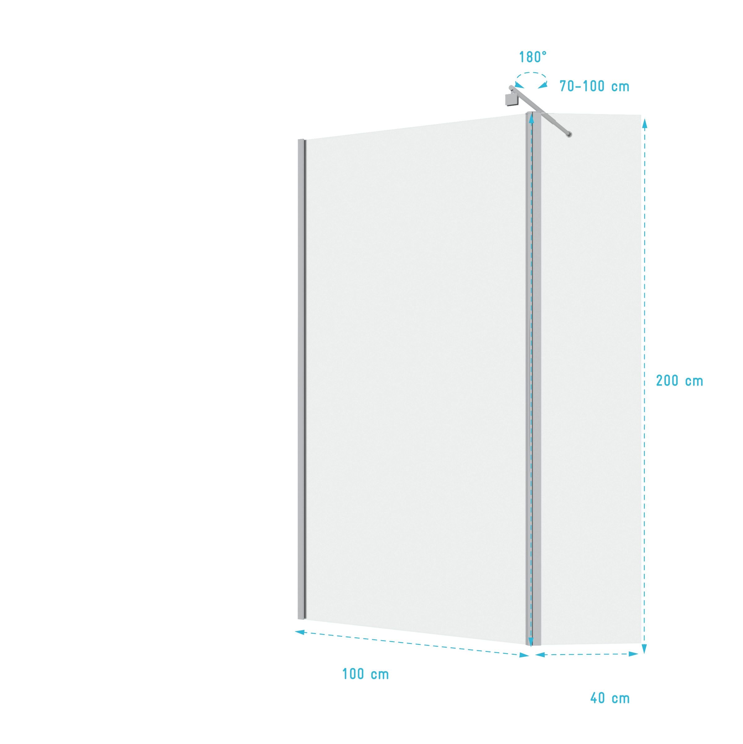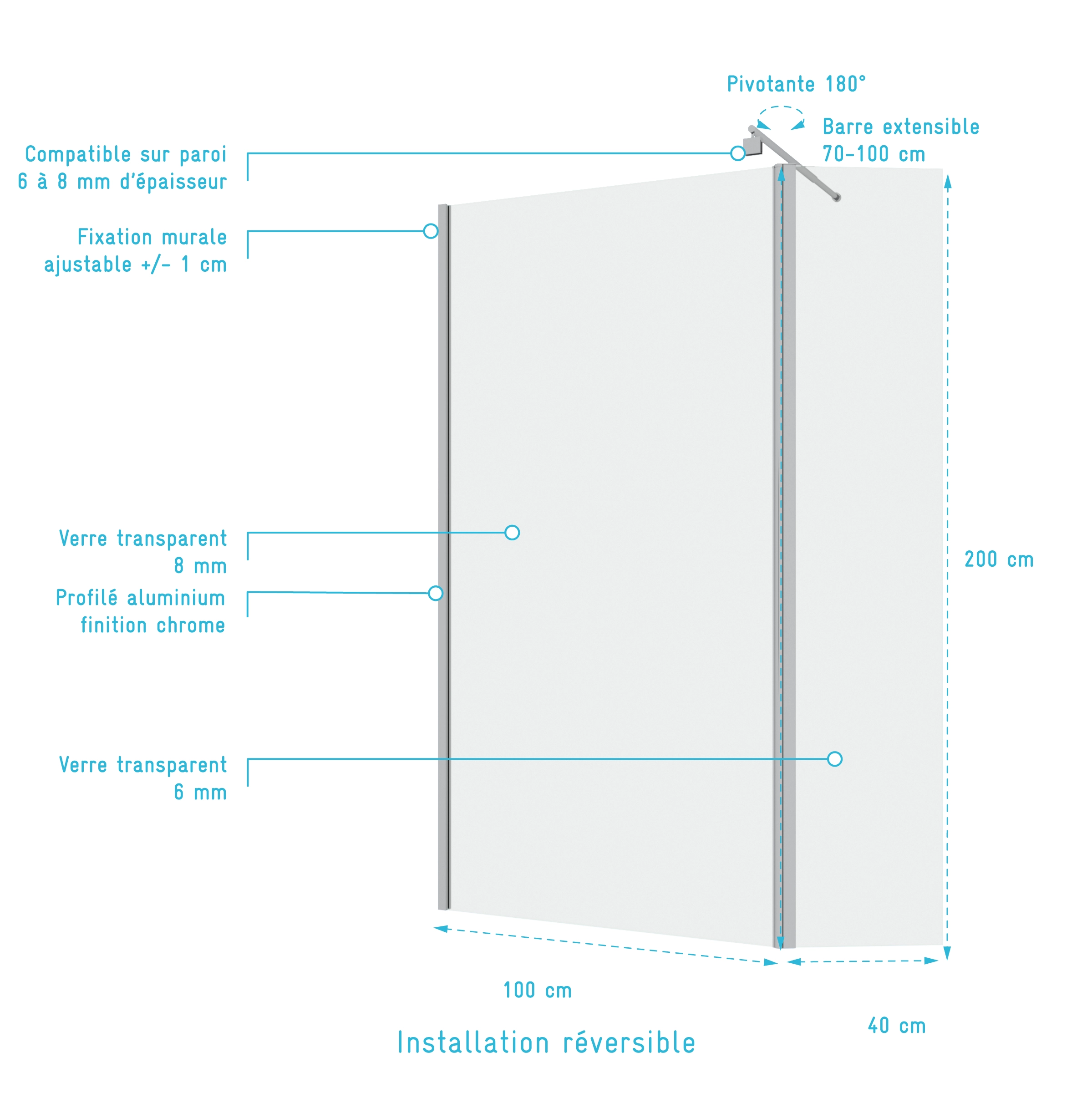 Pack paroi de douche à l’italienne 100x200cm et volet pivotant 40×200 cm en verre transparent. Profilé et barre de fixation murale extensible finition chrome.