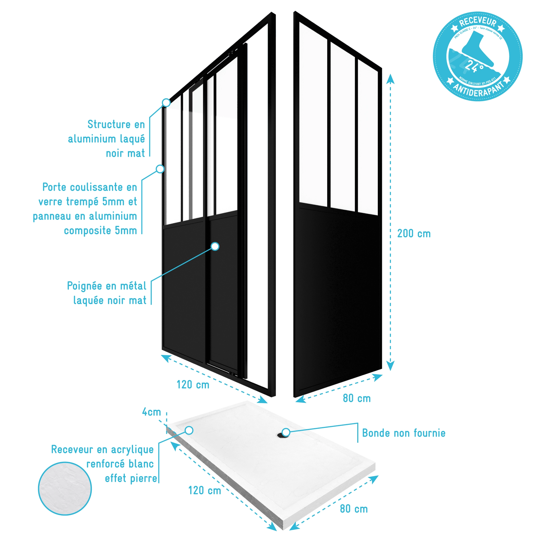 Pack Paroi porte de douche coulissante + retour 80 cm type atelier + receveur blanc 120×200 cm