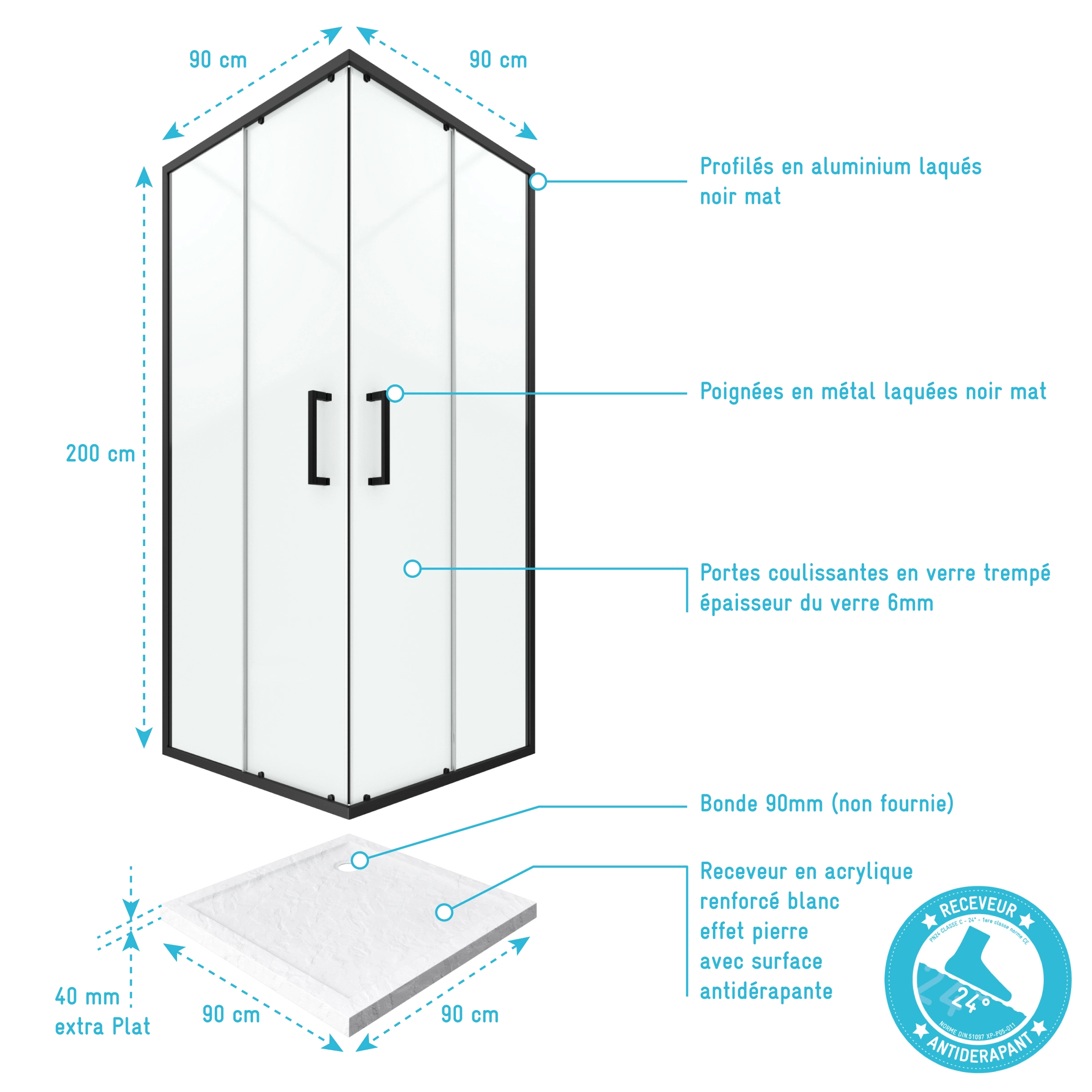 PACK PAROI PORTE DE DOUCHE D’ANGLE+ RECEVEUR A POSER-90×90 OUVERTURE EN ANGLE-CRUSH MOON ANGLE 90×90